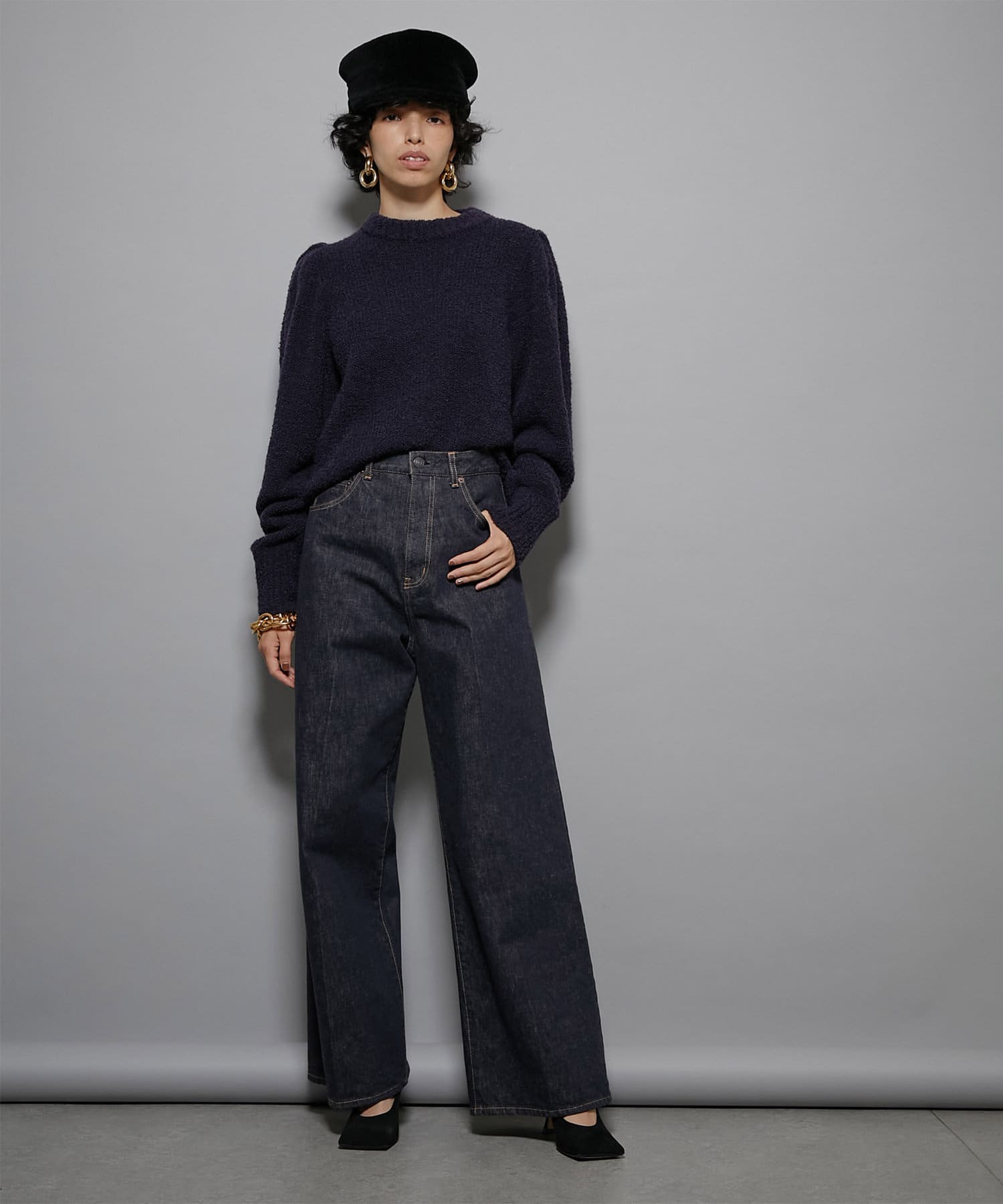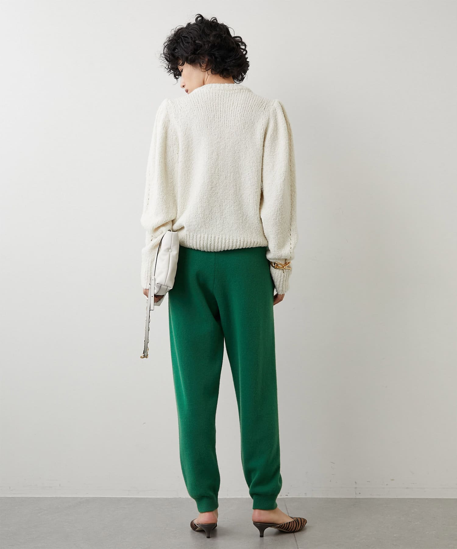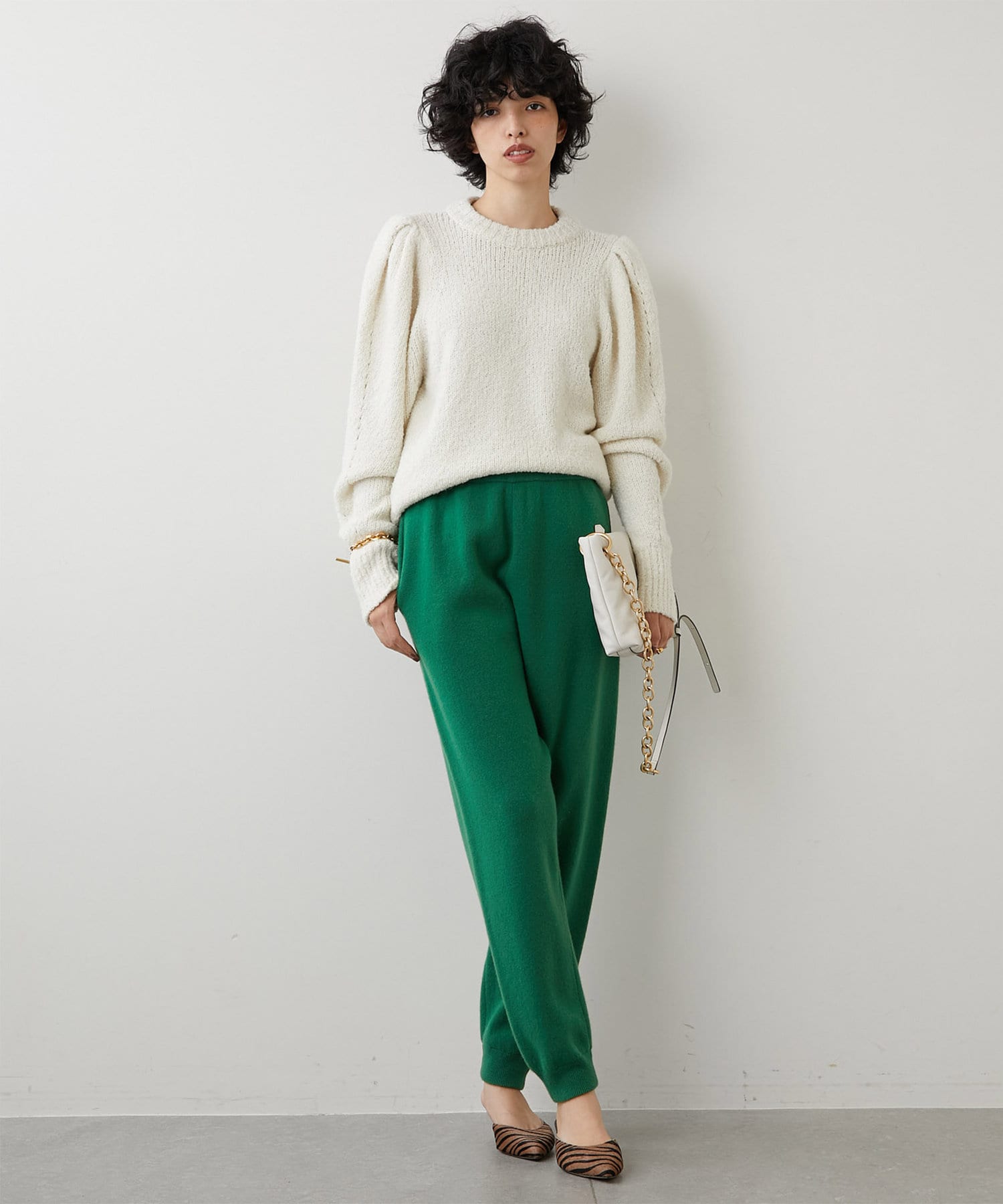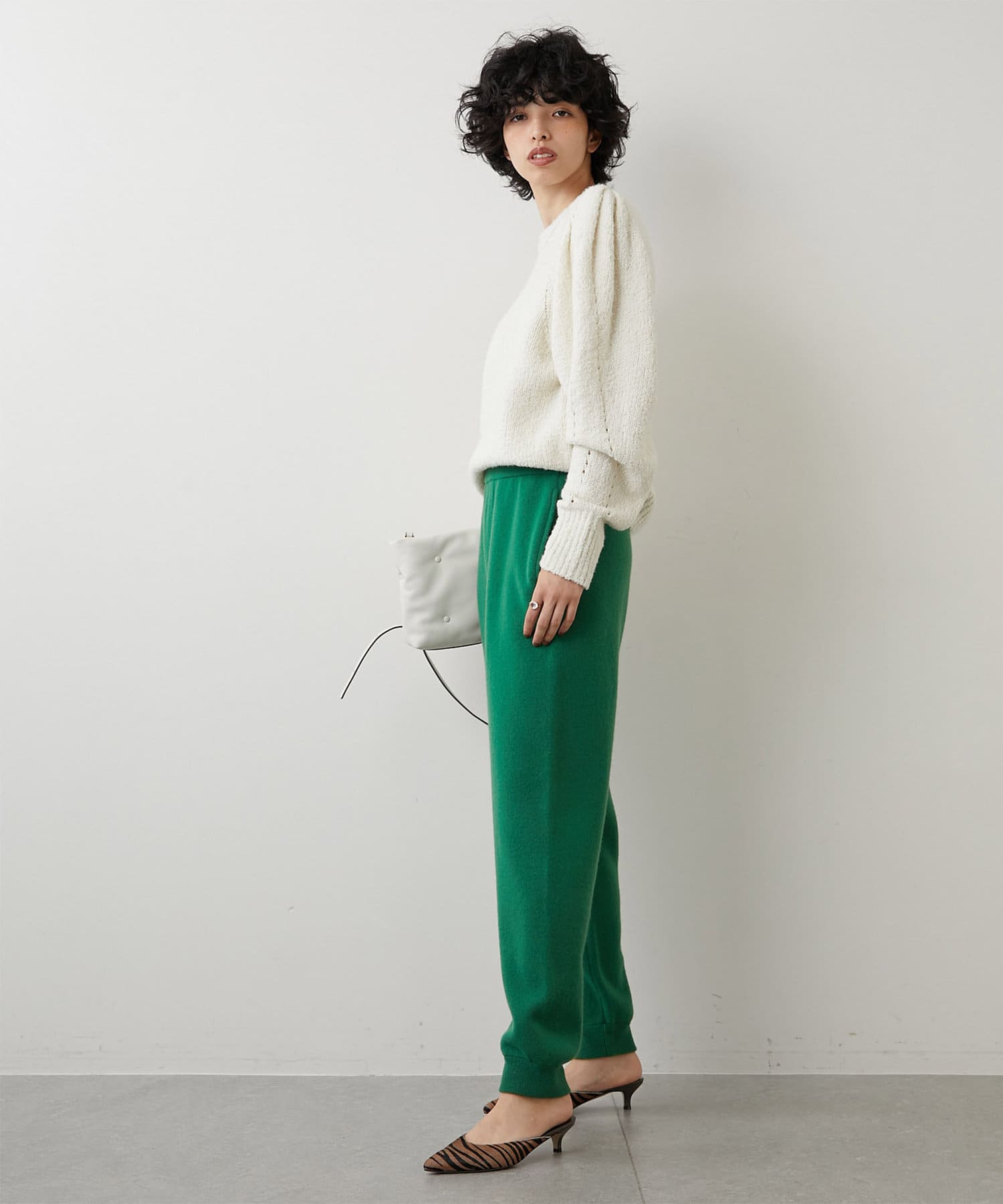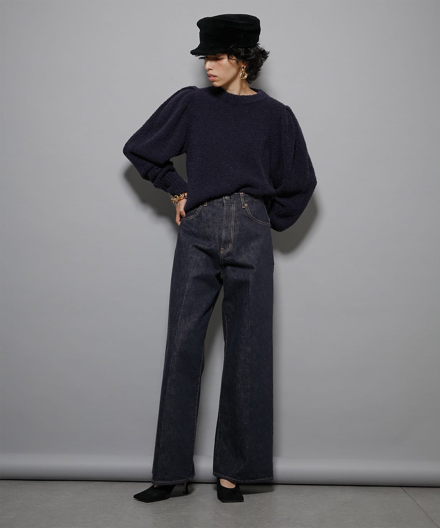 大胆にタックを入れた袖付けで独特のフォルムを表現しつつ、ニット素材ならではの風合いが程よくボリュームと甘さを抑えて、大人の女性らしさを演出してくれます。
