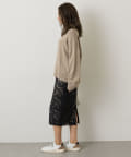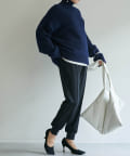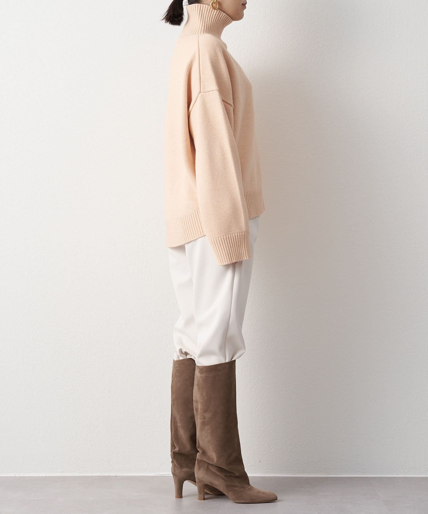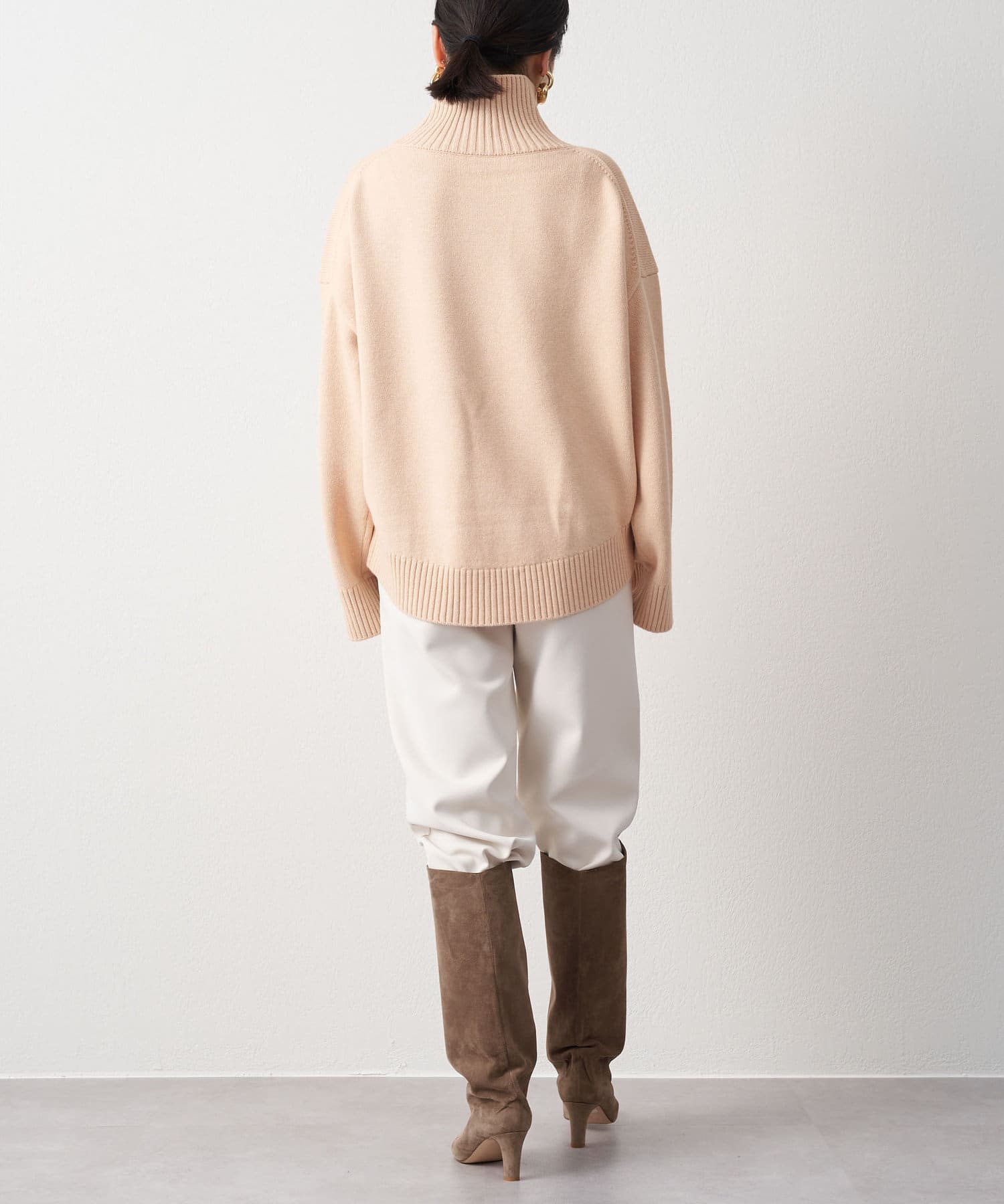 ショルダーラインを落としたゆったりとしたワイドシルエットが程よい抜け感をプラスしつつ、長めのハイネックのリブが首元をシャープに見せてるデザイン。