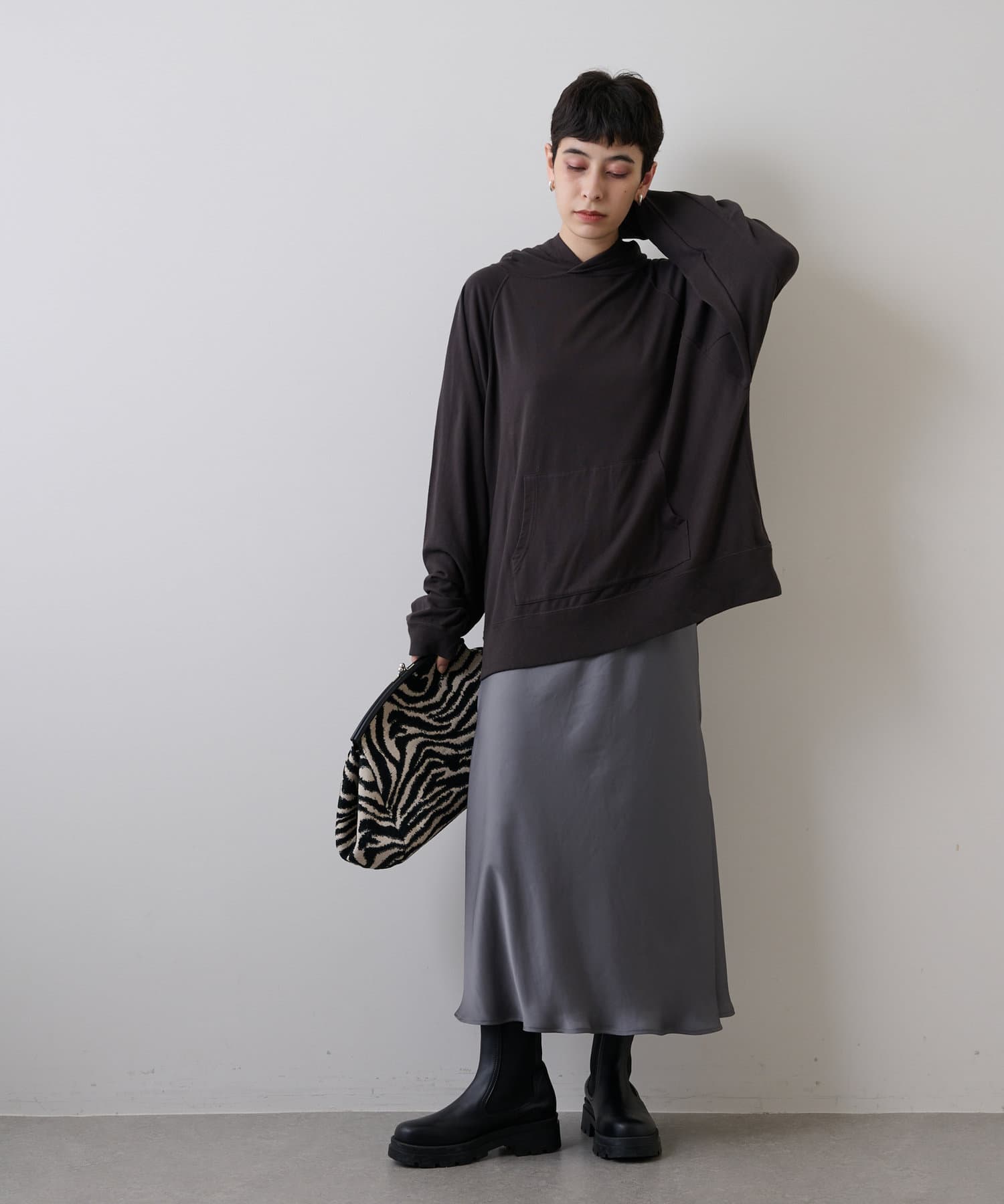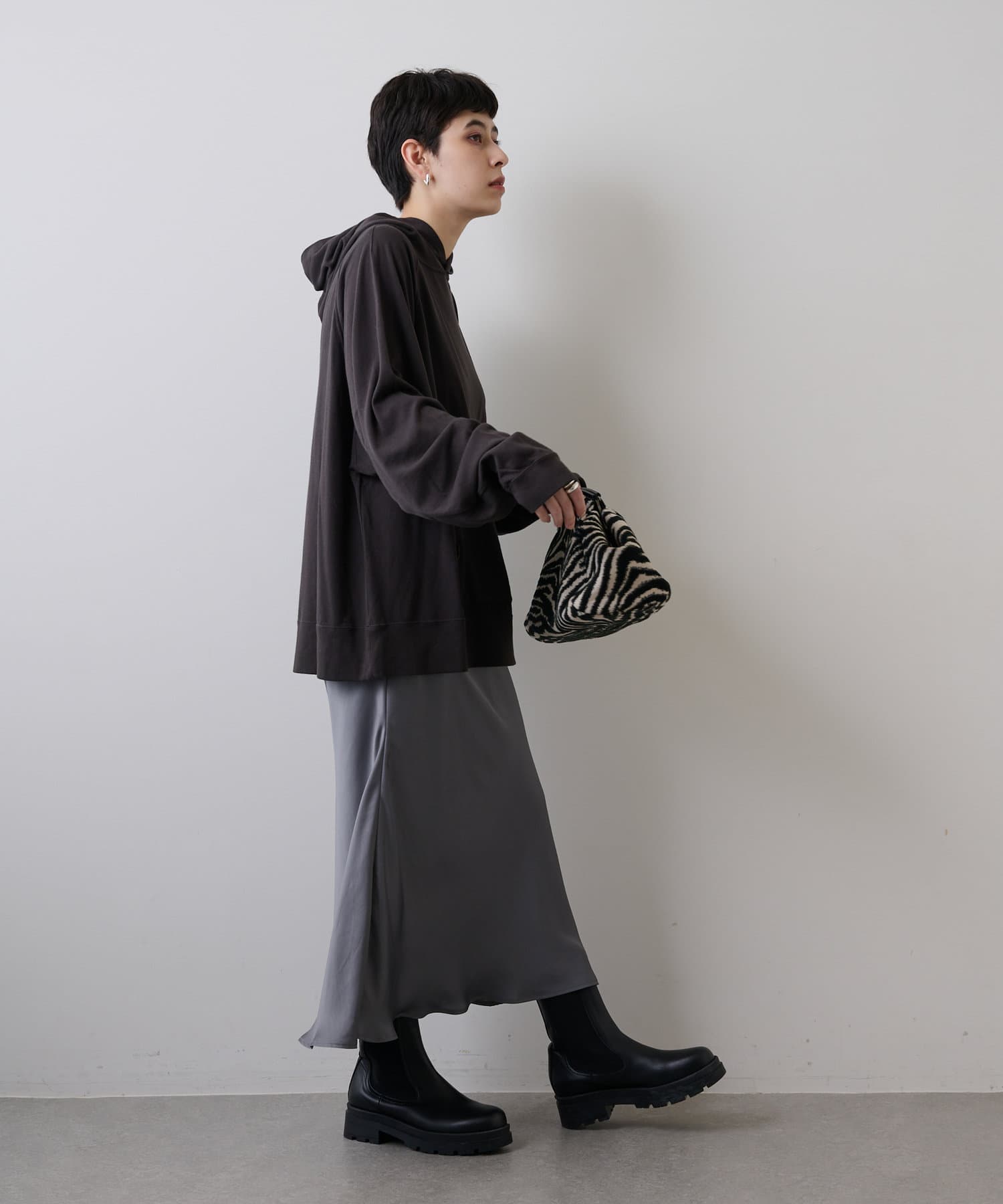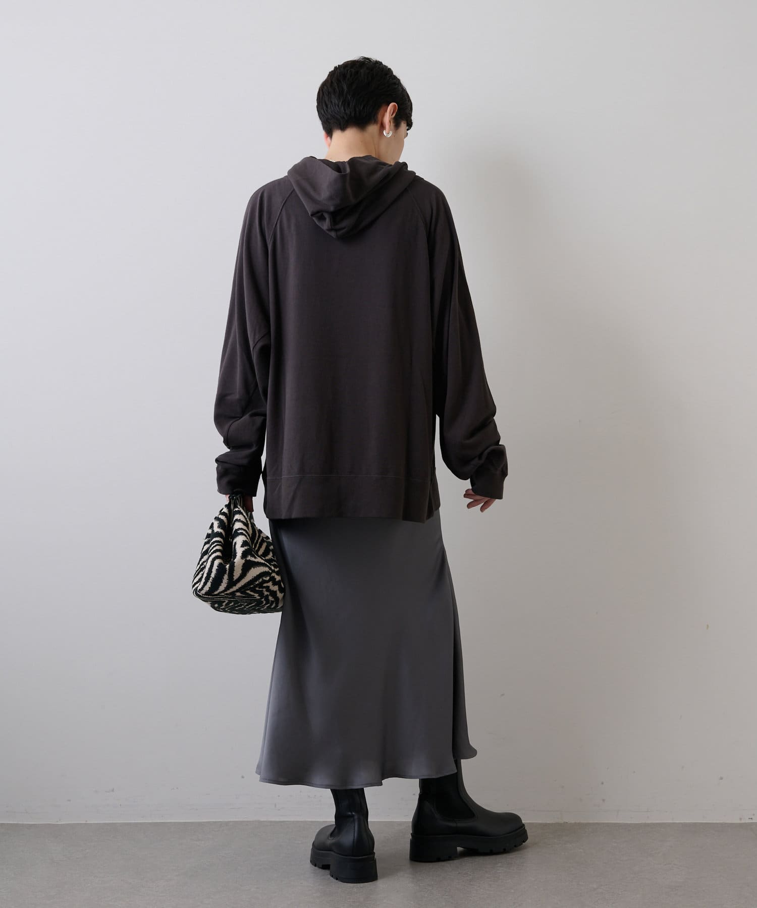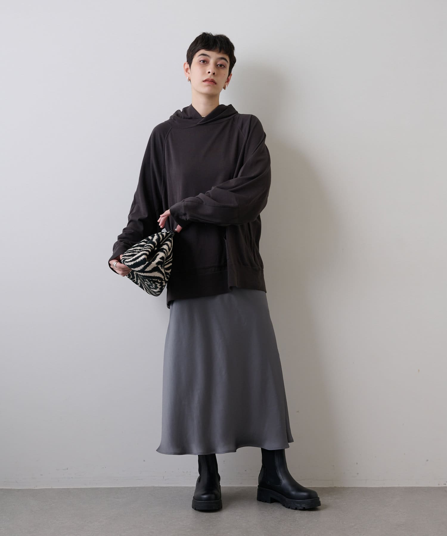 抜け感のあるゆったりとオーバーなシルエットながら、やや厚みを抑えた生地感でラフ見えす過ぎず、これからの季節はアウターインしやすいのもうれしいポイント。