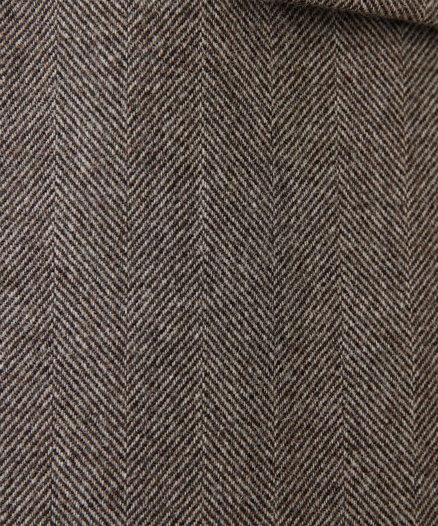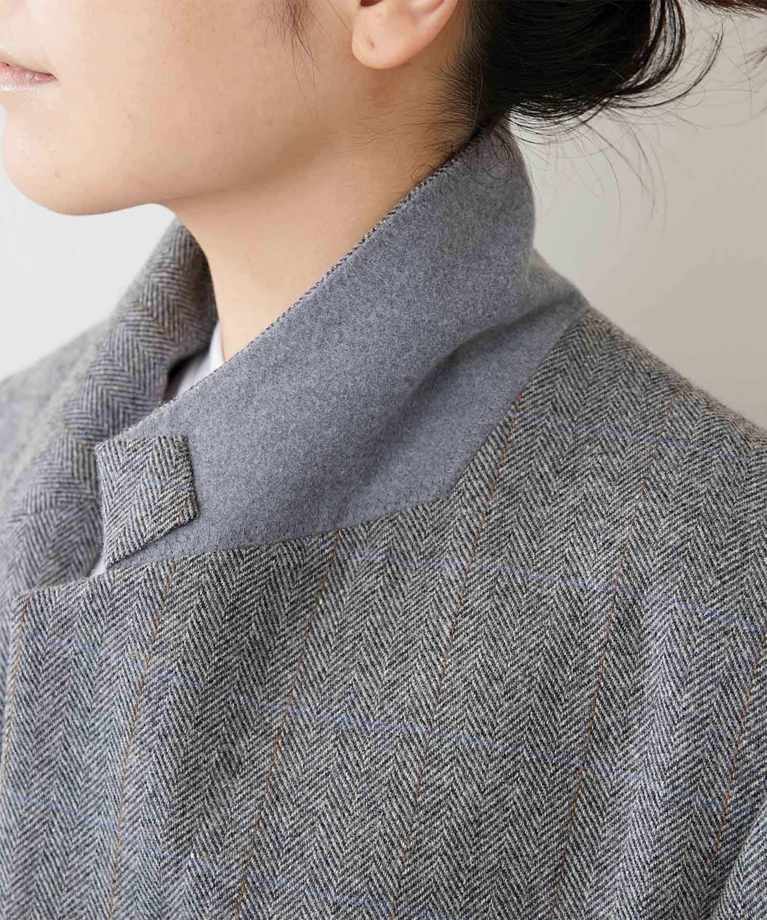 再生紙を使用したヘリンボーン生地を使用することで、柄の見え感がクリアになりすぎず、奥行きのある色表現が大人っぽく上品な一着。