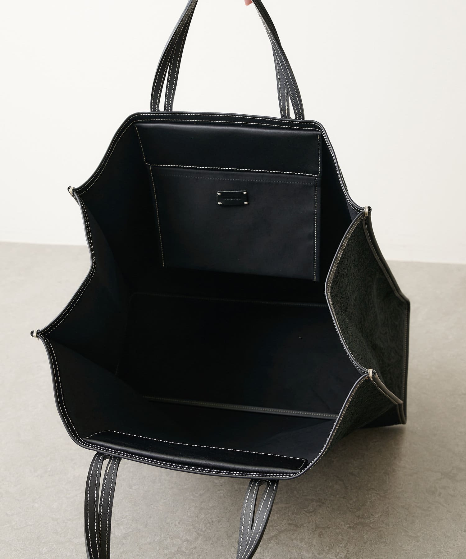 たっぷりとマチのあるビッグサイズで、ショッピングバッグのようなミスマッチ感が魅力。