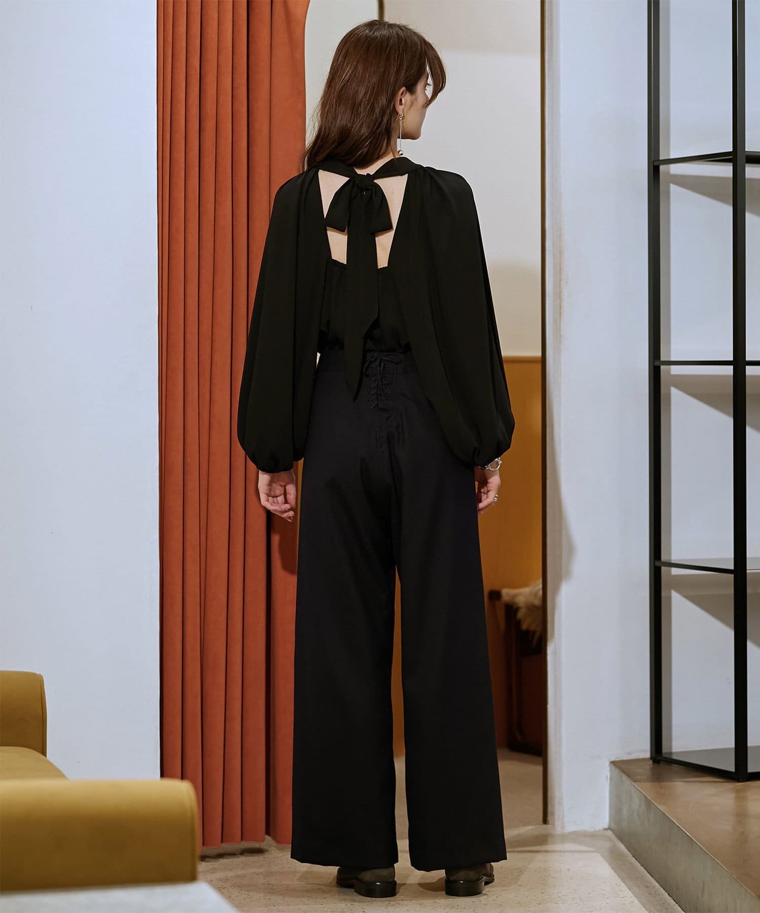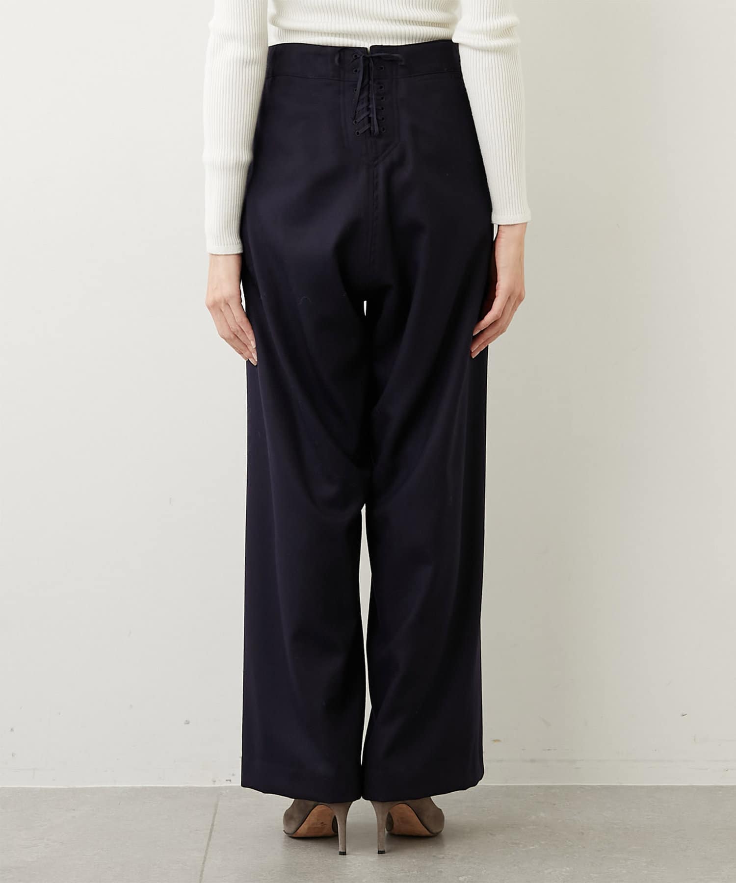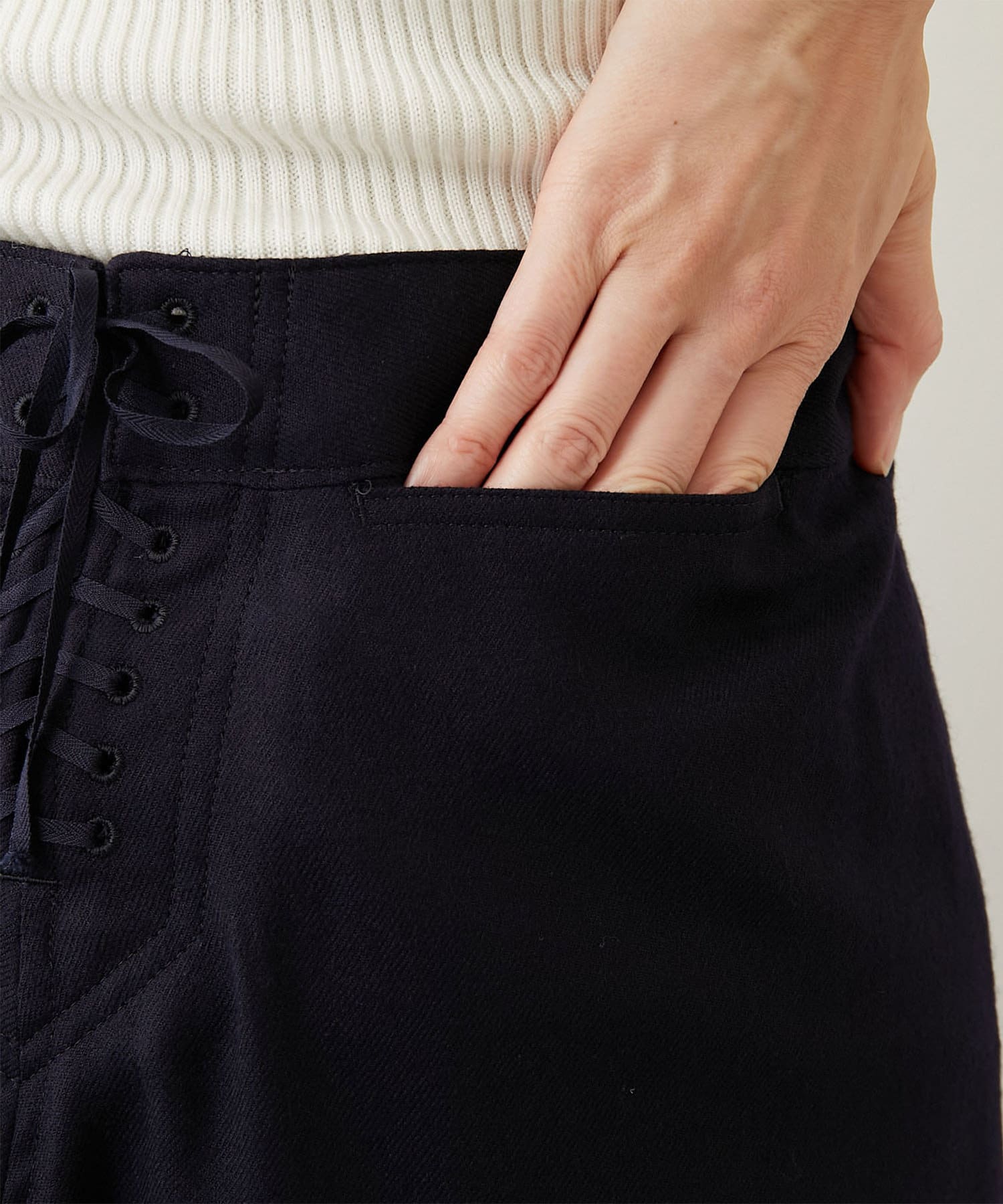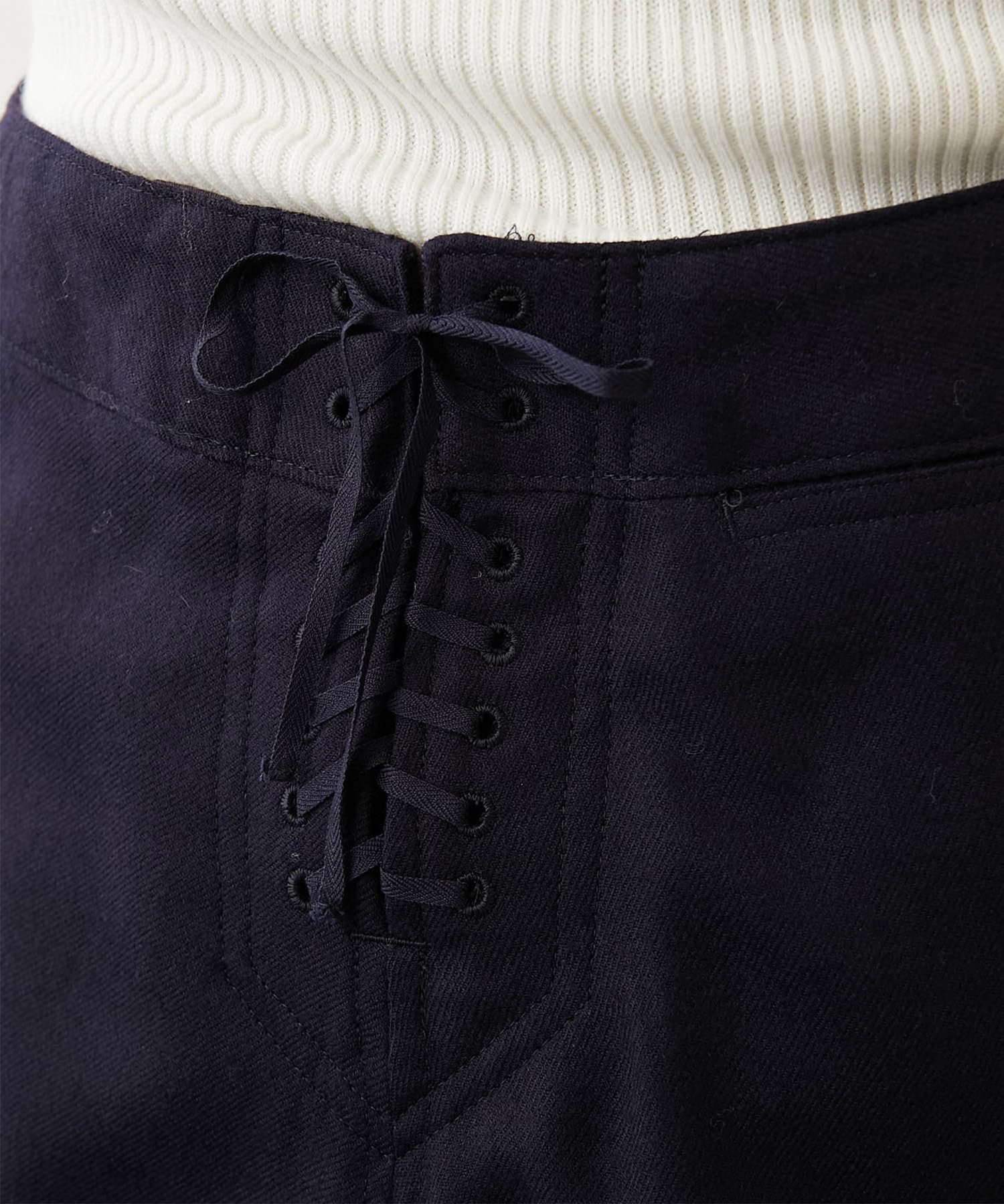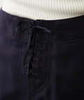フロントには本格的なマリン釦の使用にこだわり、バックスタイルに施されたレースアップのディテールもさりげないアクセントで、サイズの微調整が可能なのでカットソーからニットまでインするアイテムに合わせて変えられるのもうれしいポイントです。