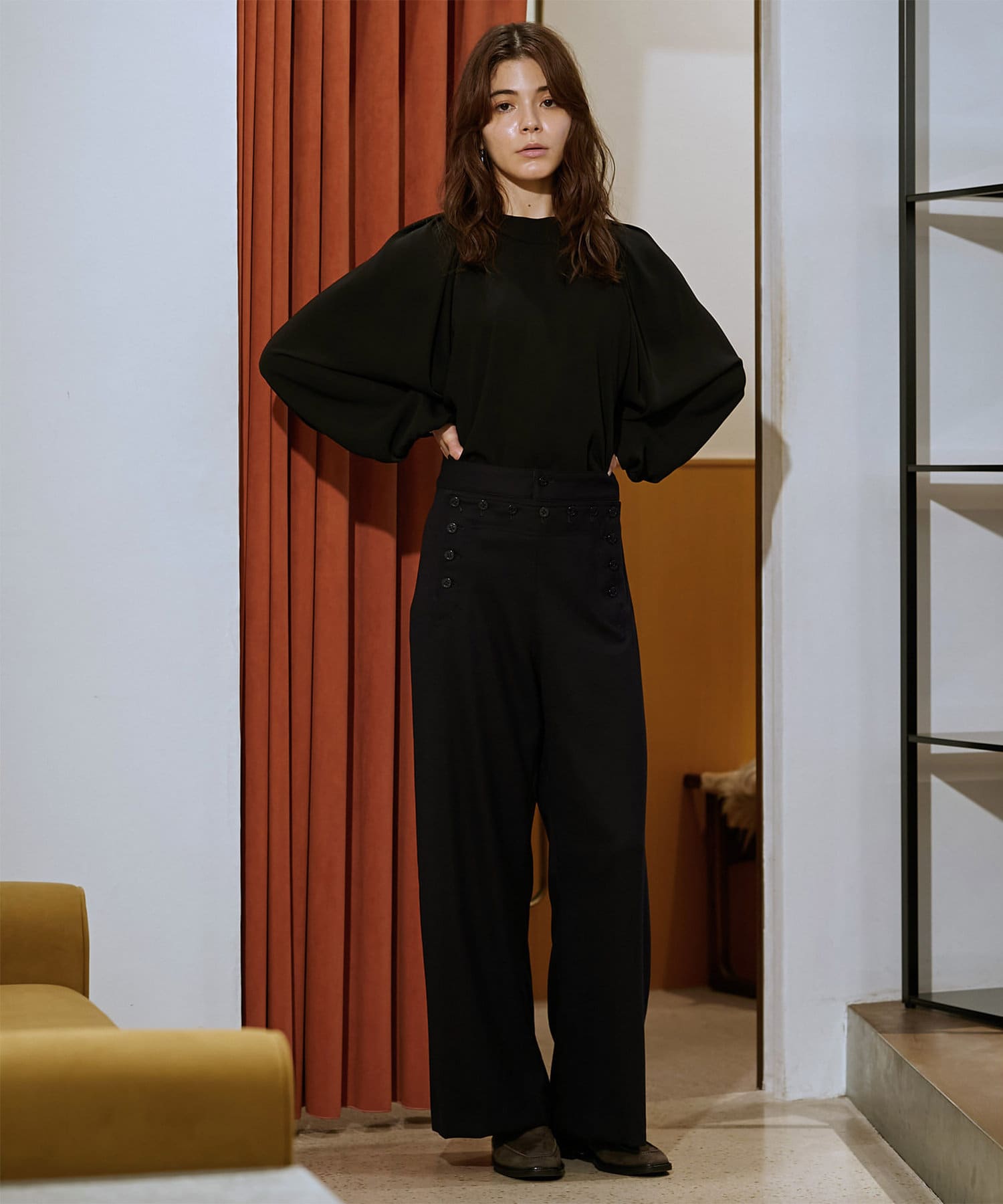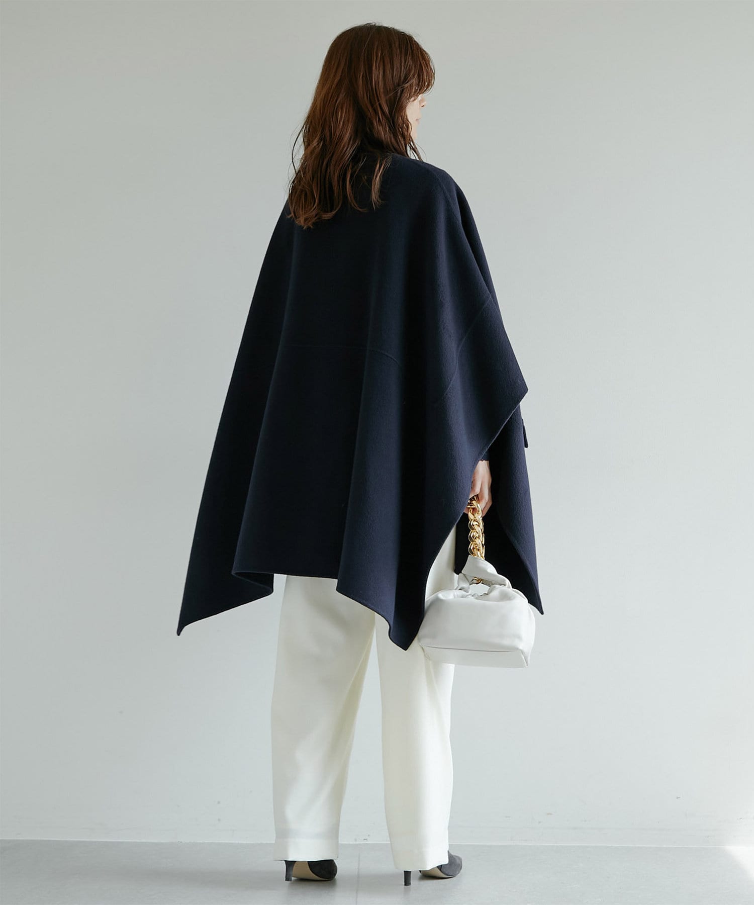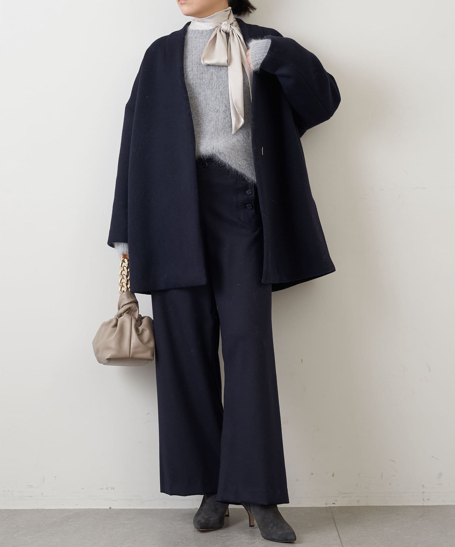 秋冬仕様のウール素材とボタンのトーンをまとめ、シックで落ち着きのある表情が大人らしい一着。