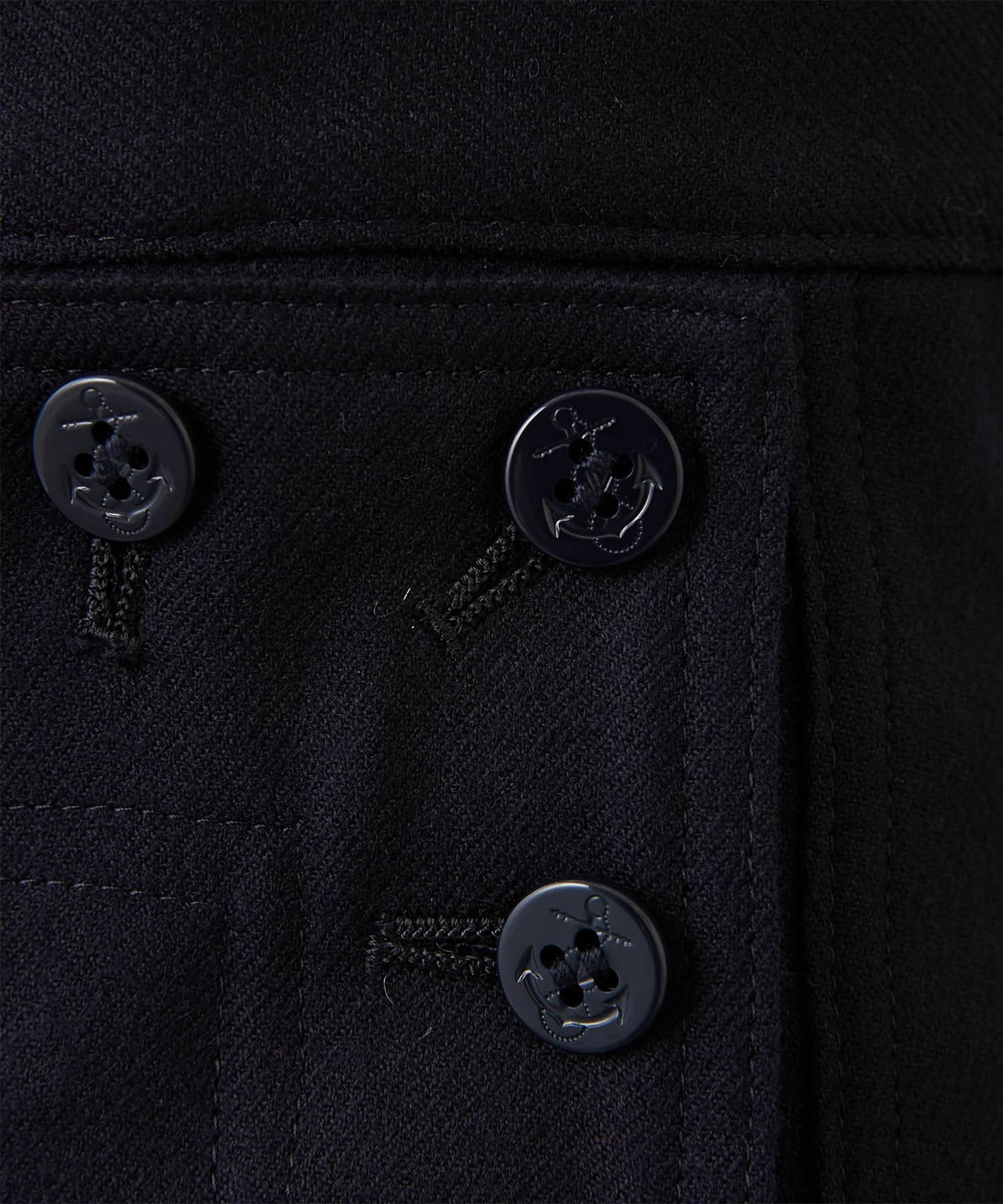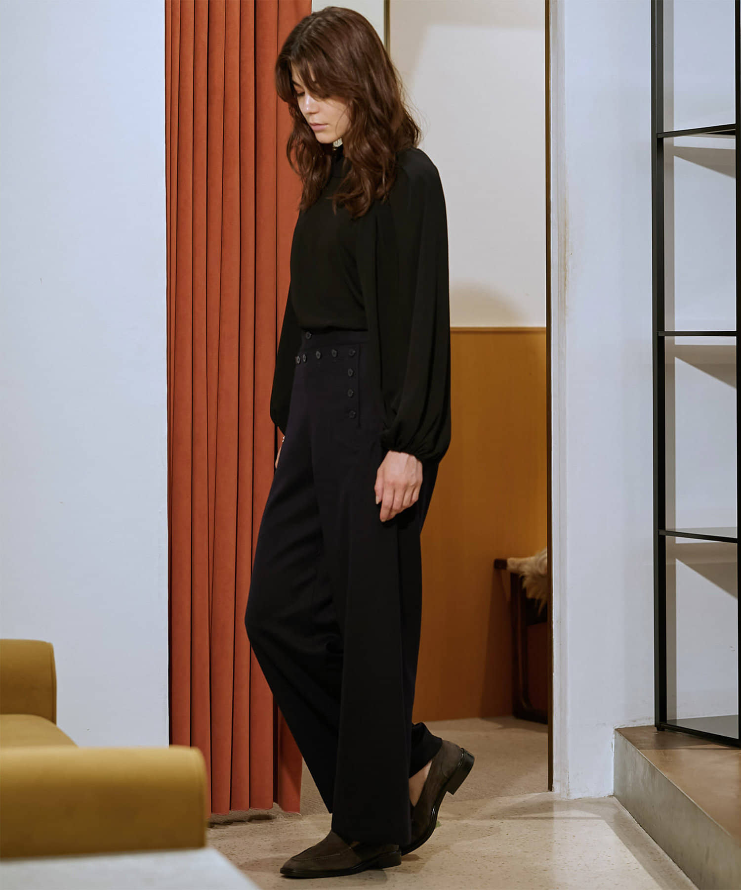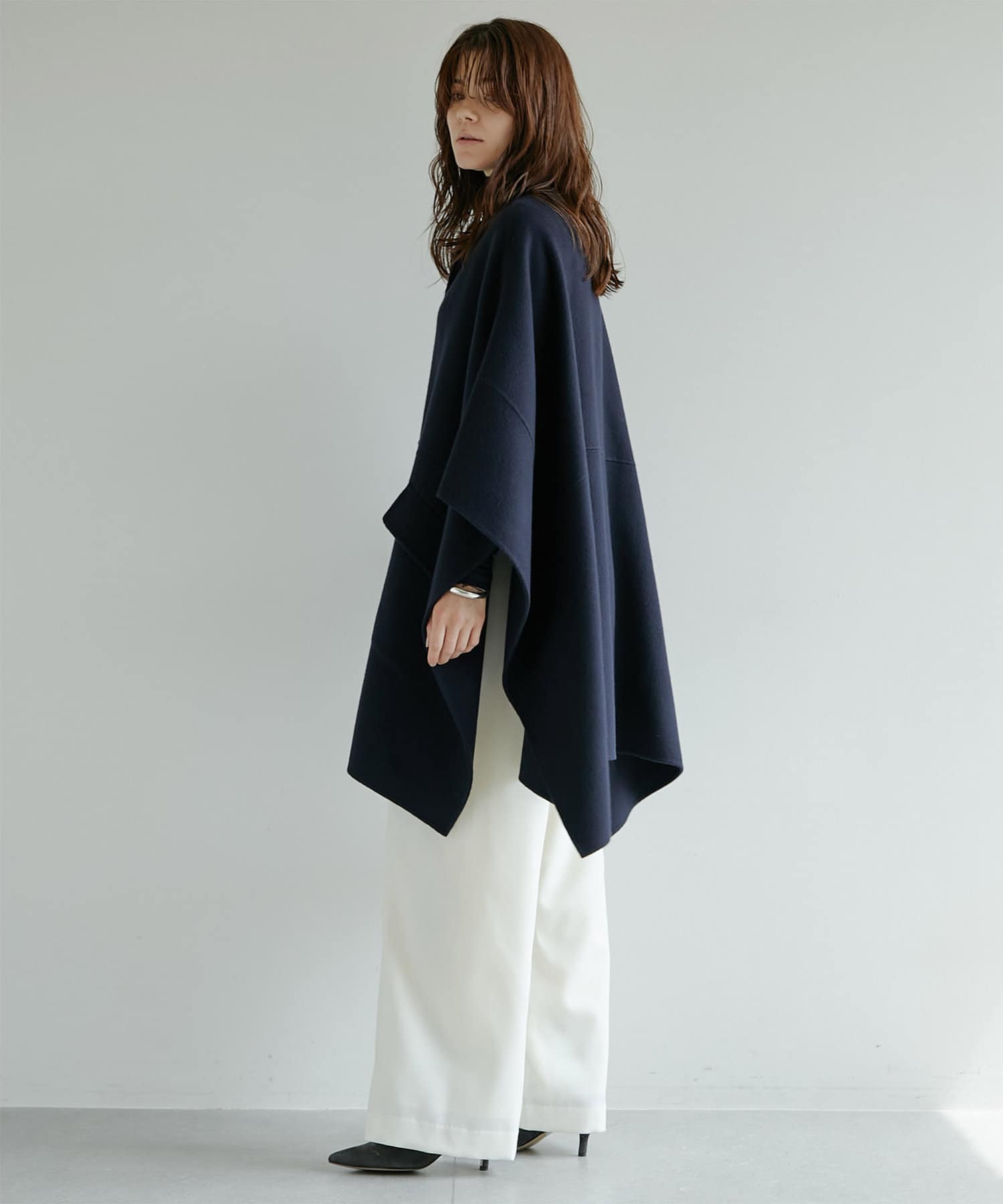 秋冬仕様のウール素材とボタンのトーンをまとめ、シックで落ち着きのある表情が大人らしい一着。
