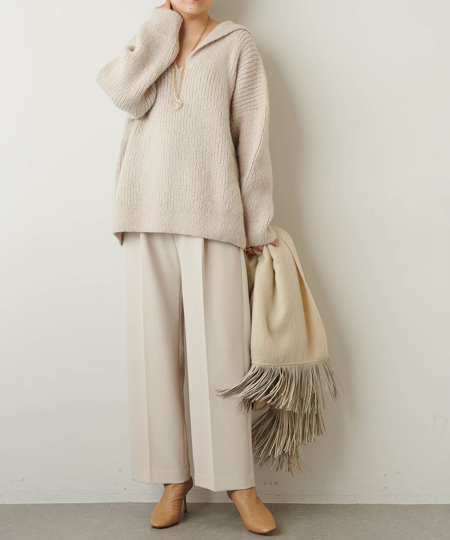 ■ 【Marisolコラボ】アンゴラクルーネックプルオーバー(ブランド品番:WGZ1012305A0010)と合わせて素材感のメリハリを楽しむスタイルも今季らしくおすすめ。