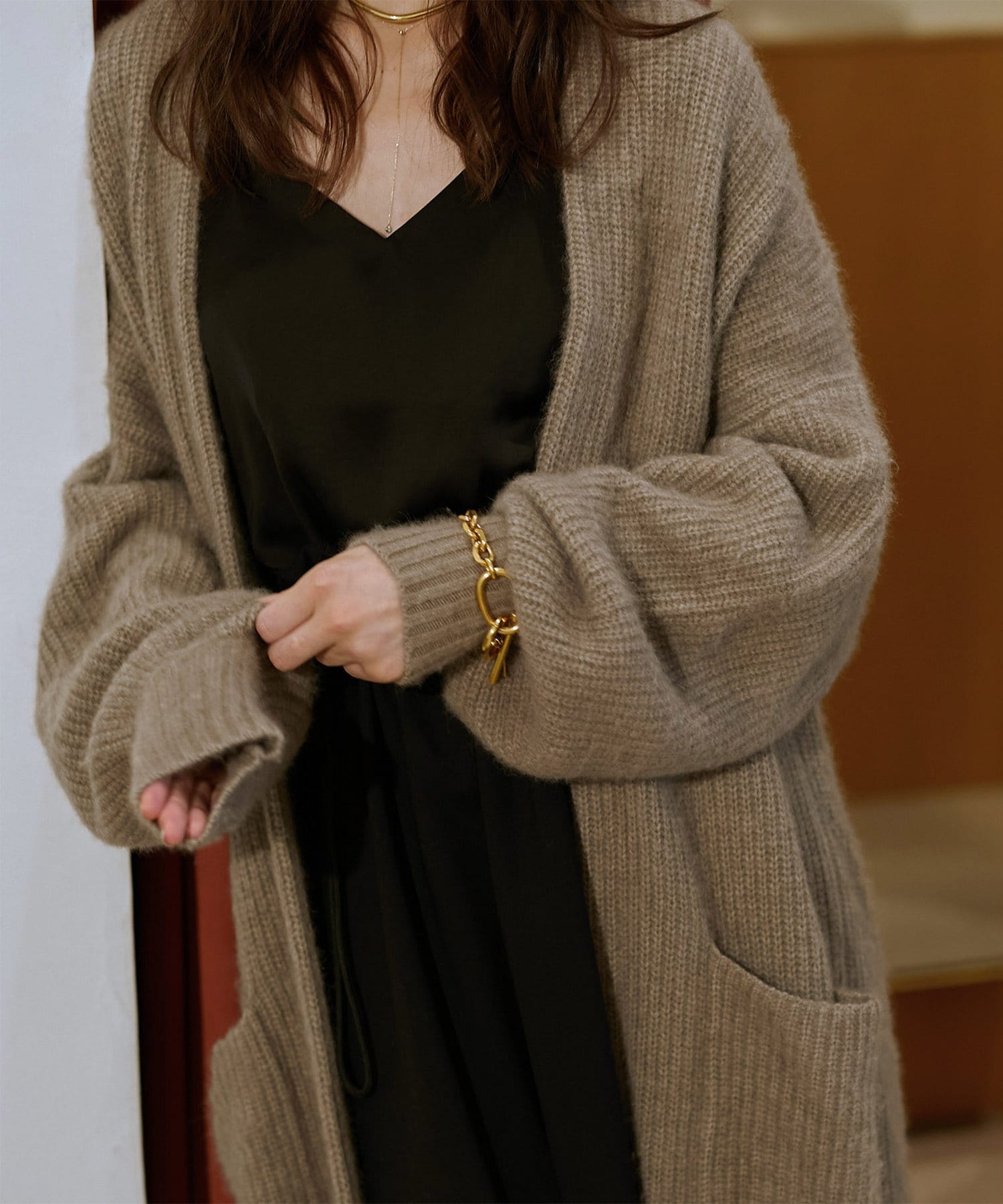 定番のサテンキャミ。アジャスターを1番短くして着用しています。