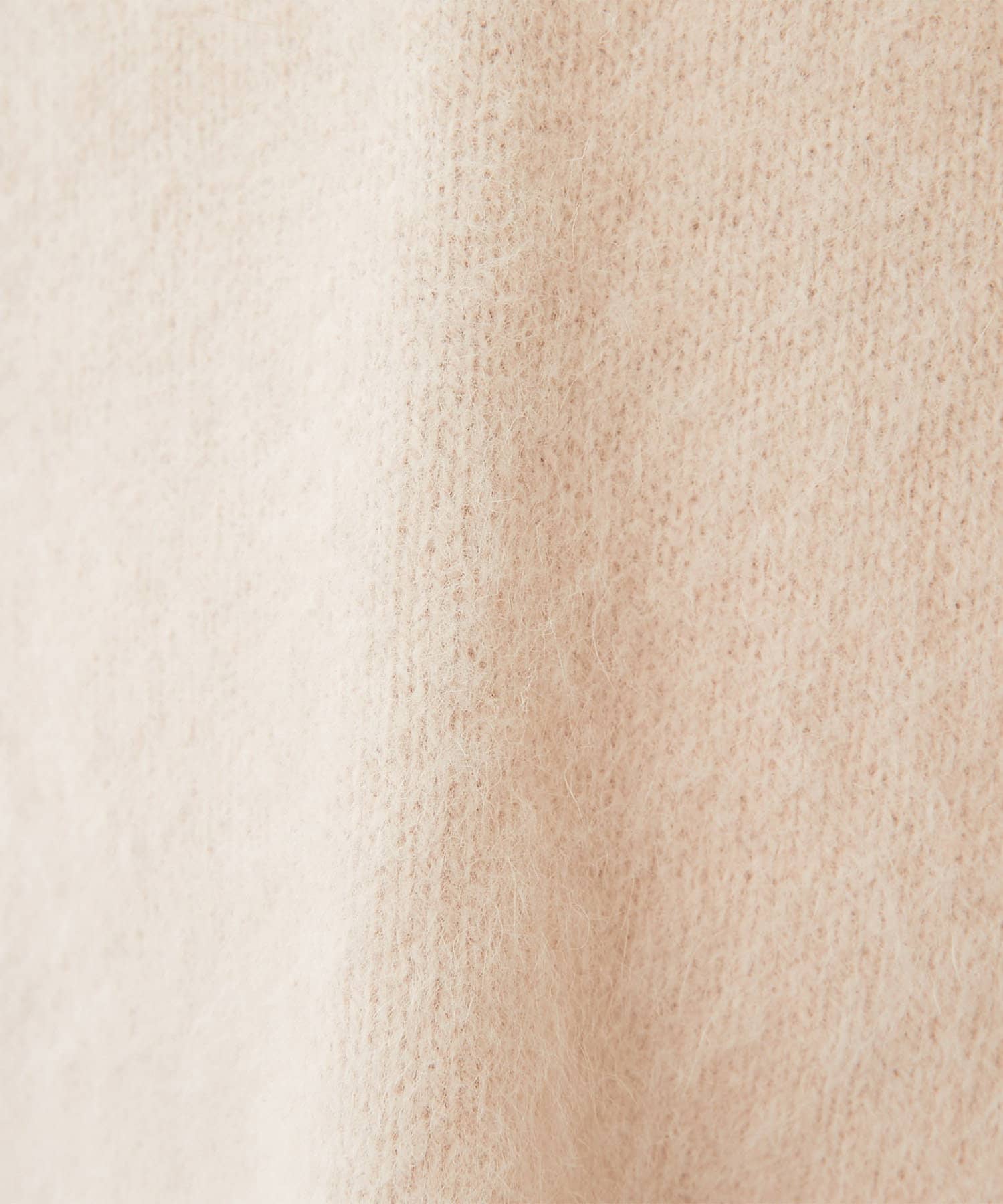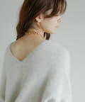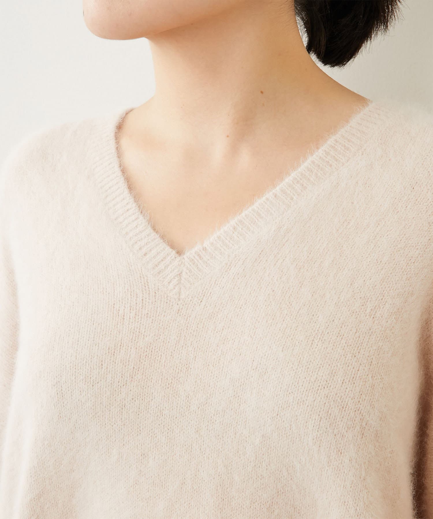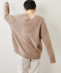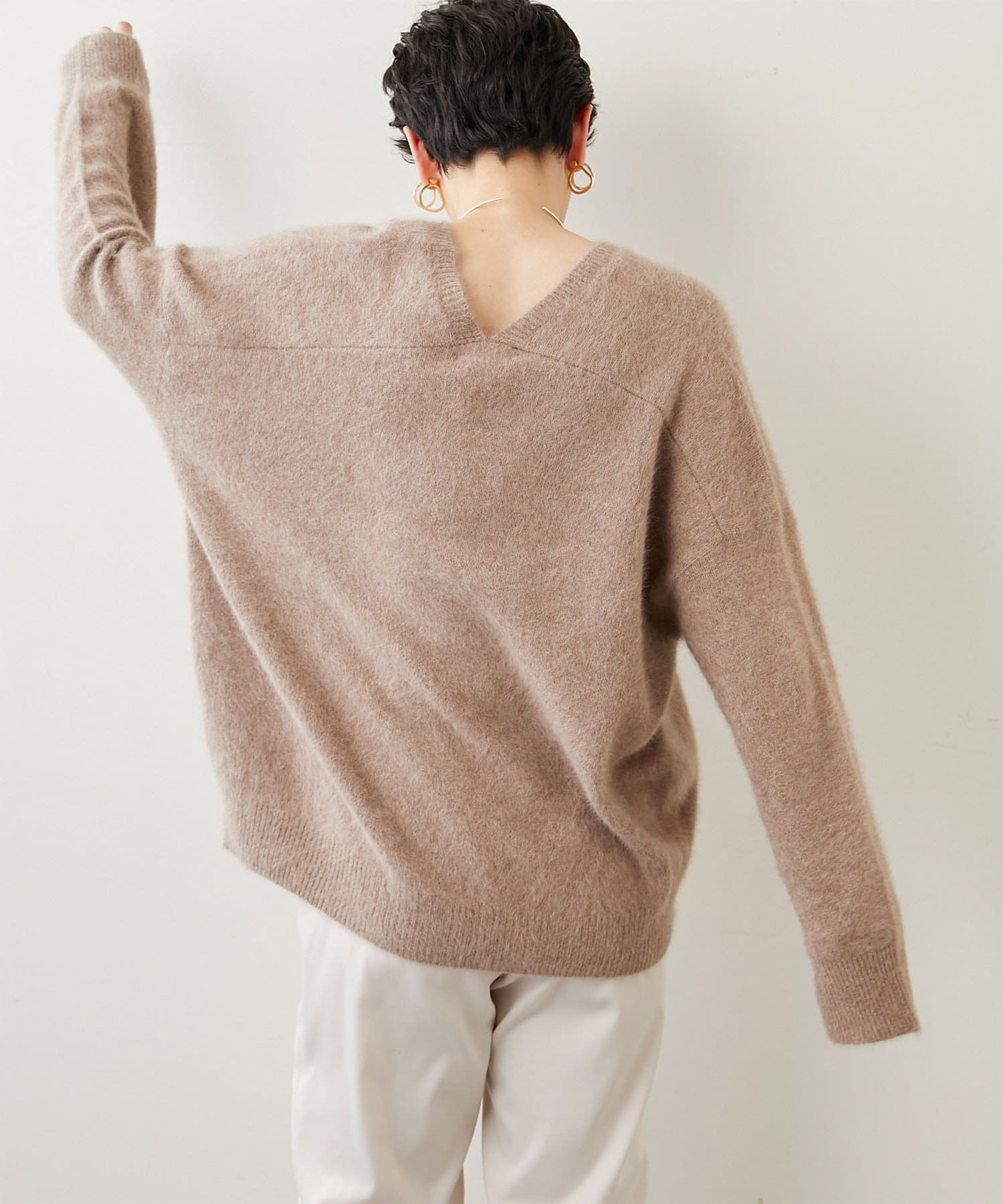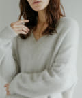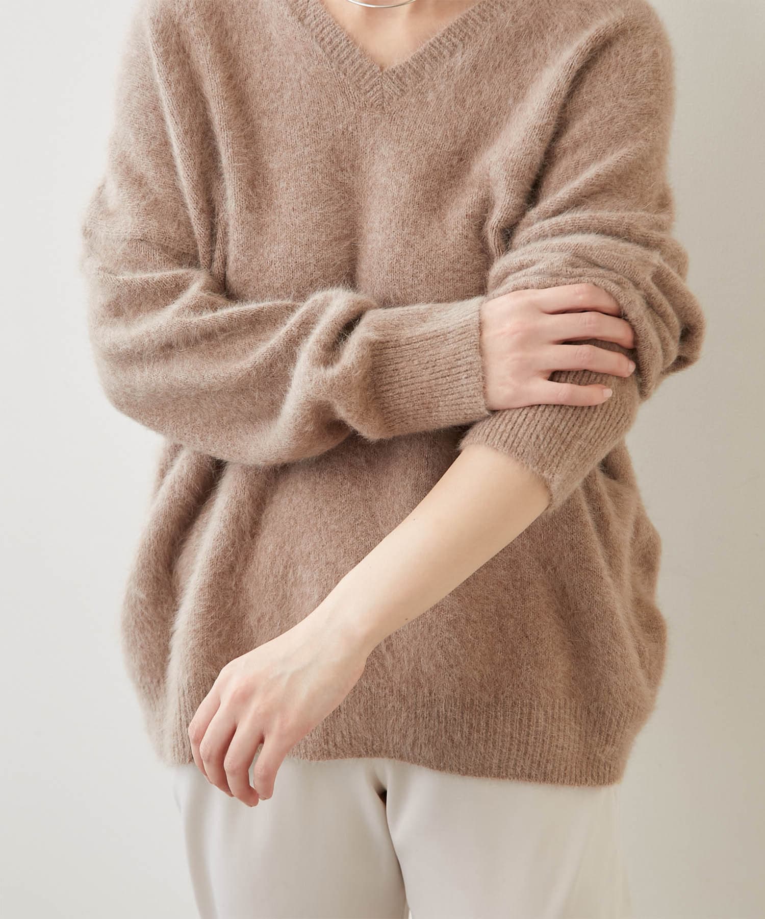 畦編みにすることでシャギーのボリュームを出しつつ、たっぷりとしたスリーブと前後のV開きのデザインが女性らしさを引き立たせるデザイン。