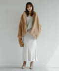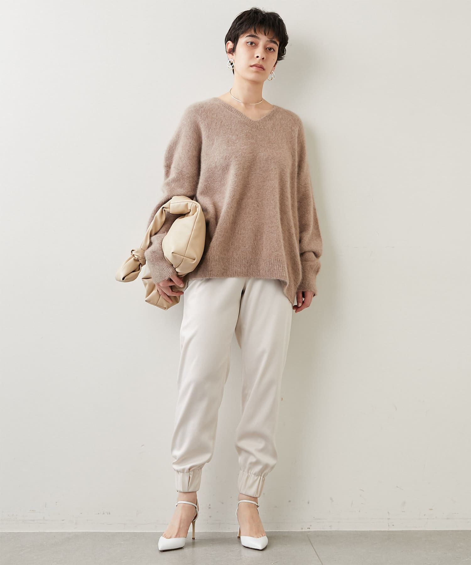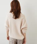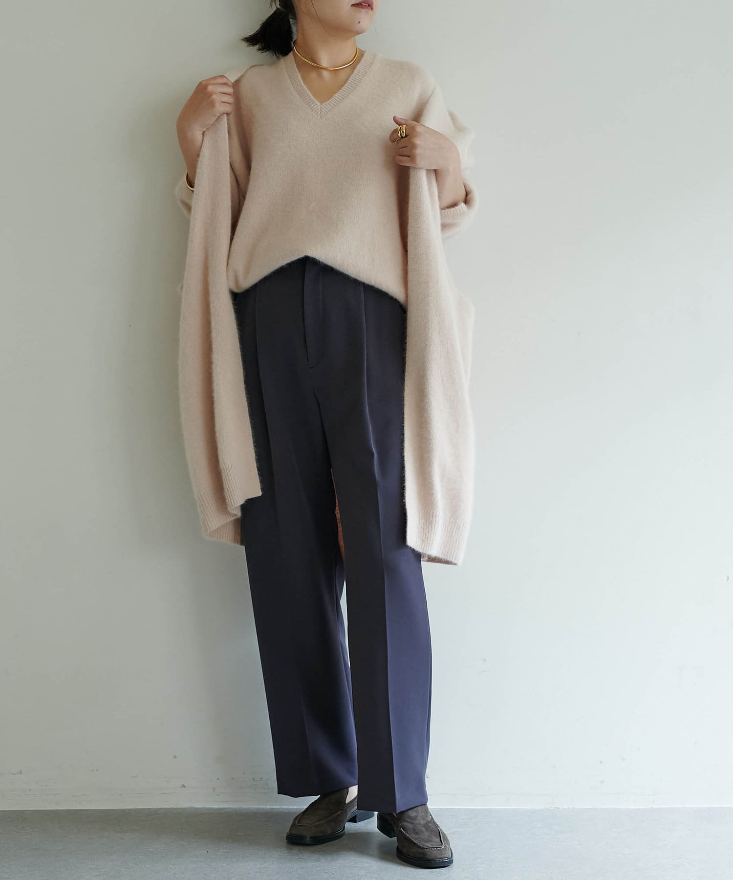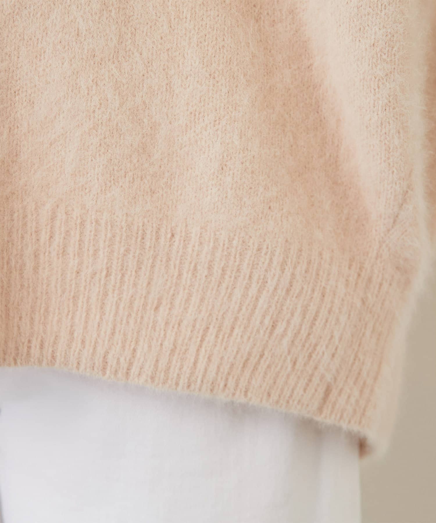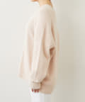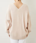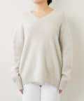 畦編みにすることでシャギーのボリュームを出しつつ、たっぷりとしたスリーブと前後のV開きのデザインが女性らしさを引き立たせるデザイン。