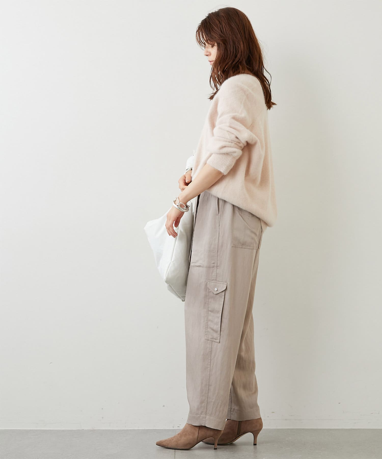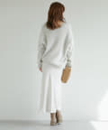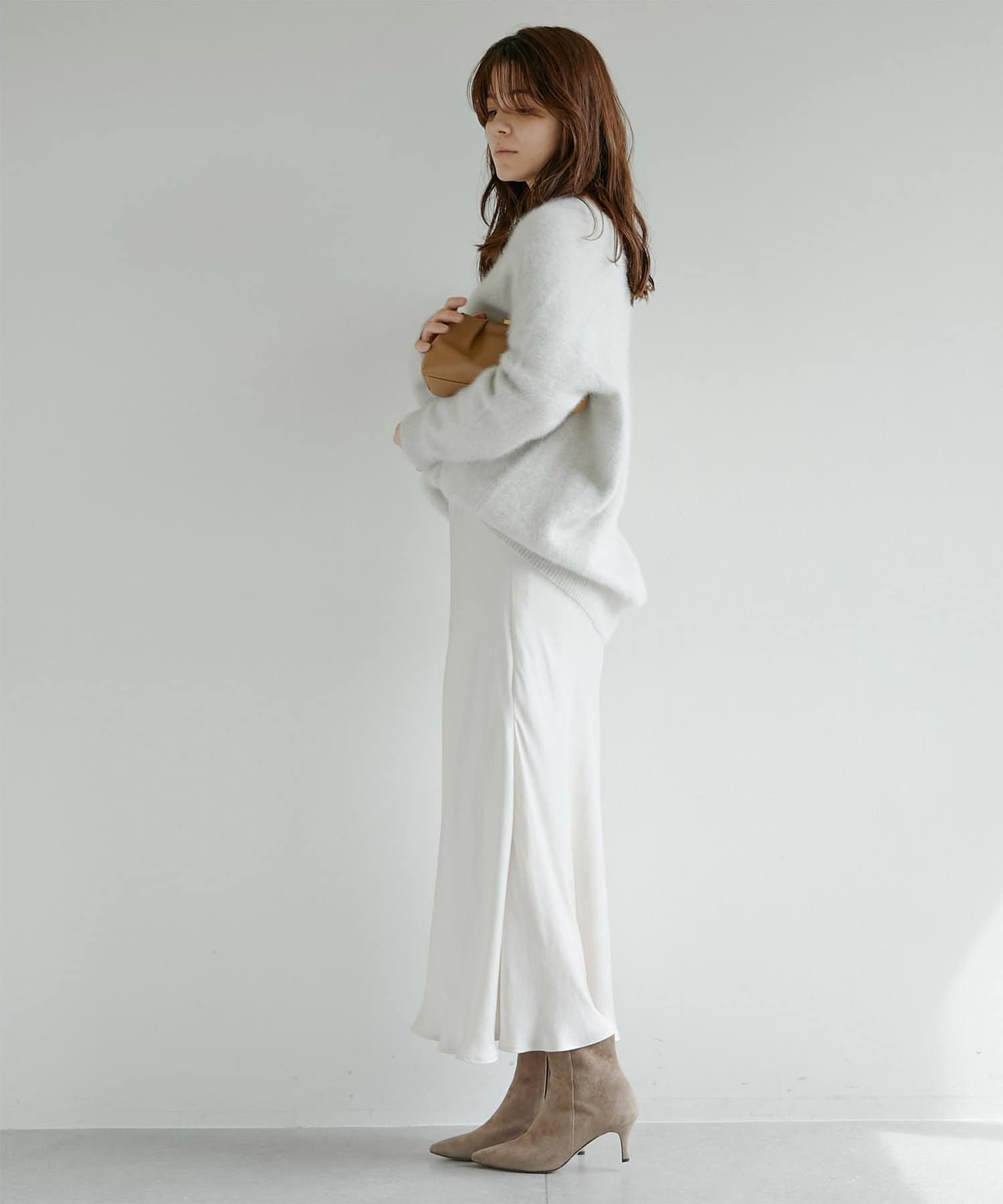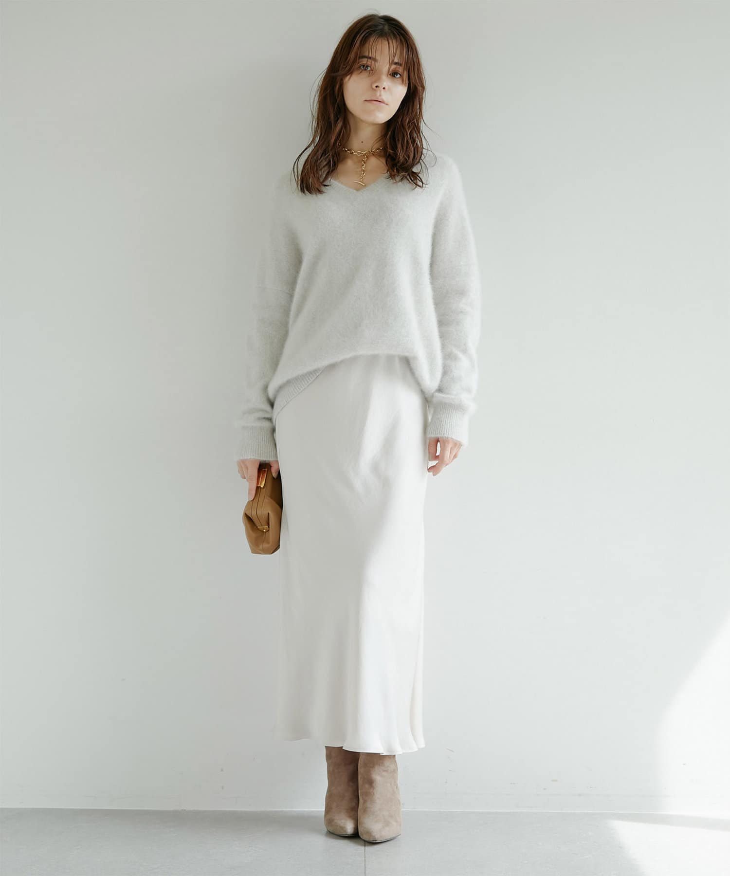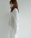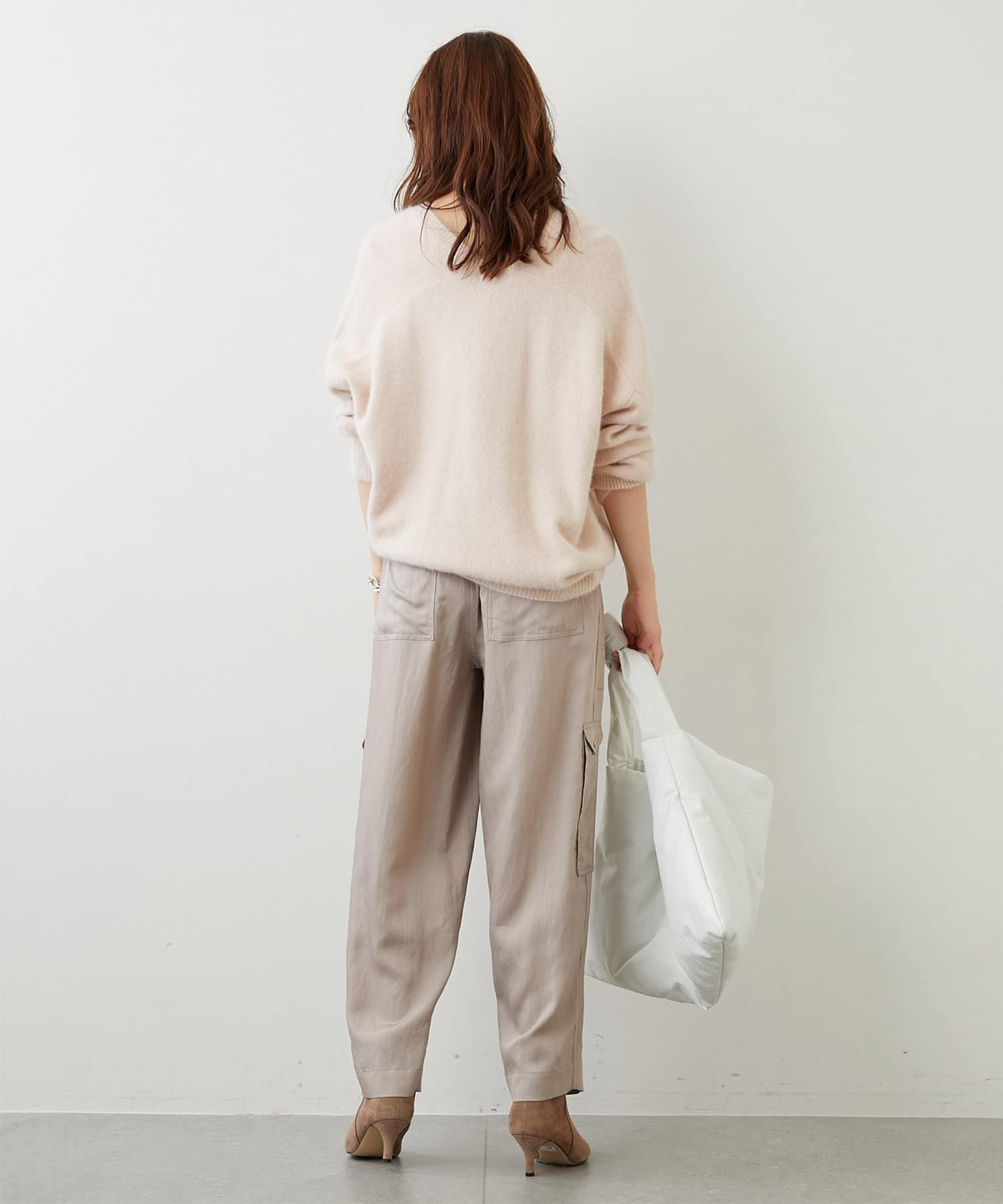 畦編みにすることでシャギーのボリュームを出しつつ、たっぷりとしたスリーブと前後のV開きのデザインが女性らしさを引き立たせるデザイン。