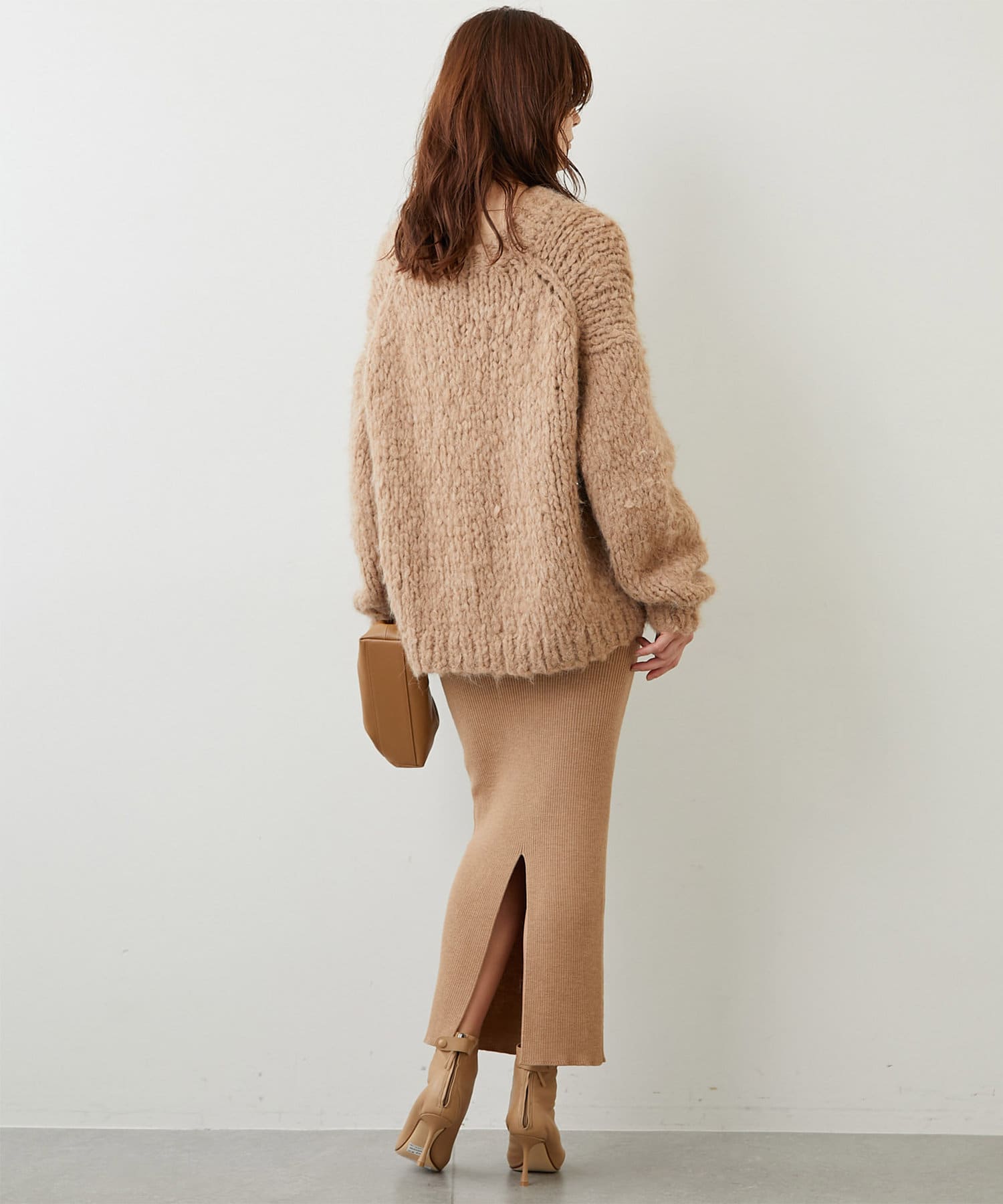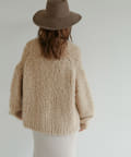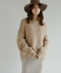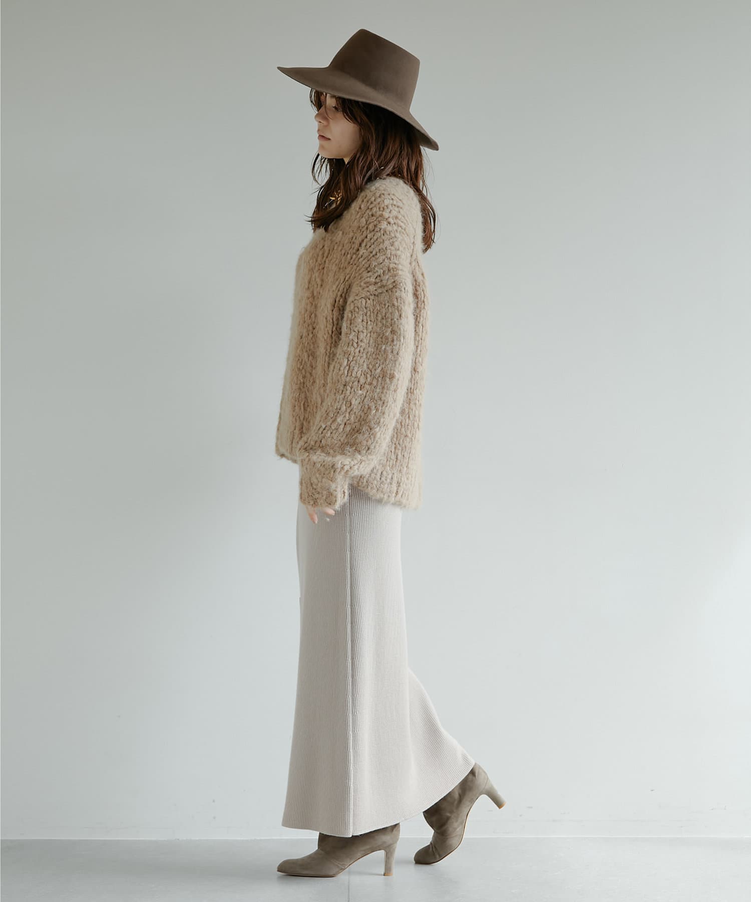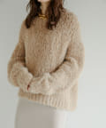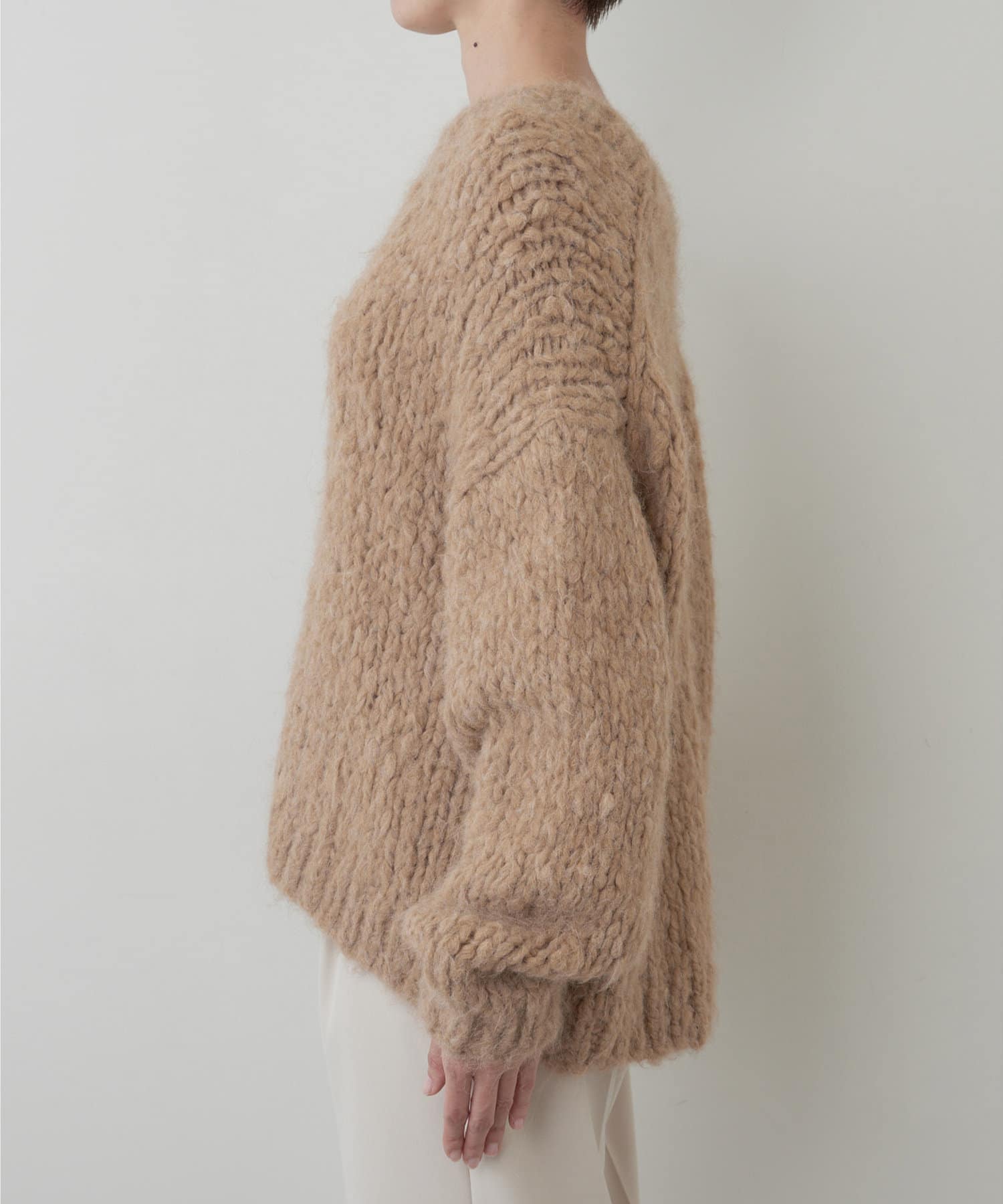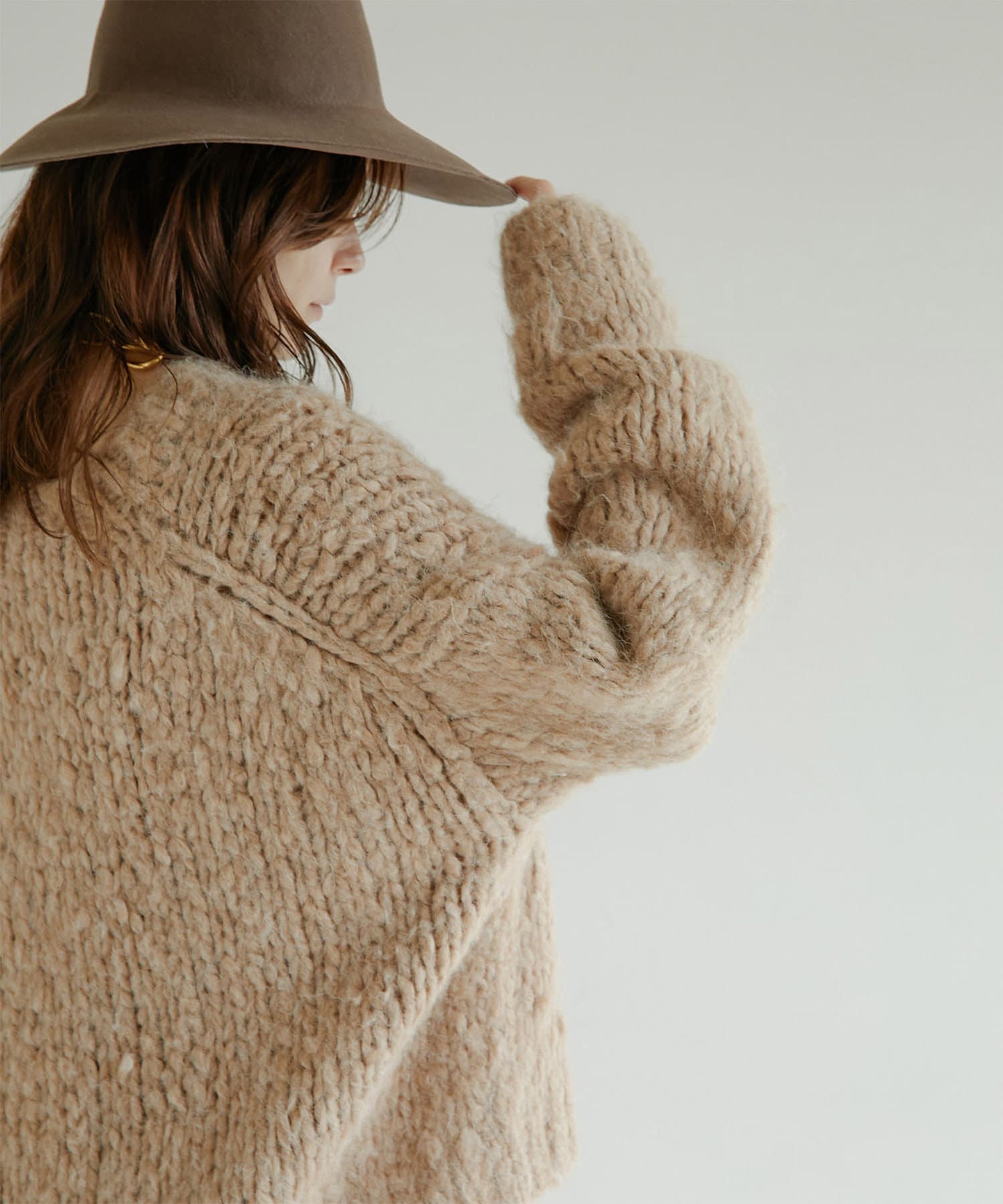 毛足を出すことでよりソフトで軽い風合いに仕上げ、大きな編み目とふわふわと起毛した糸の表情を活かした、大人の女性のための贅沢な一着。