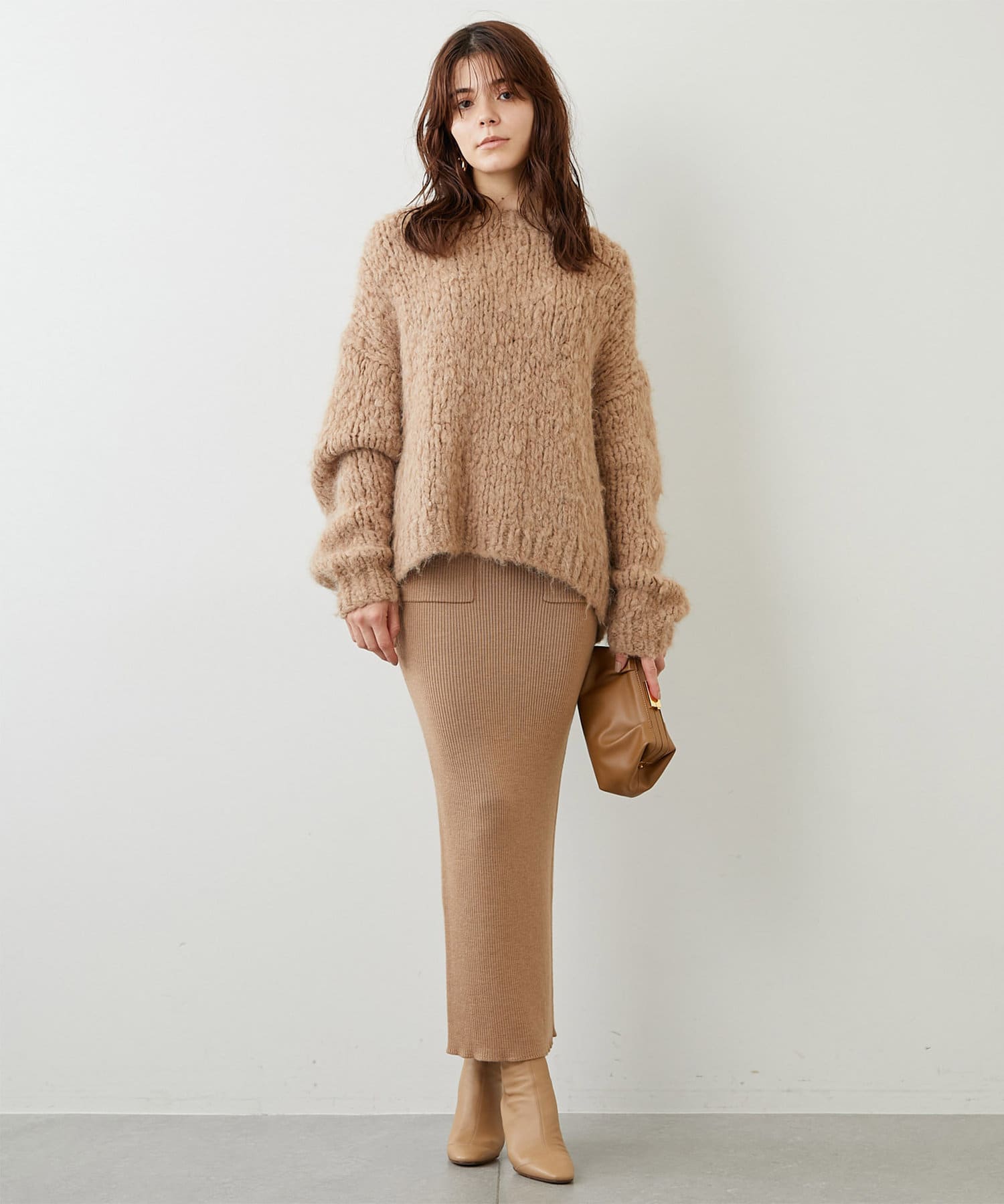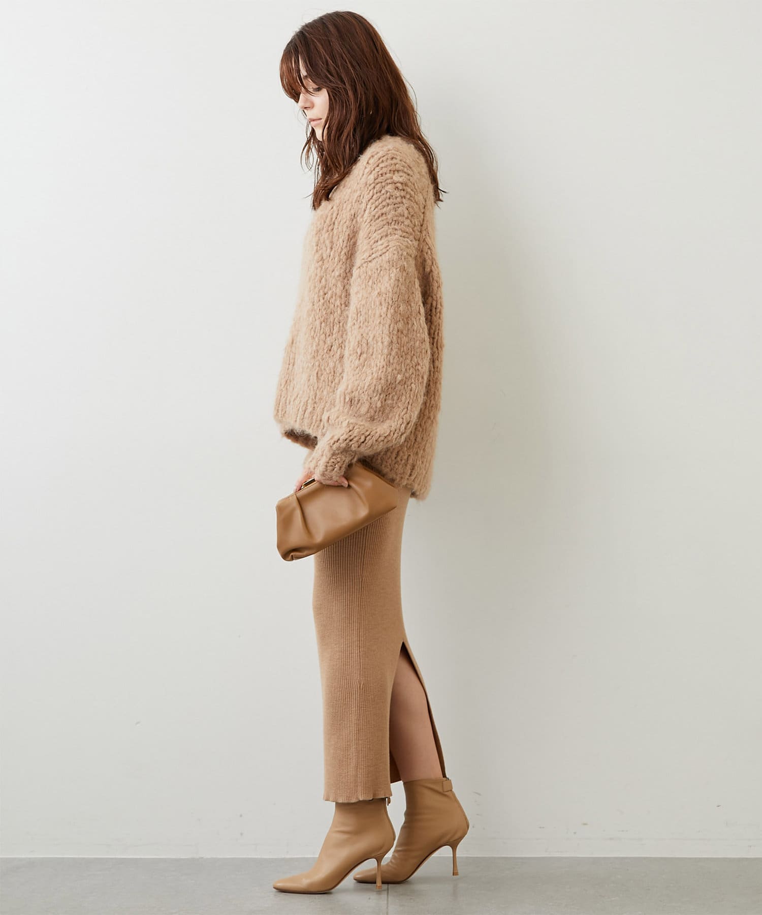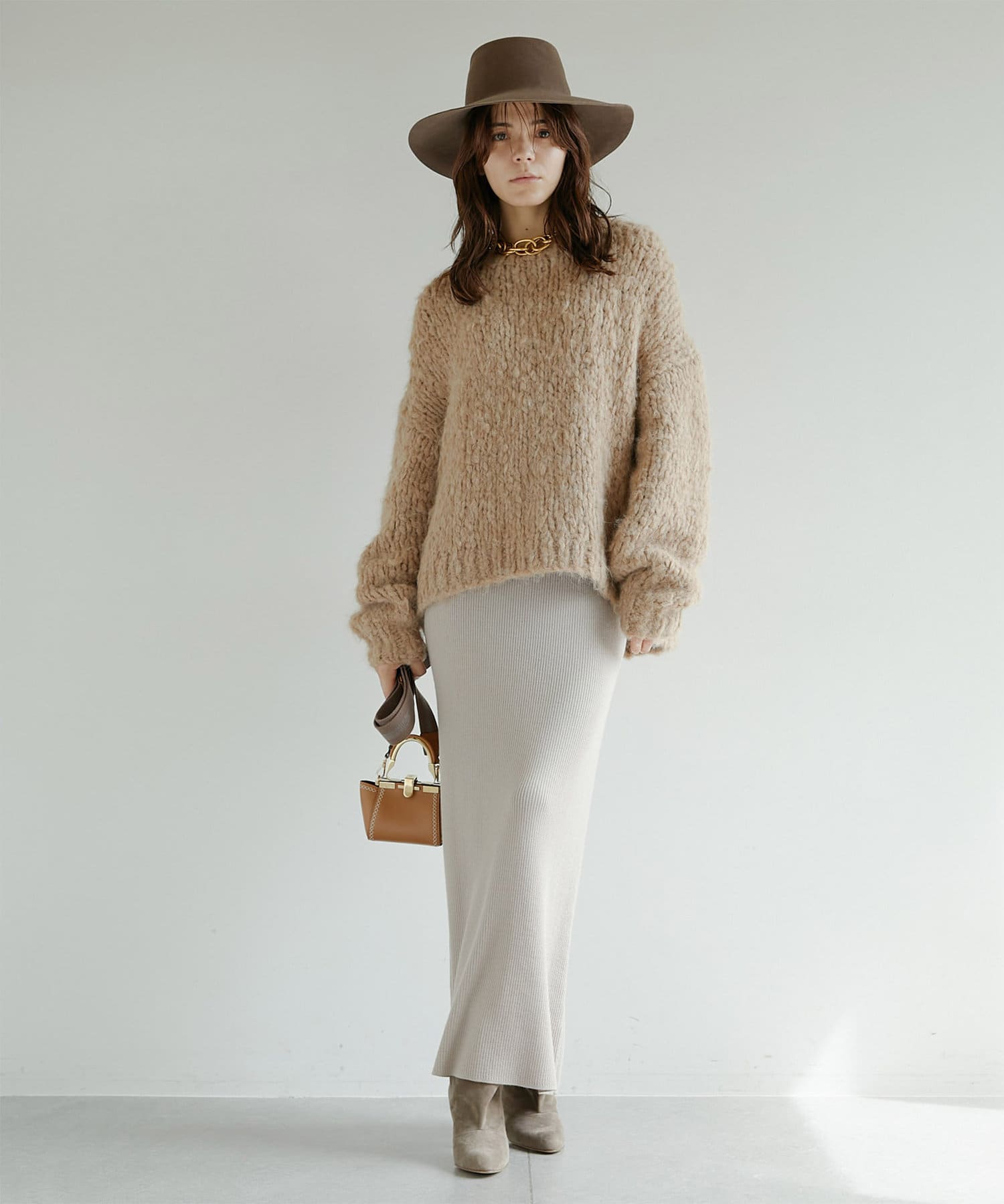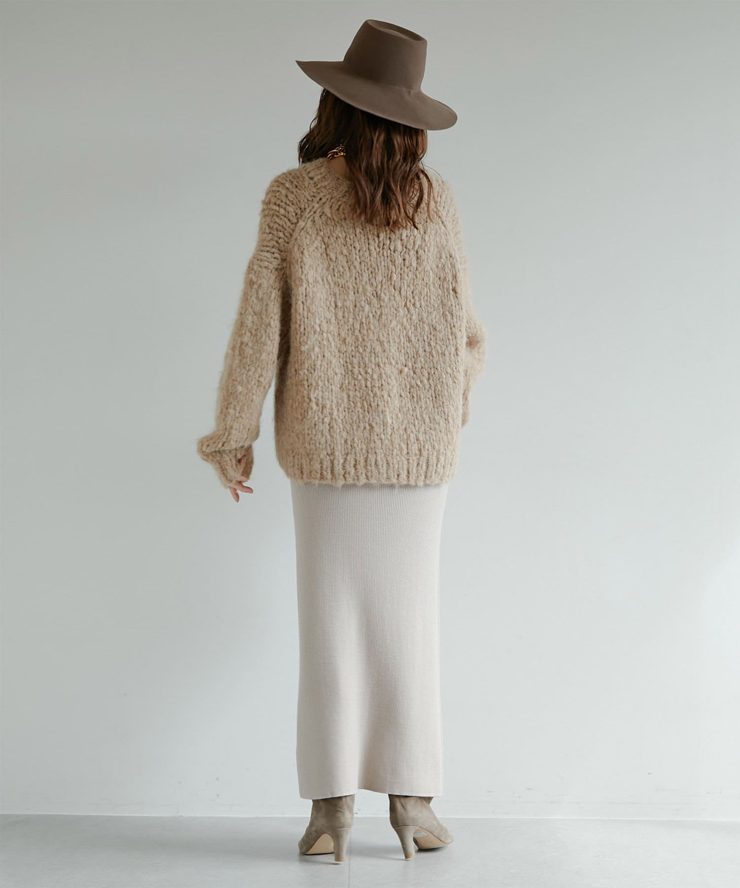 毛足を出すことでよりソフトで軽い風合いに仕上げ、大きな編み目とふわふわと起毛した糸の表情を活かした、大人の女性のための贅沢な一着。