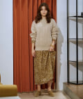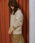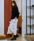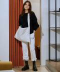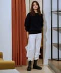 肩は大胆にドロップさせラフな抜け感をプラスしつつ、裾を少しすぼめたデザインががラフ見えしすぎずに大人らしい着こなしに。合わせるボトムによって腰までたくし上げて少しコンパクトな丈感を楽しむのもおすすめです。