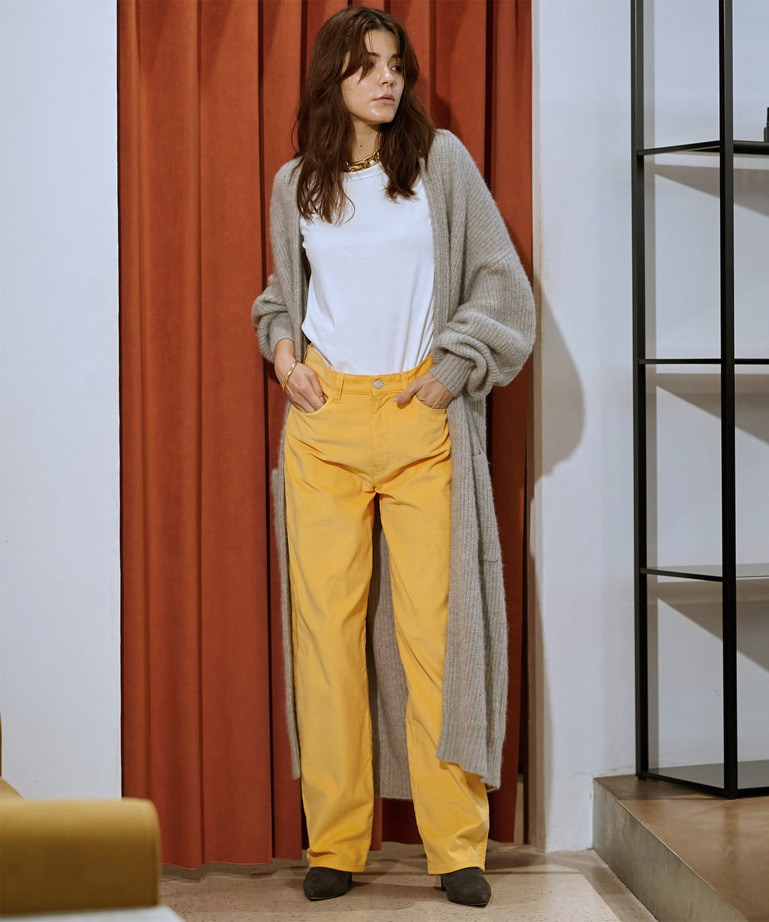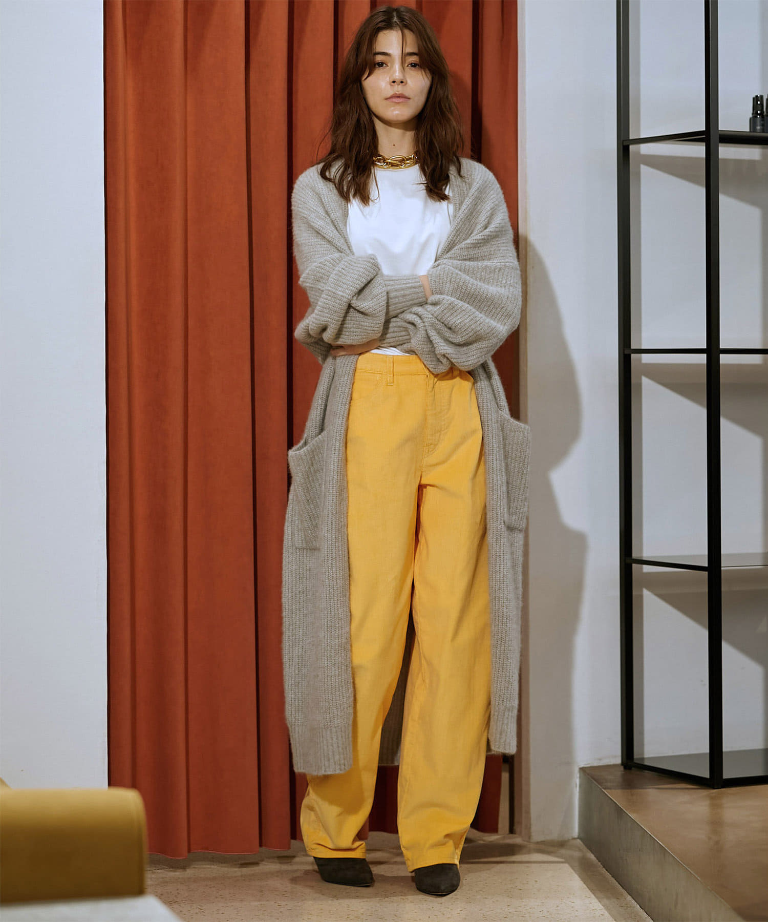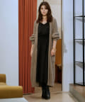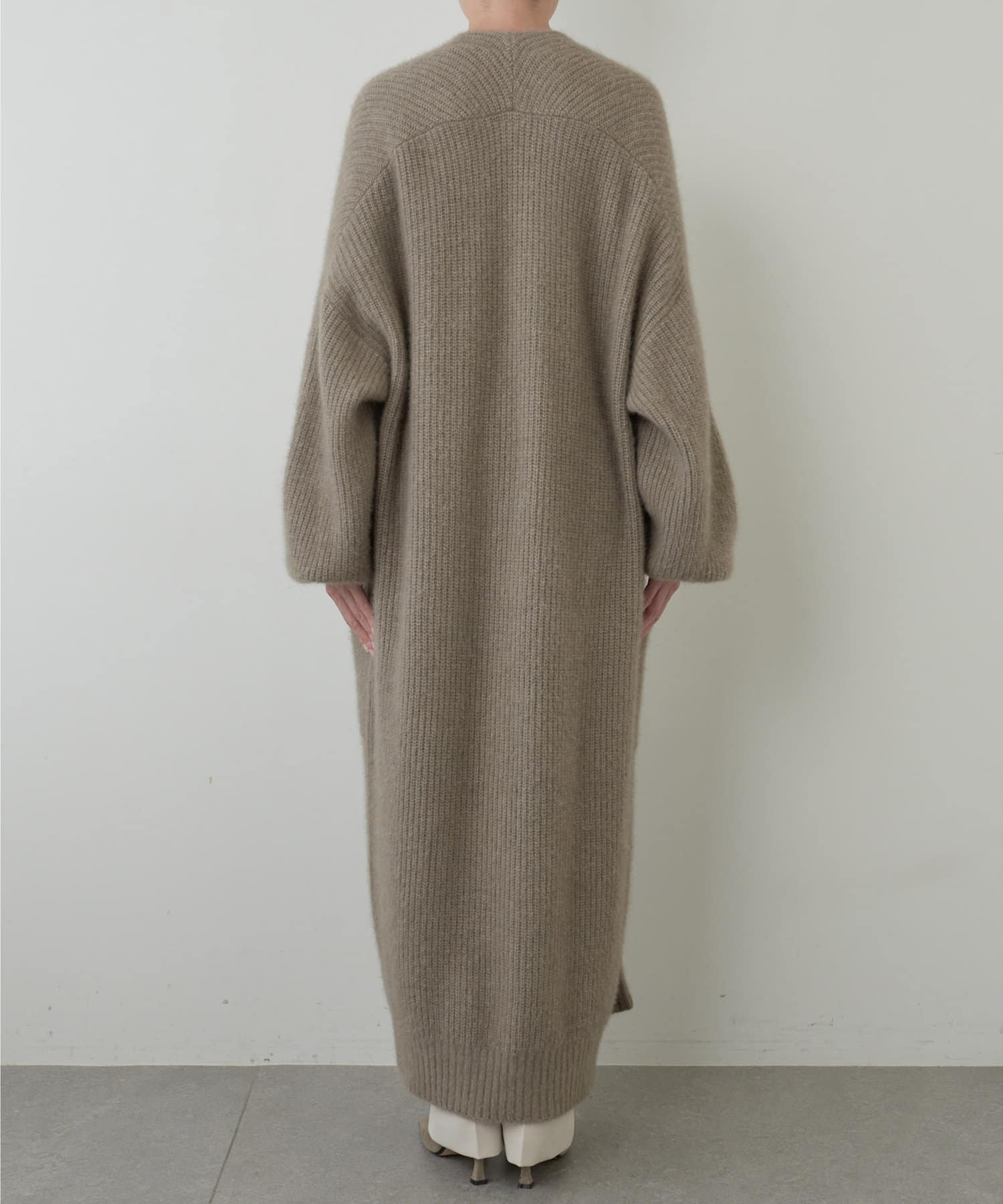 こなれ見えするオーバーシルエットや足首まで届くほどの長めの着丈、片畦の表情のある編み地がポイントで、シンプルコーデに羽織るだけで着映えるデザイン。