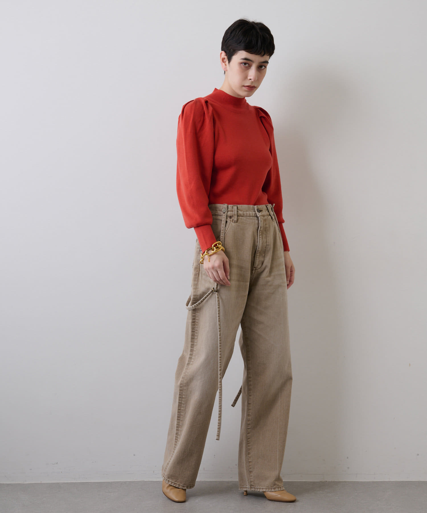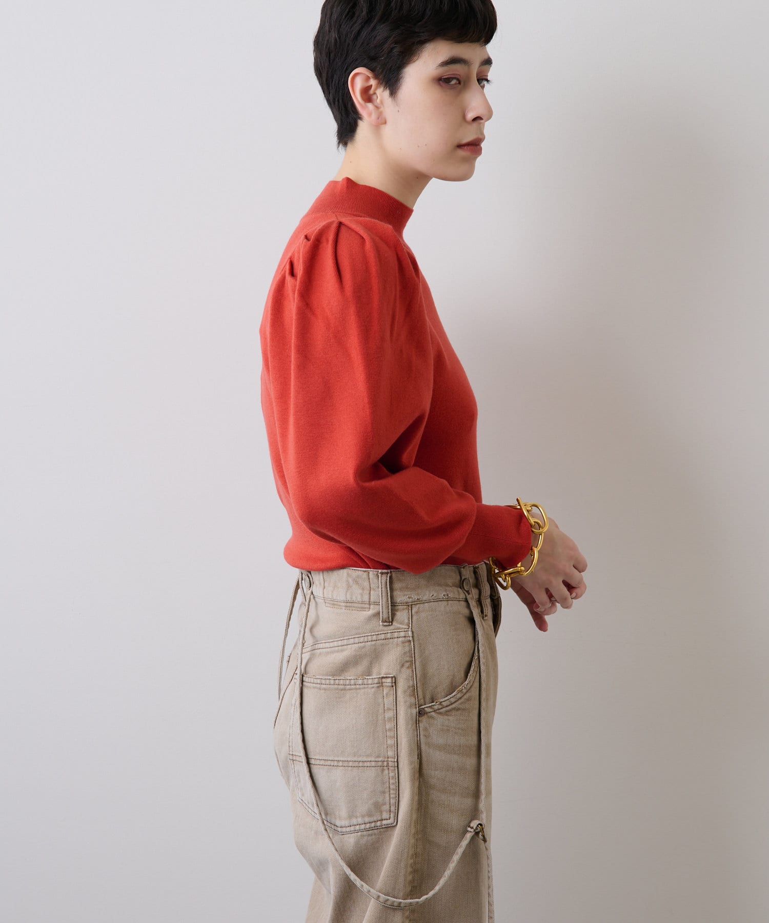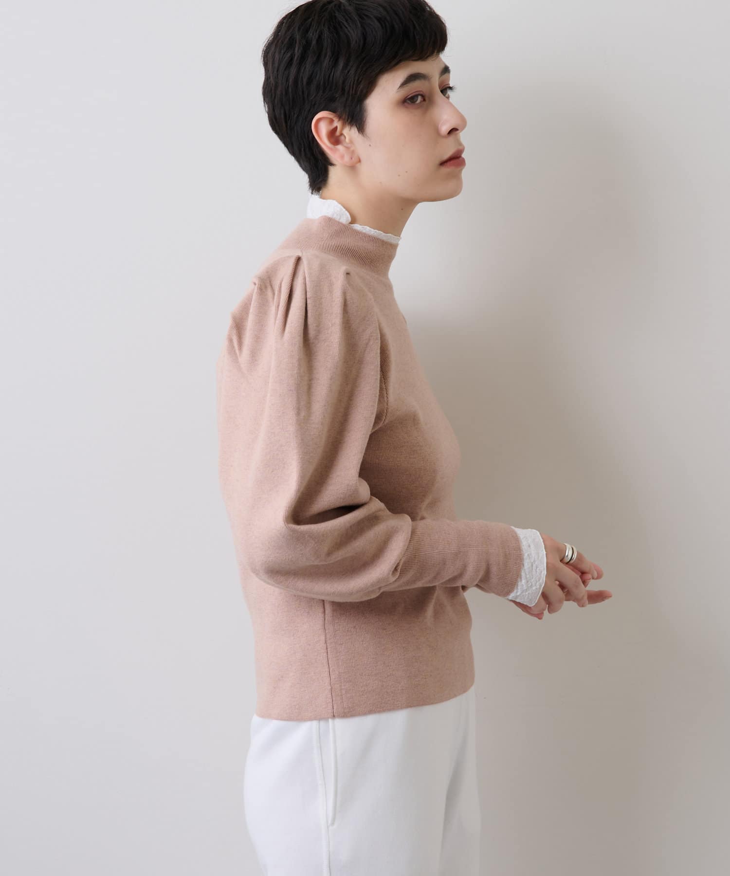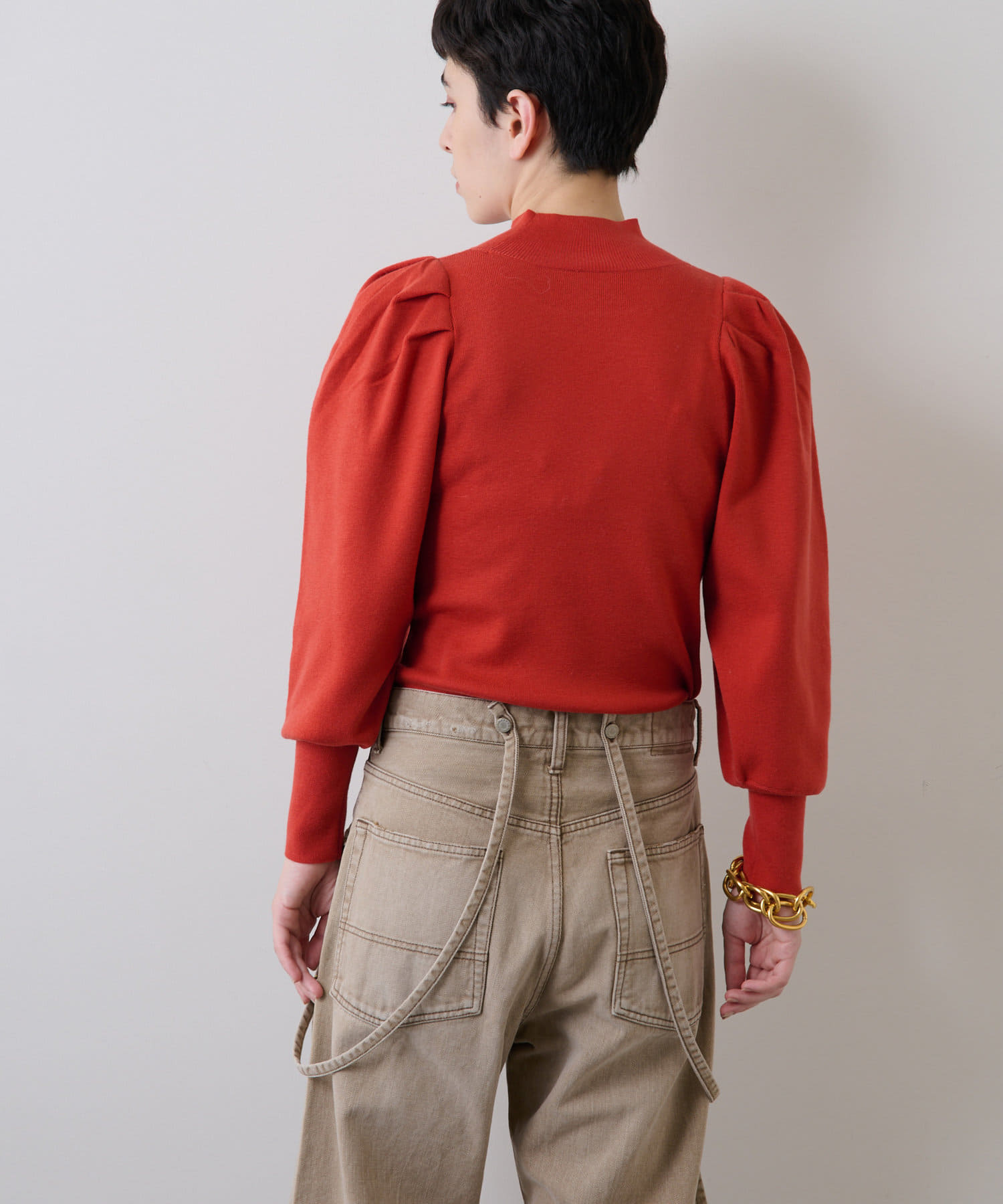 ■スリーブのタックディテールが際立つデザインニット。