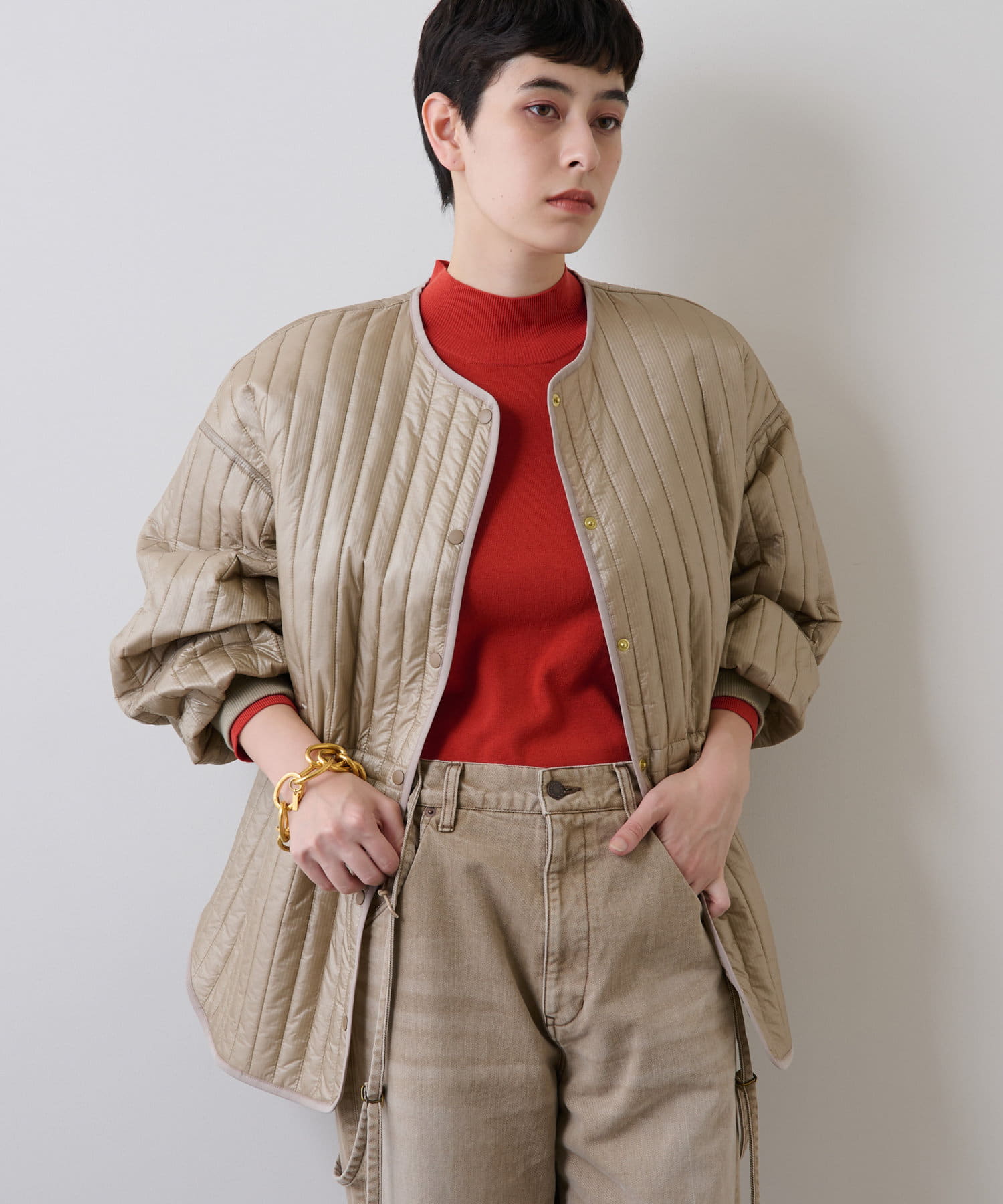 ■スウェットやデニムなどのカジュアルボトムや、辛口のワイドボトムなどと合わせてバランス良く着こなすスタイリングがおすすめ。