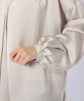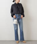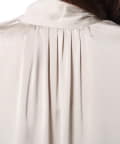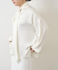 ■襟ぐりと袖口のギャザーがフェミニンな表情のボウタイブラウス。