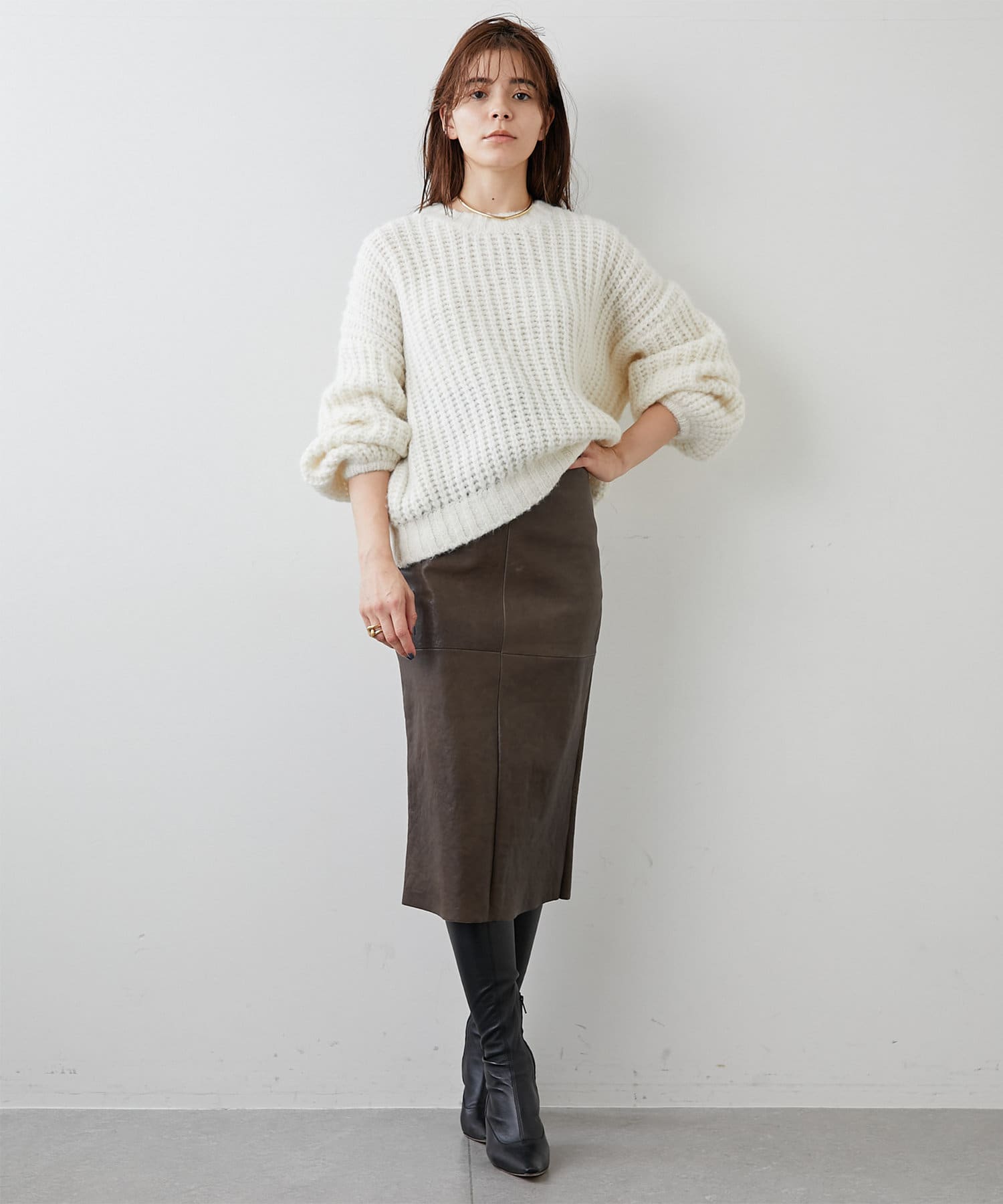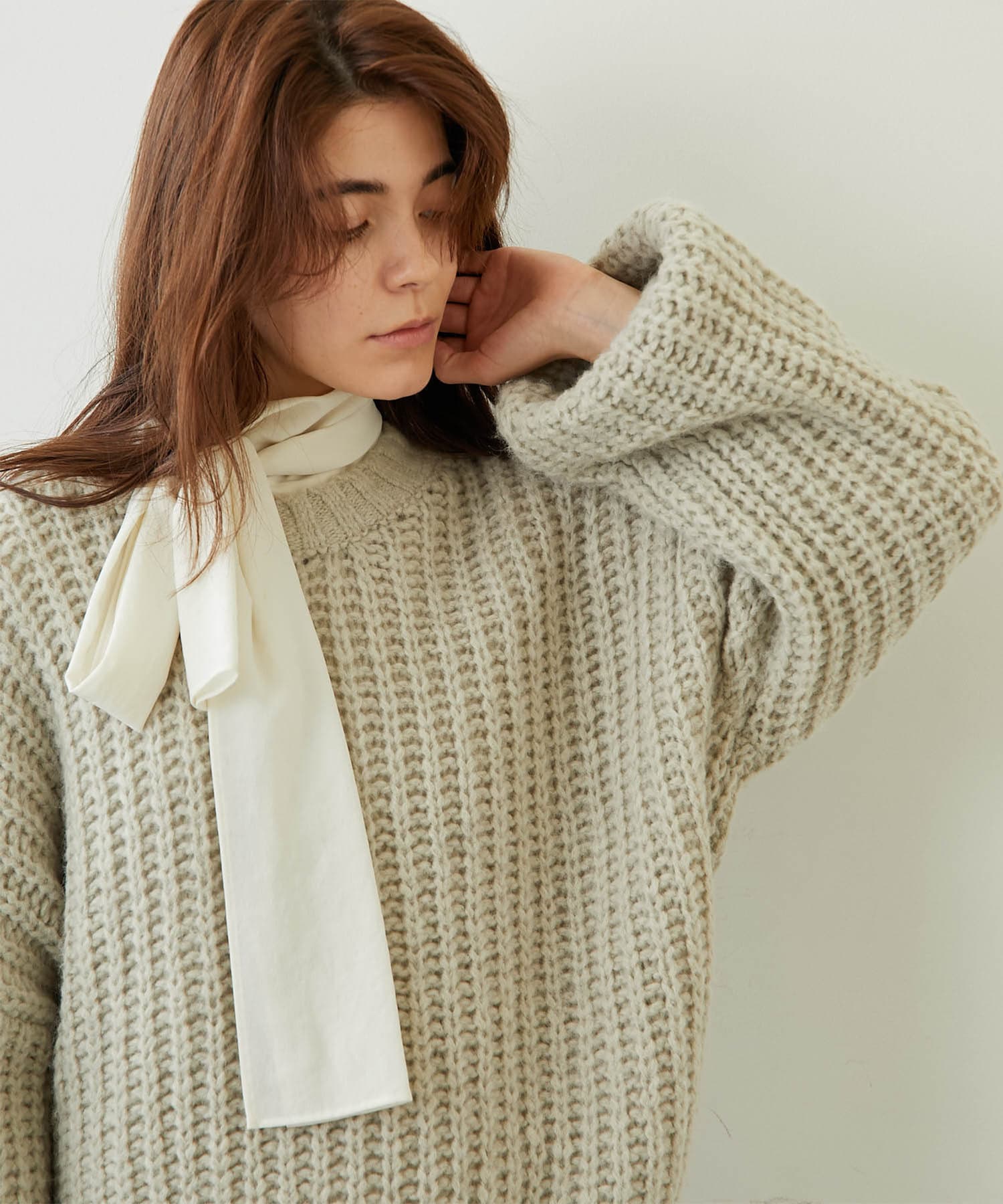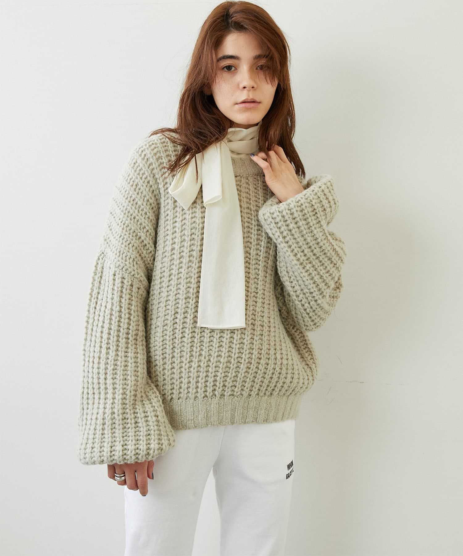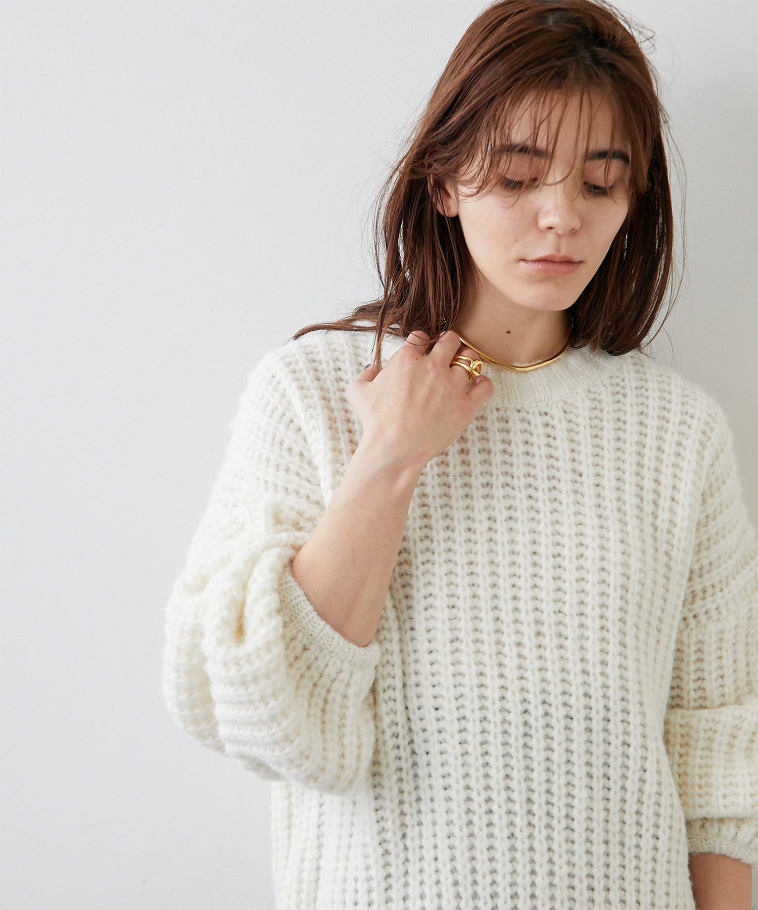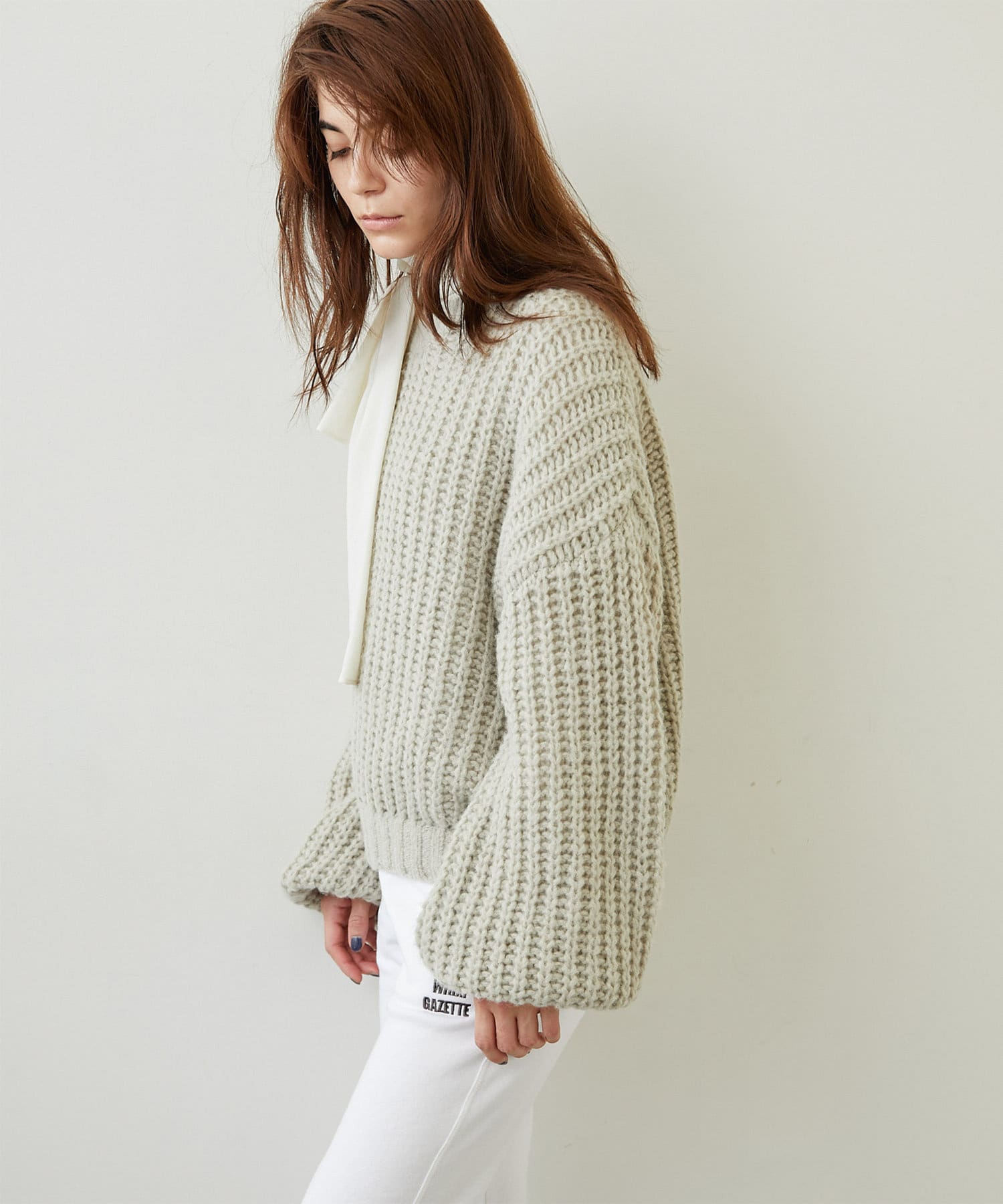 ざっくりとした編みの表情がポイントのニットプルオーバー