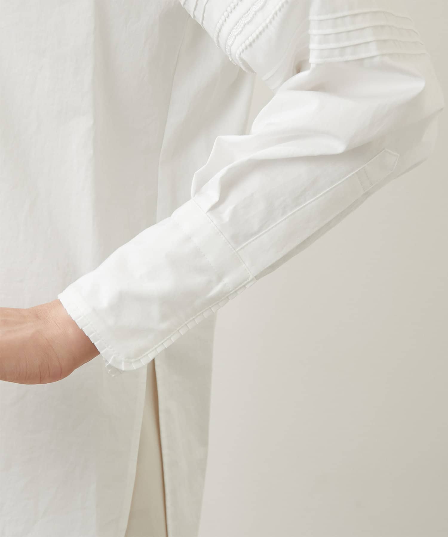 ピンタックやフリルのディテールが映える、ハリのあるコットン生地。手洗い可。