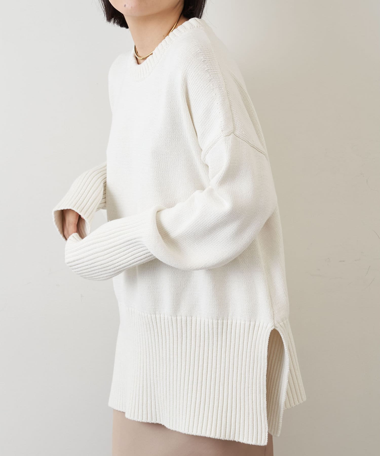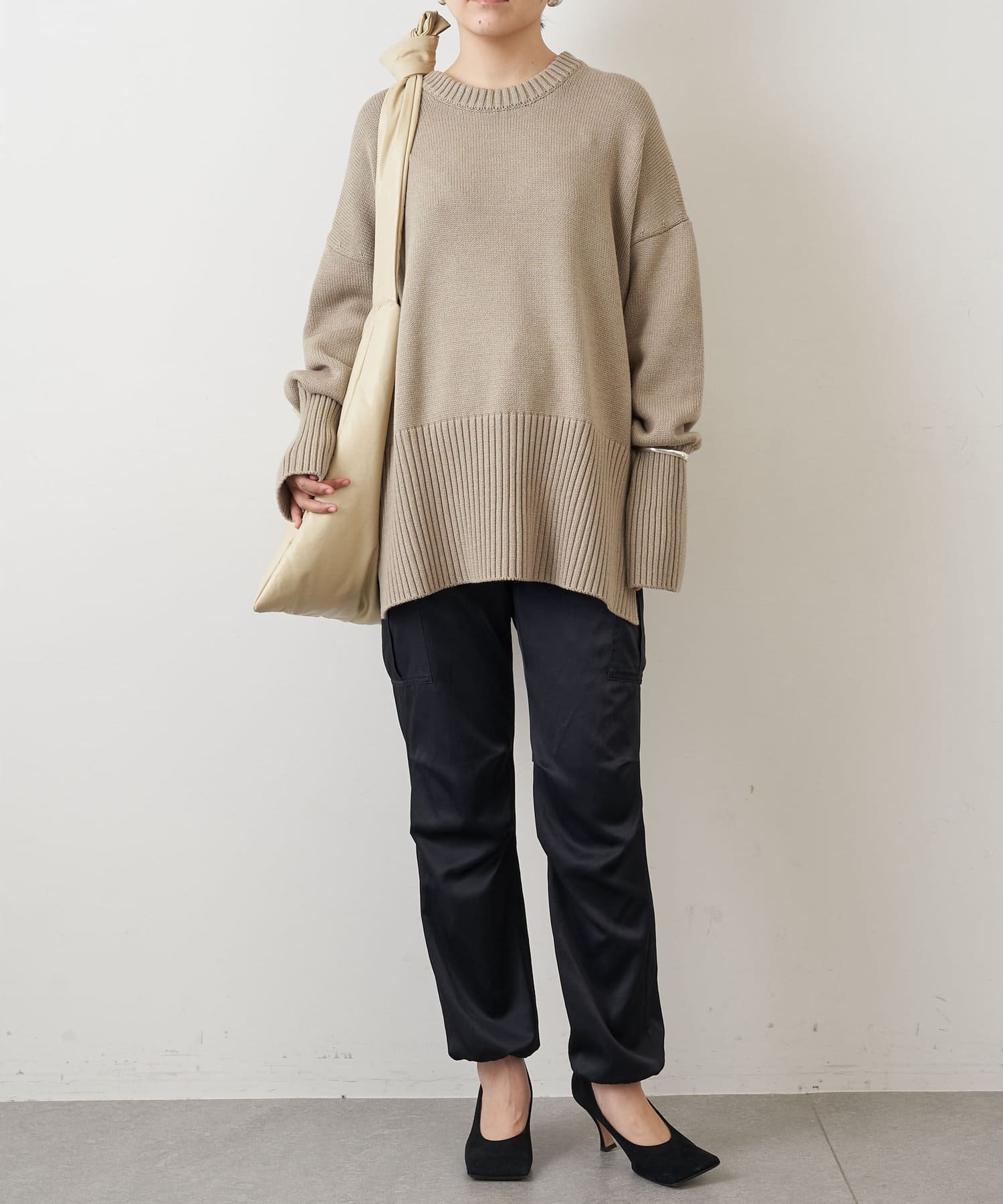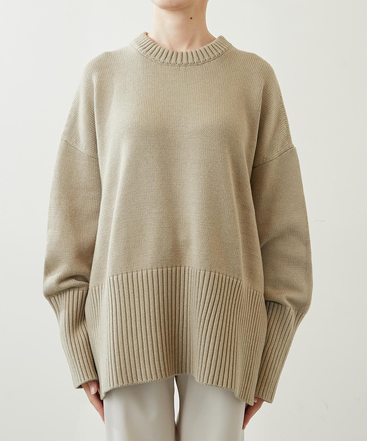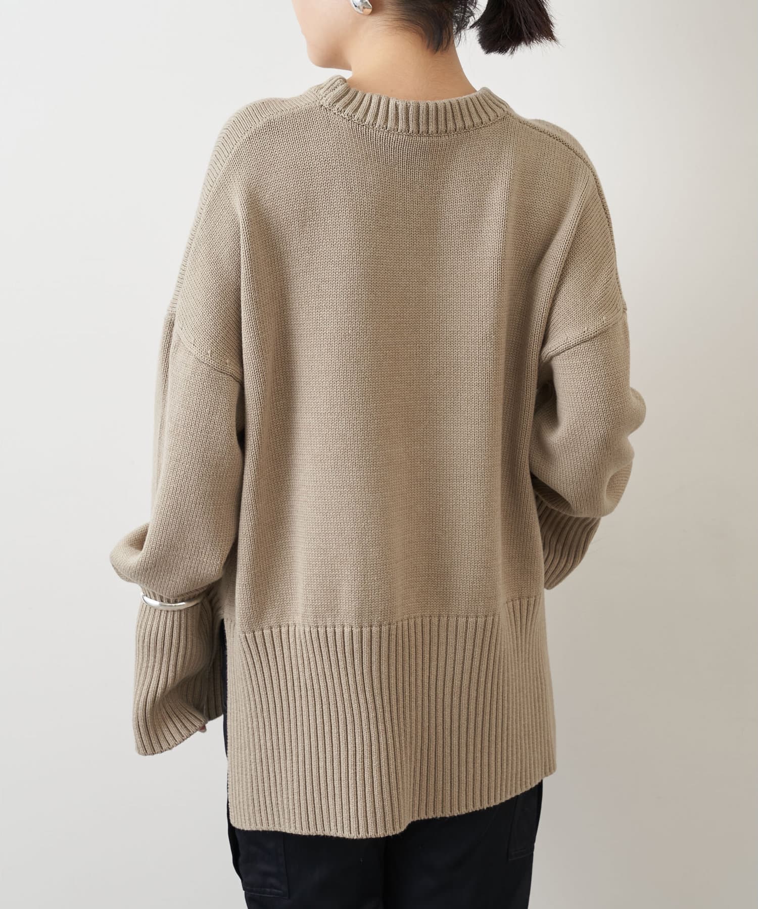 ■プレーンな身頃とワイドスリーブが絶妙バランスなクルーネックニット。