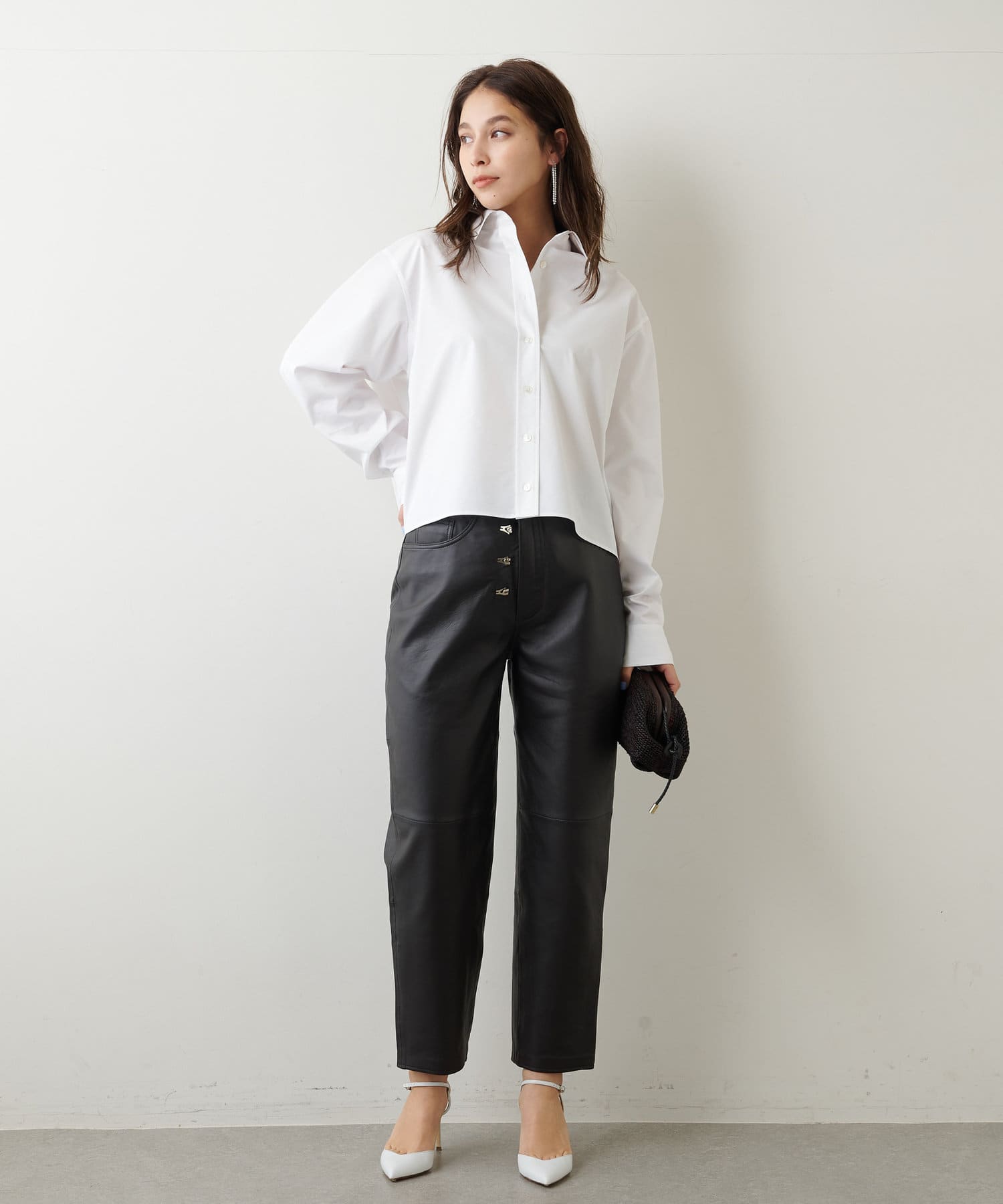 ■フロントのホックディテールは閉じてすっきりと着ても、あえて見せてアクセントをプラスするのもおすすめ。