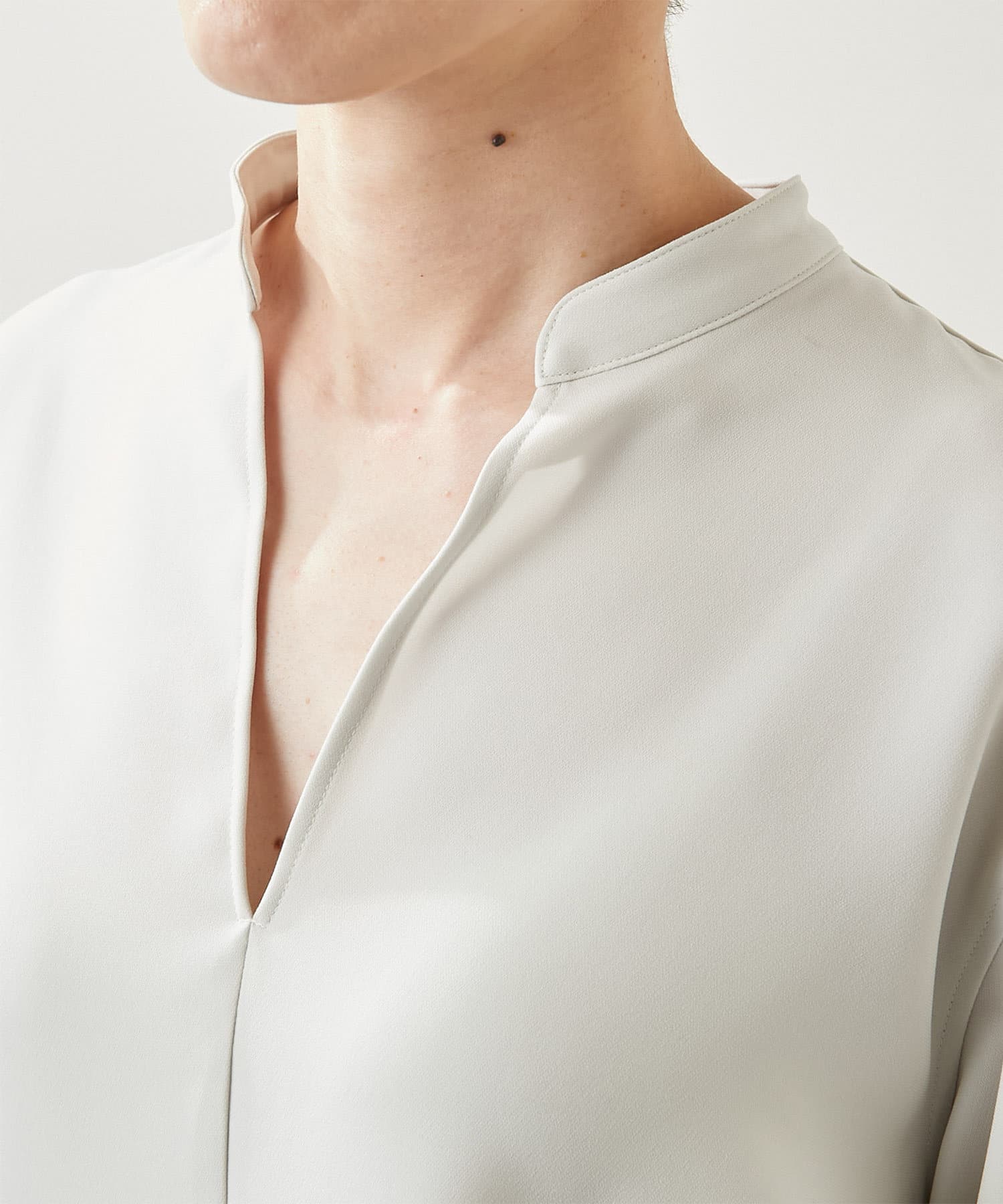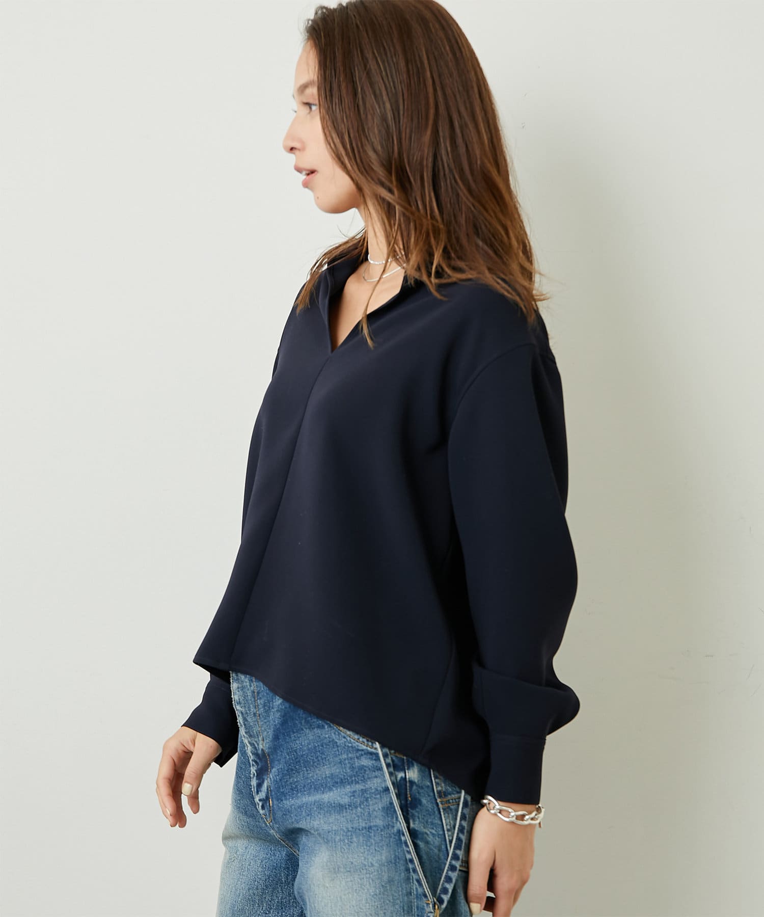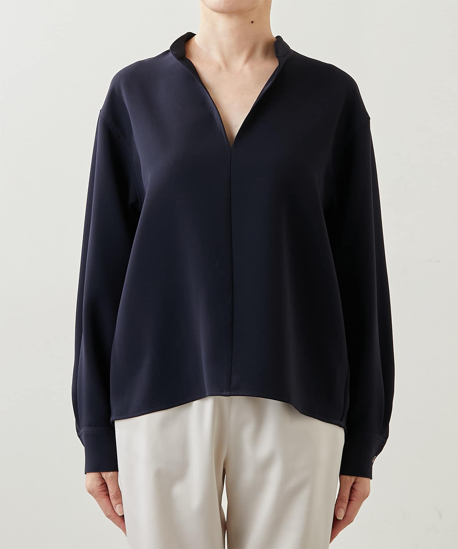 ■デコルテを美しく見せてくれるV開きのスキッパーブラウス。