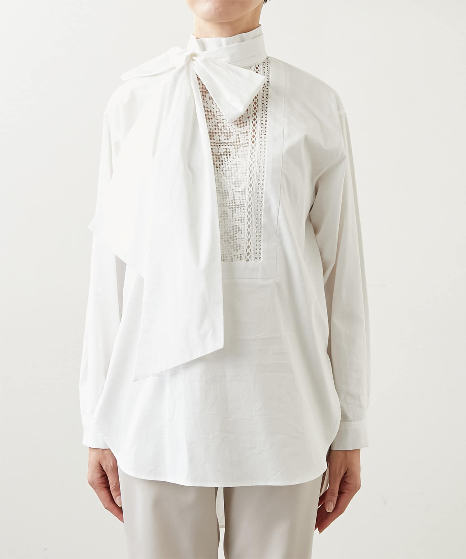 一枚で着映える、繊細なレース使いが美しいボウタイブラウス