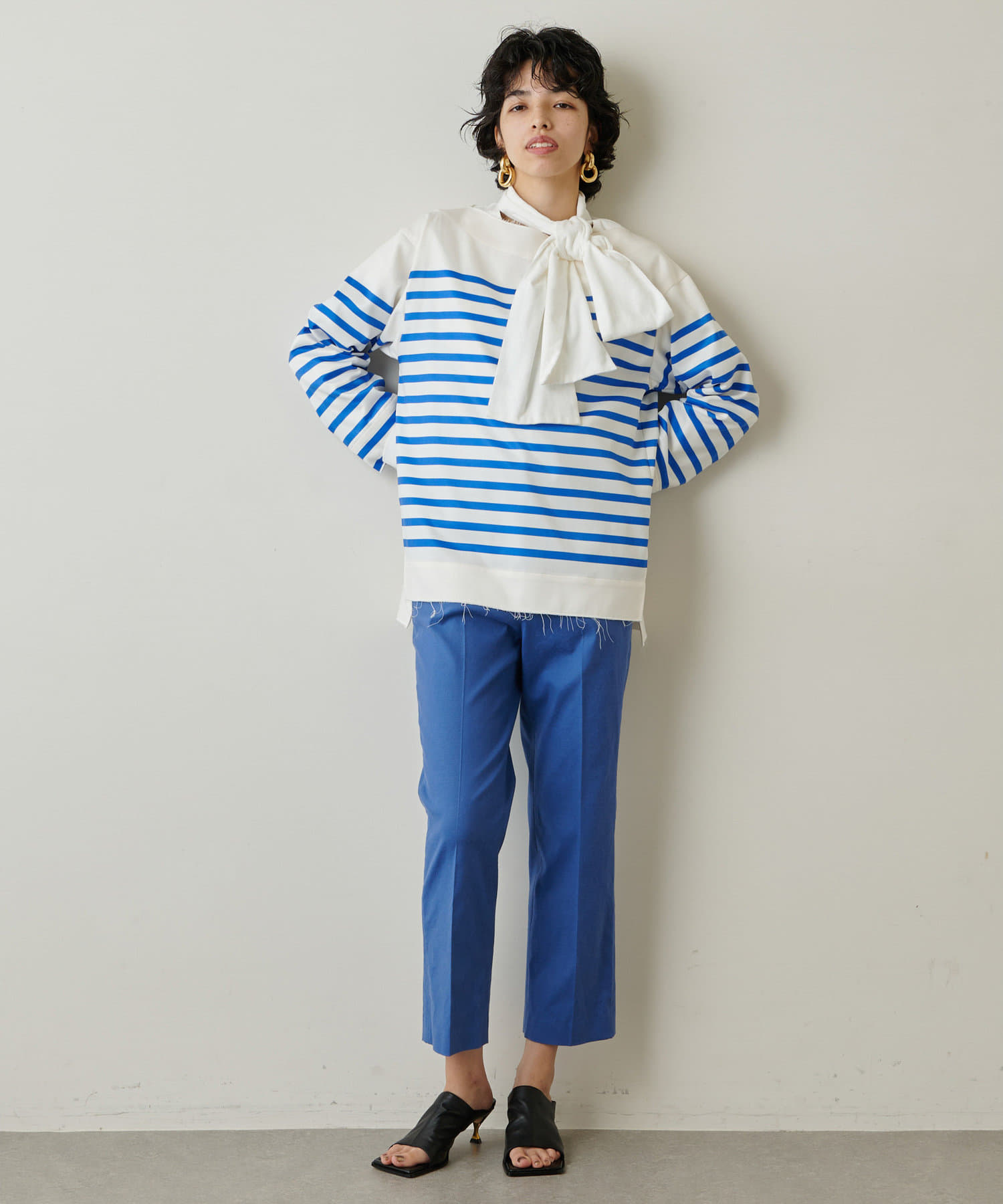 ■ボウタイの隙間から覗くデコルテが、女性らしさと軽さをプラスするVネック開き。
