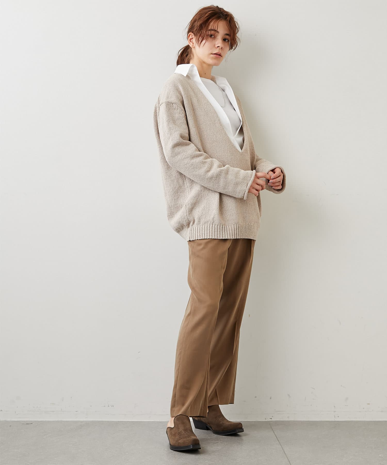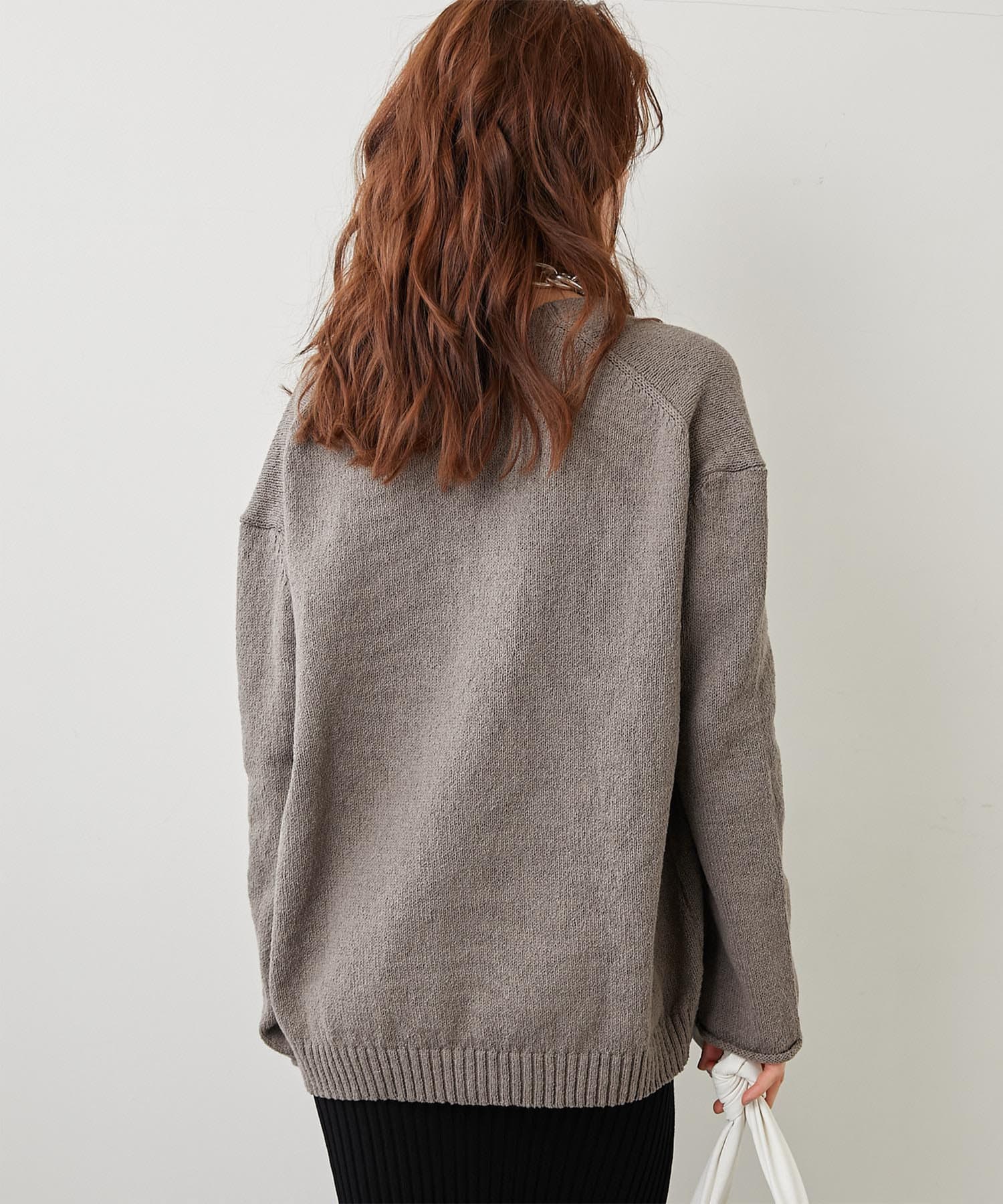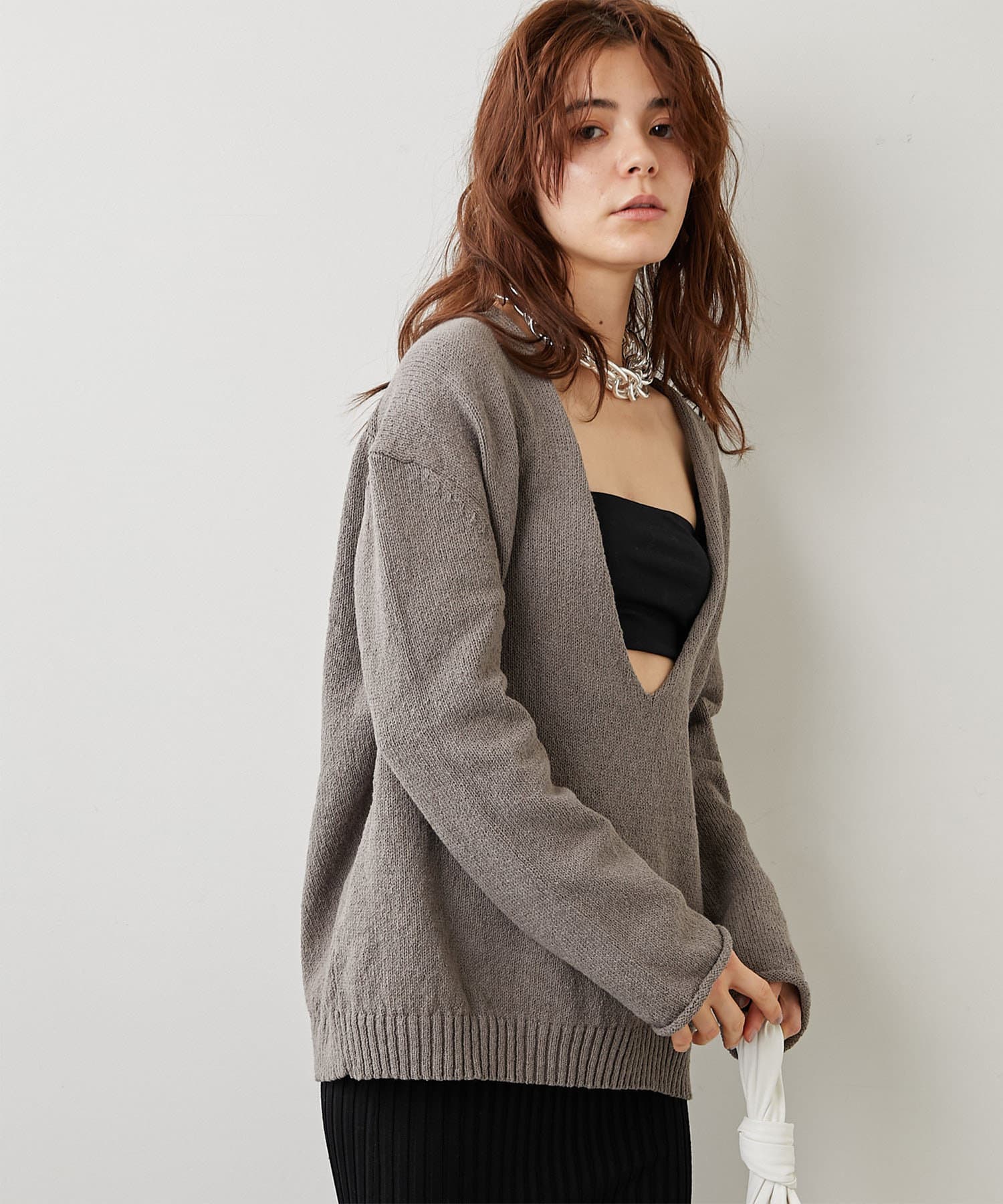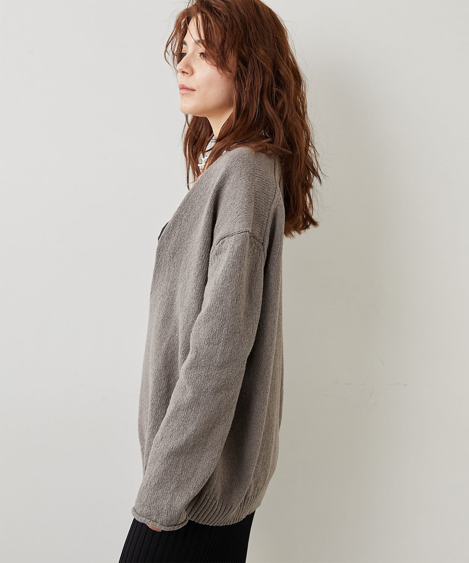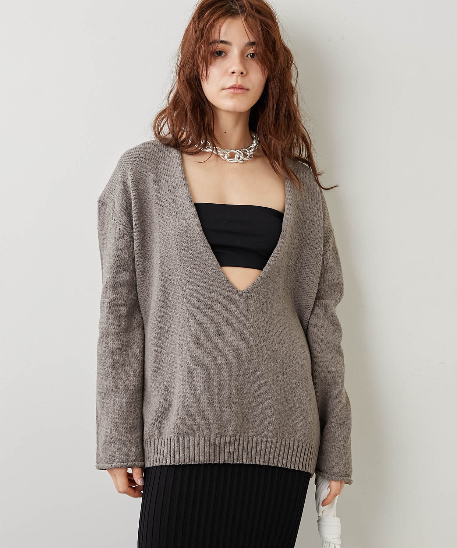 ■ワイドシルエットに深めのVネックが特徴的なニットプルオーバー。
