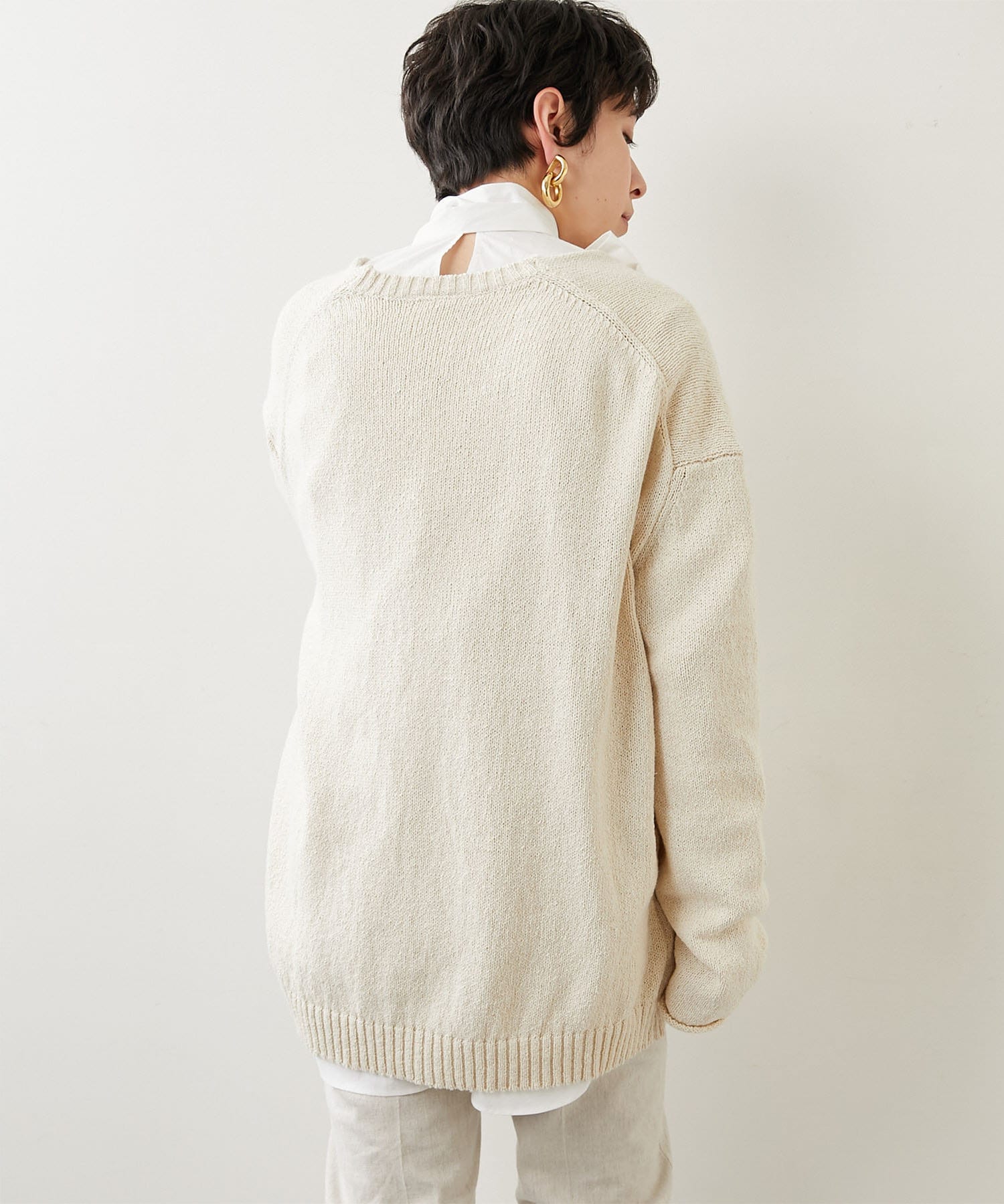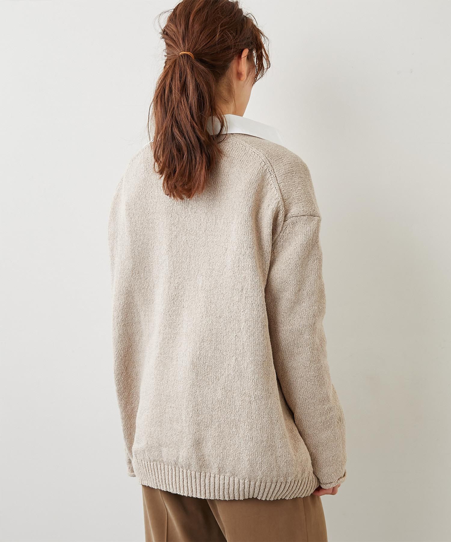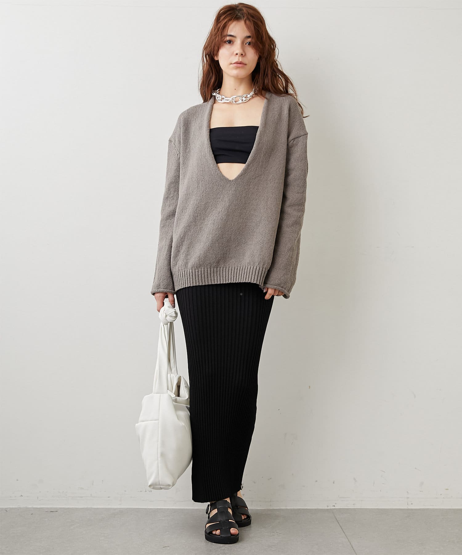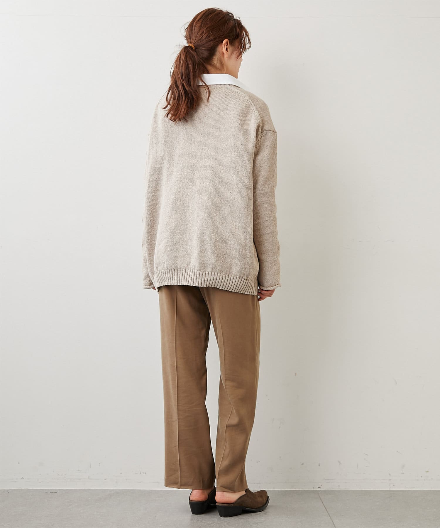 ■ワイドシルエットに深めのVネックが特徴的なニットプルオーバー。