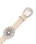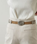 ■柔らかなスエード素材のベルトに、おおぶりなコンチョをあしらったデザイン。