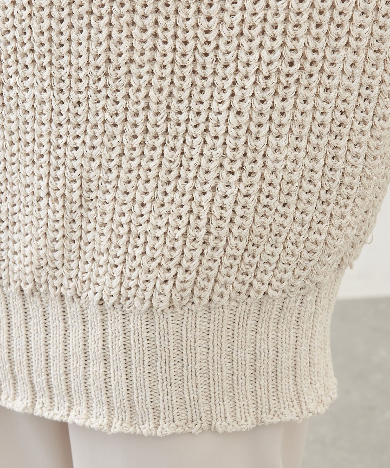 清涼感を高めるためにカベ糸調に仕上げたTSUMUGIと、扁平感を出すようリリヤーン加工したCOTTON LILYの二素材を惹き揃え、豊かな表情を出した編地。