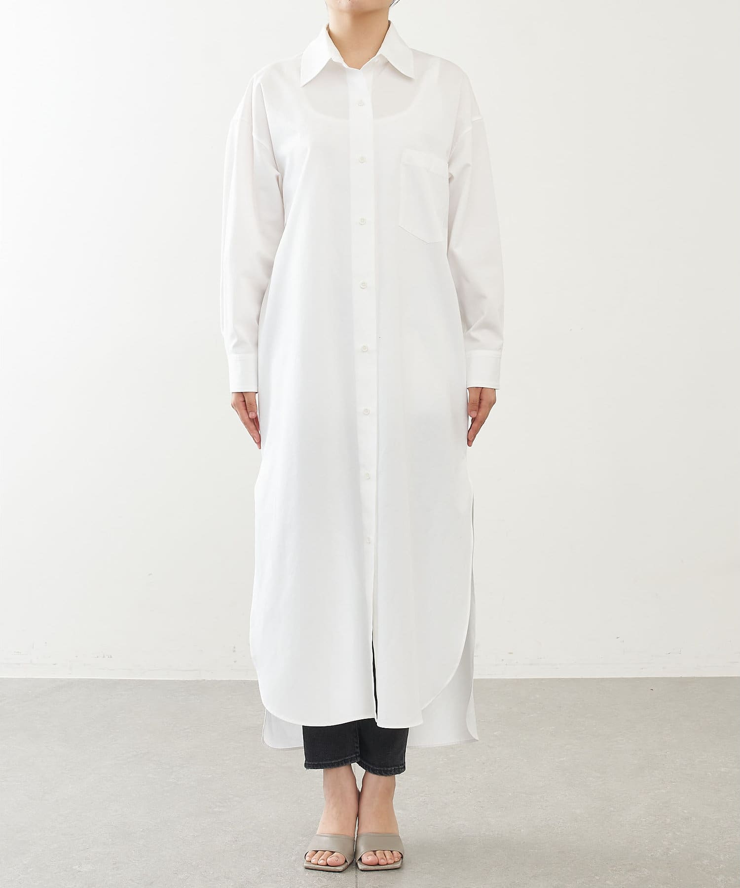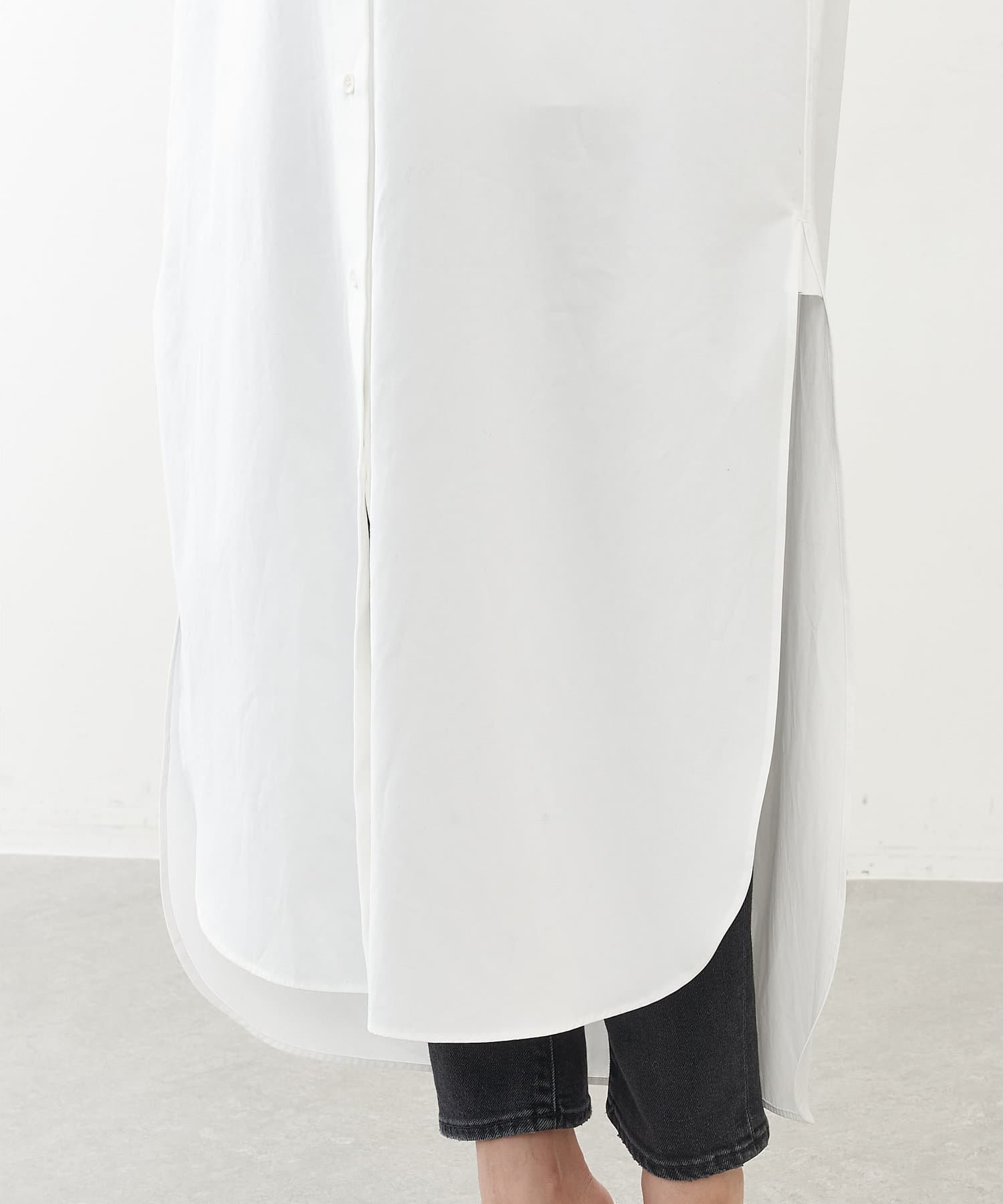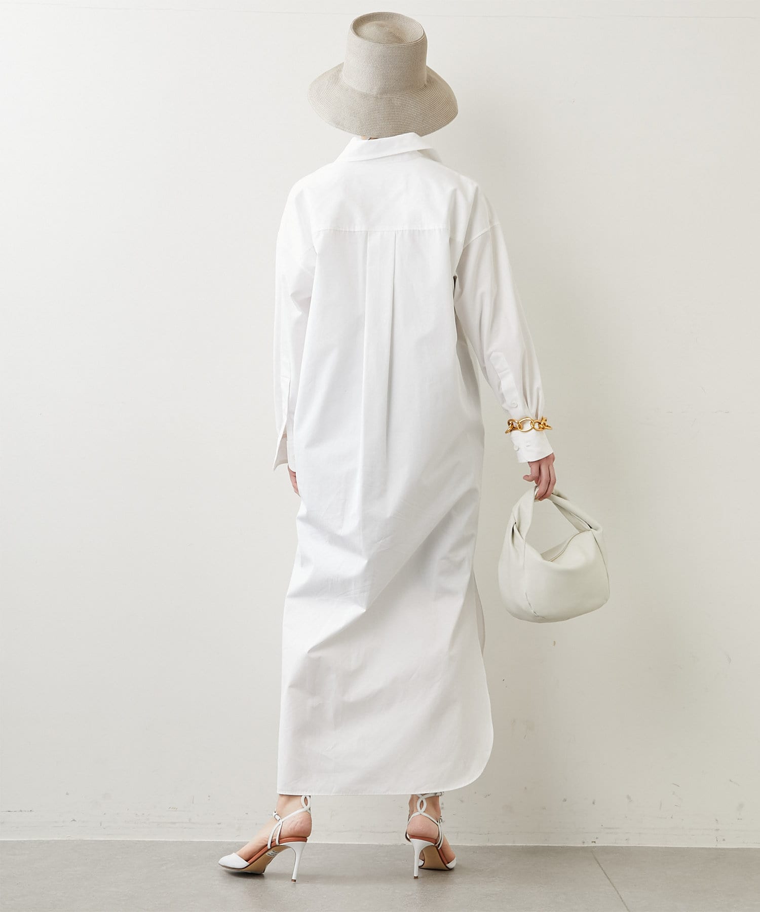 ■ハリとシャリ感のあるコットンポプリンを使用したロングシャツワンピース。