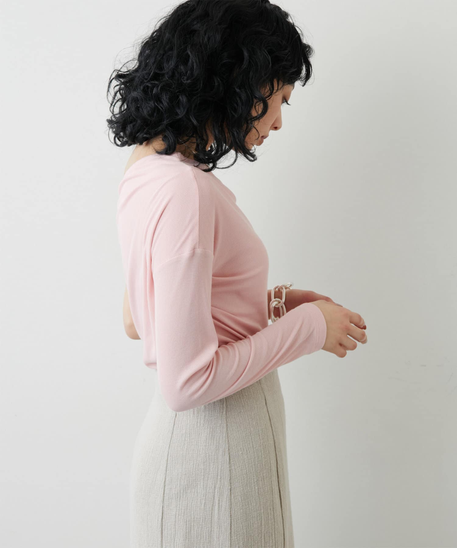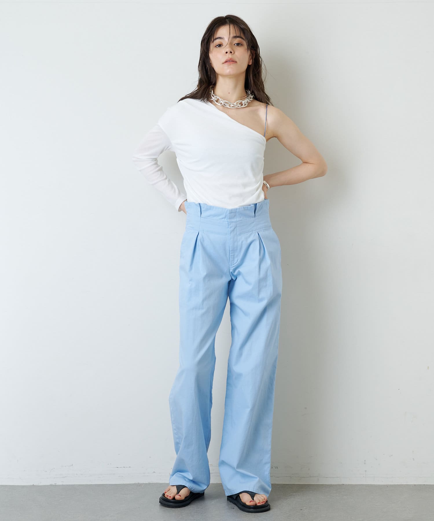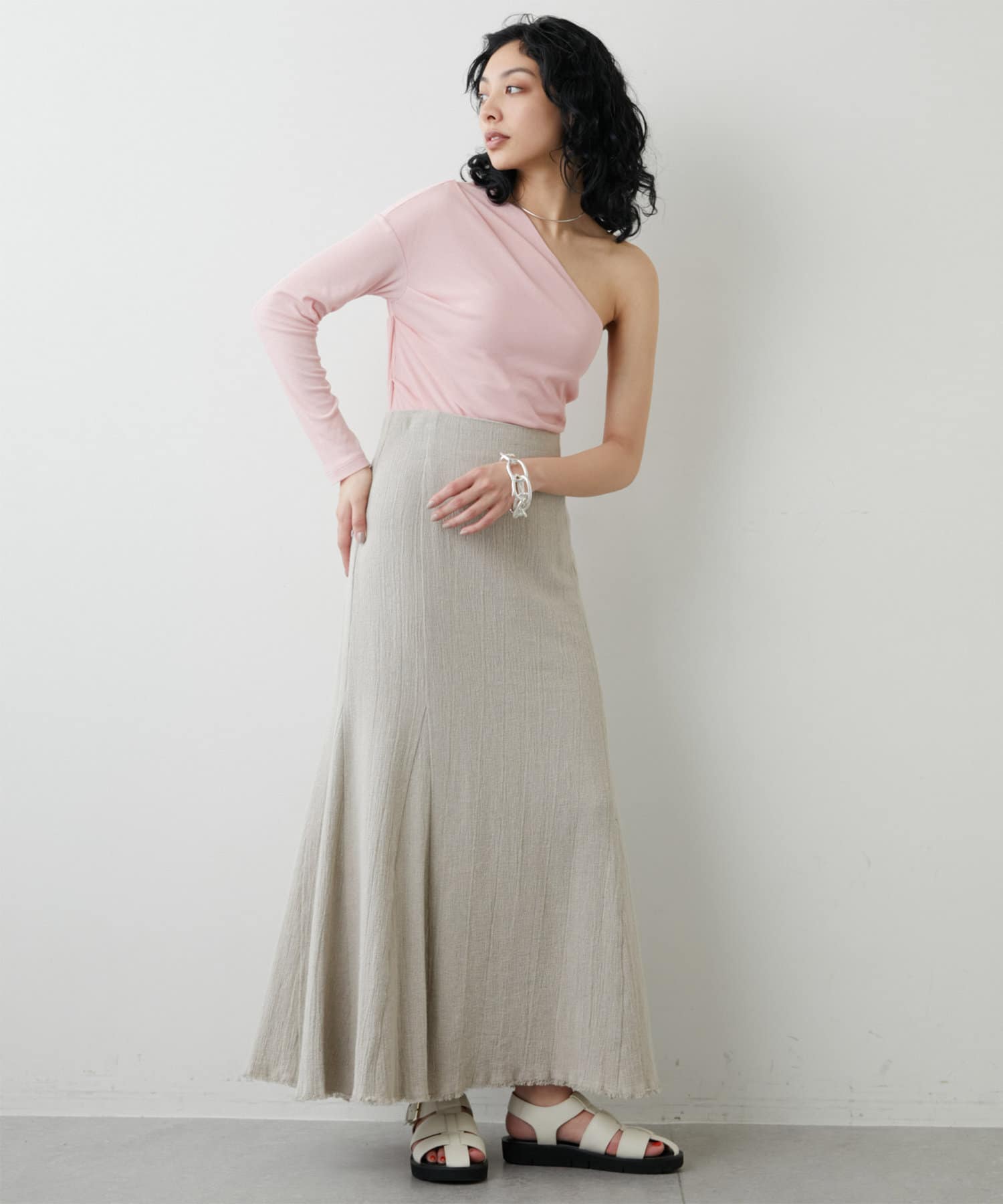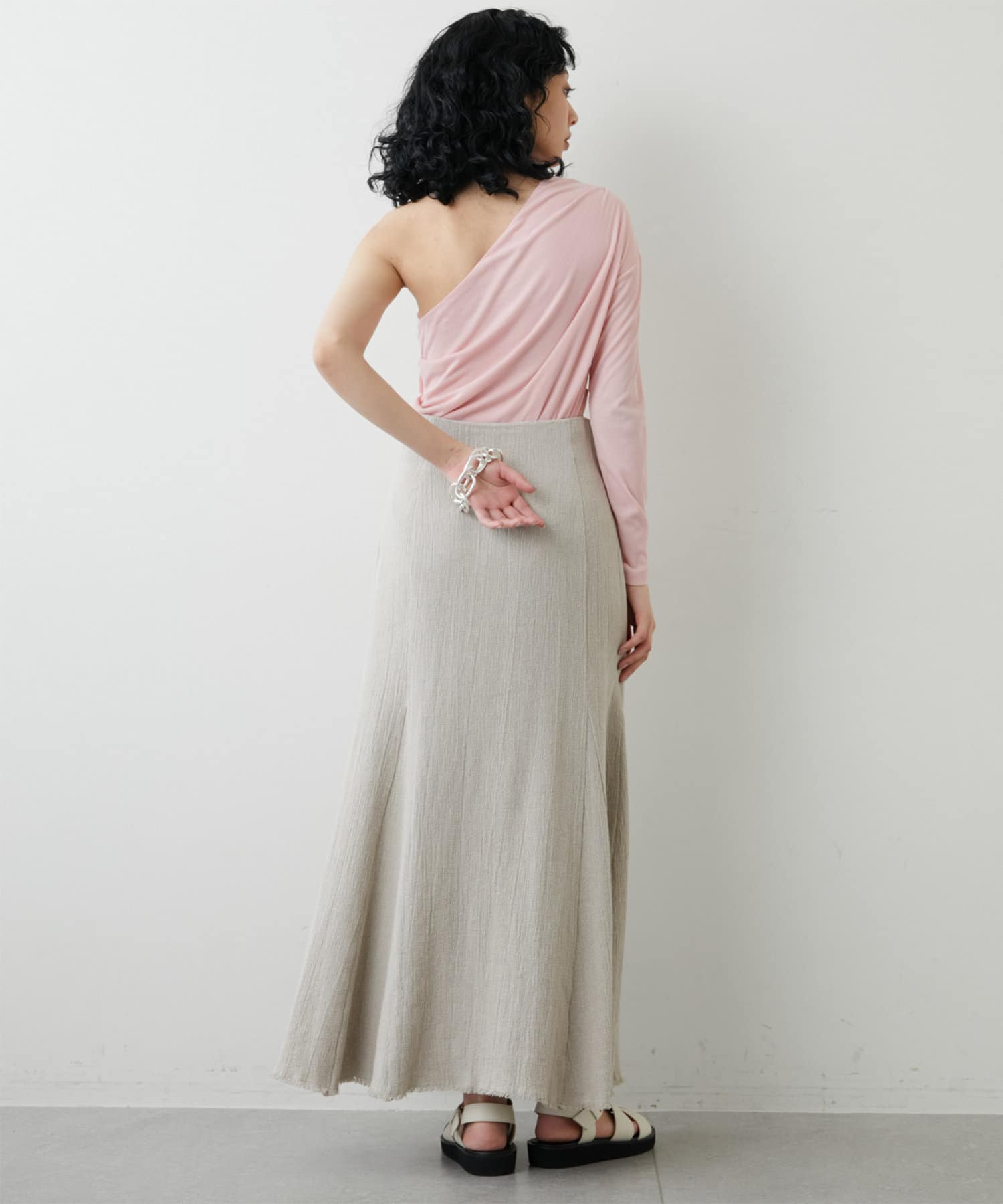 ■大胆に開いたネックラインがデコルテを美しく演出するワンショルダーカットソー。