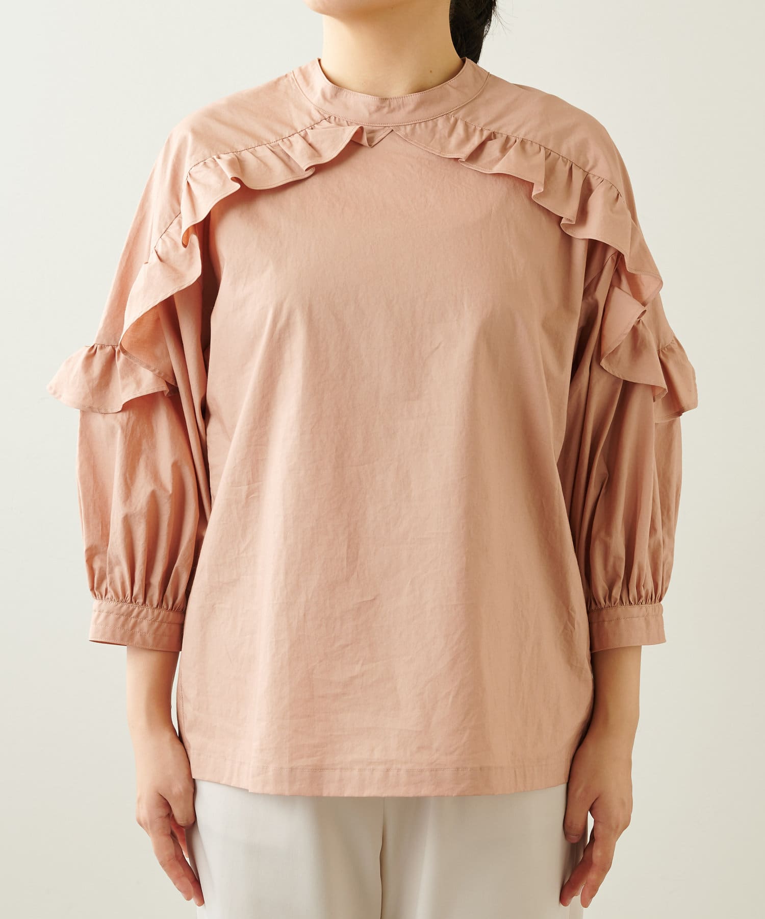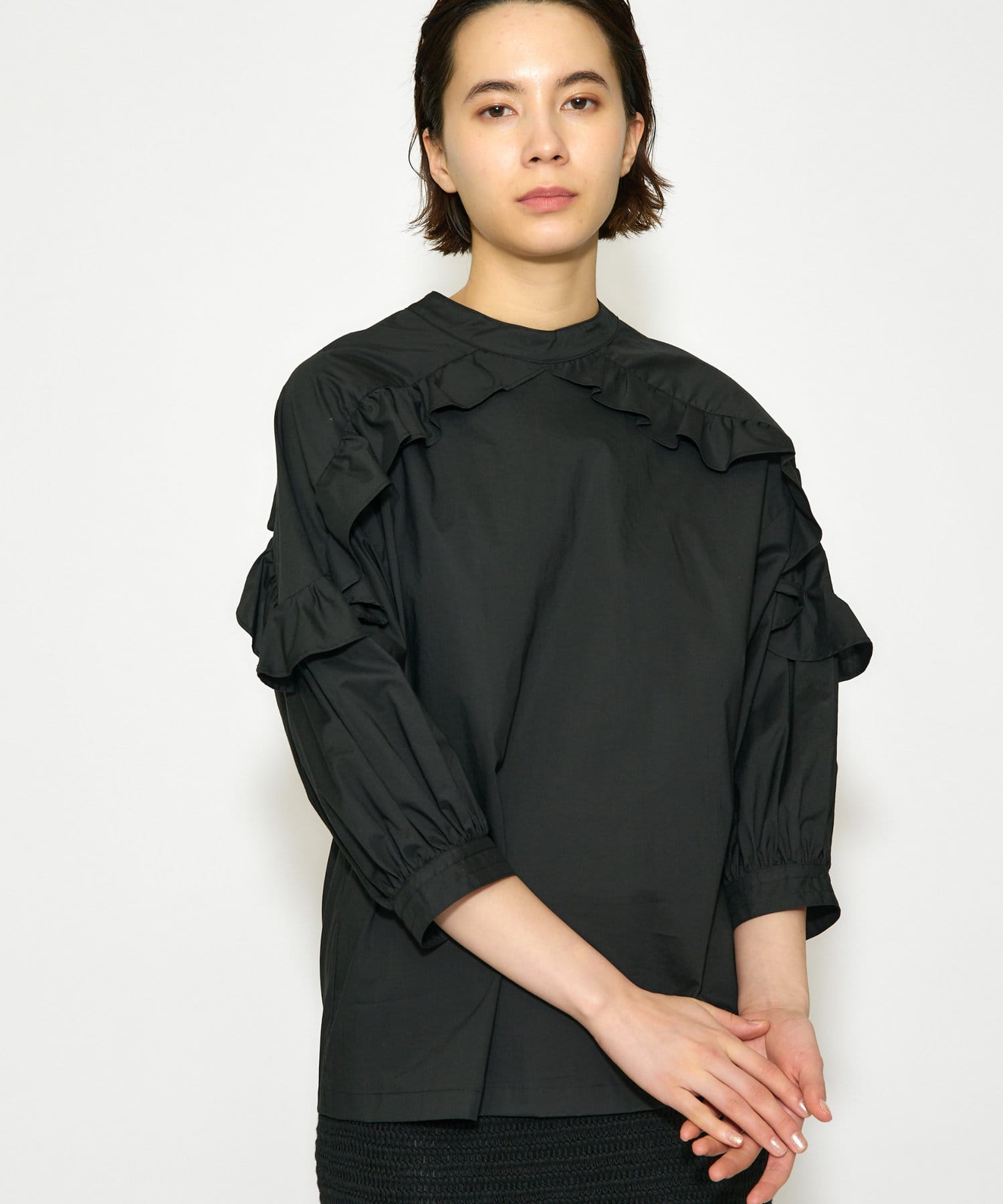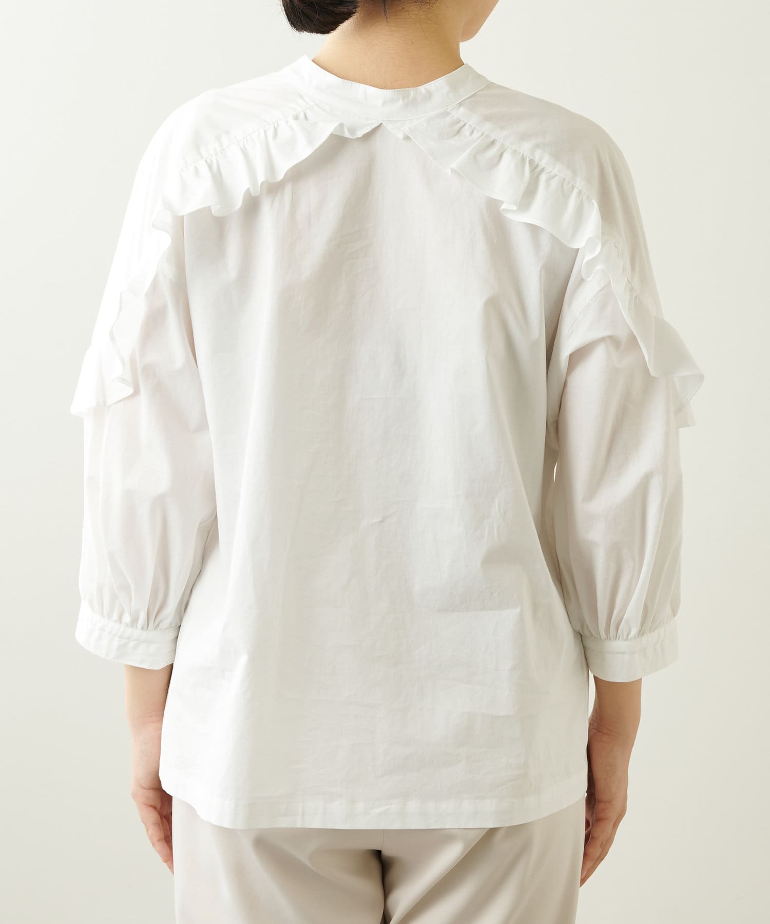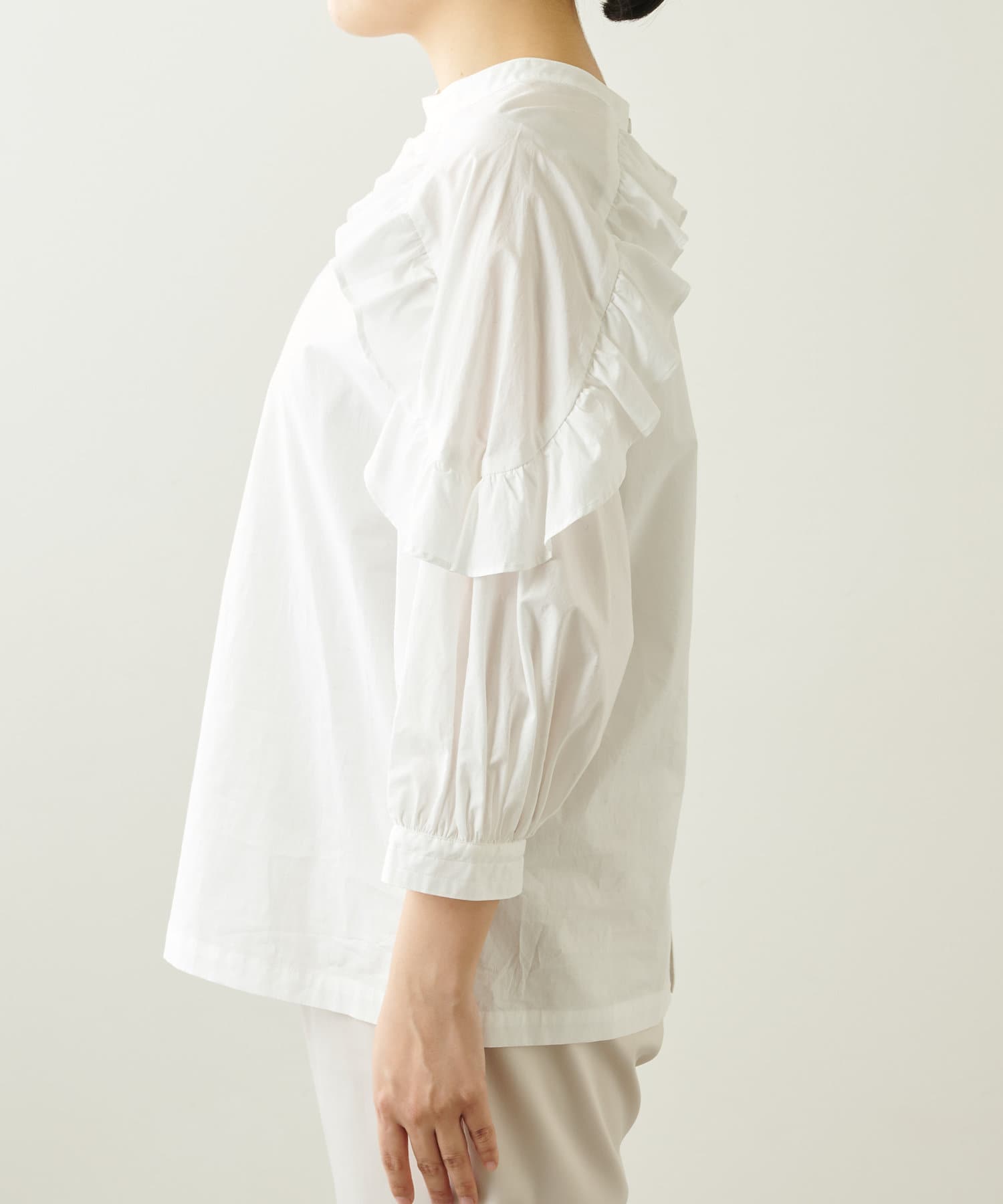 ■肩から袖にかけてあしらったフリルが華やかなデザインブラウス。