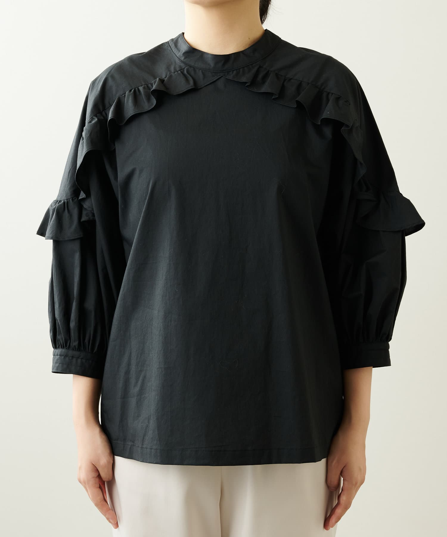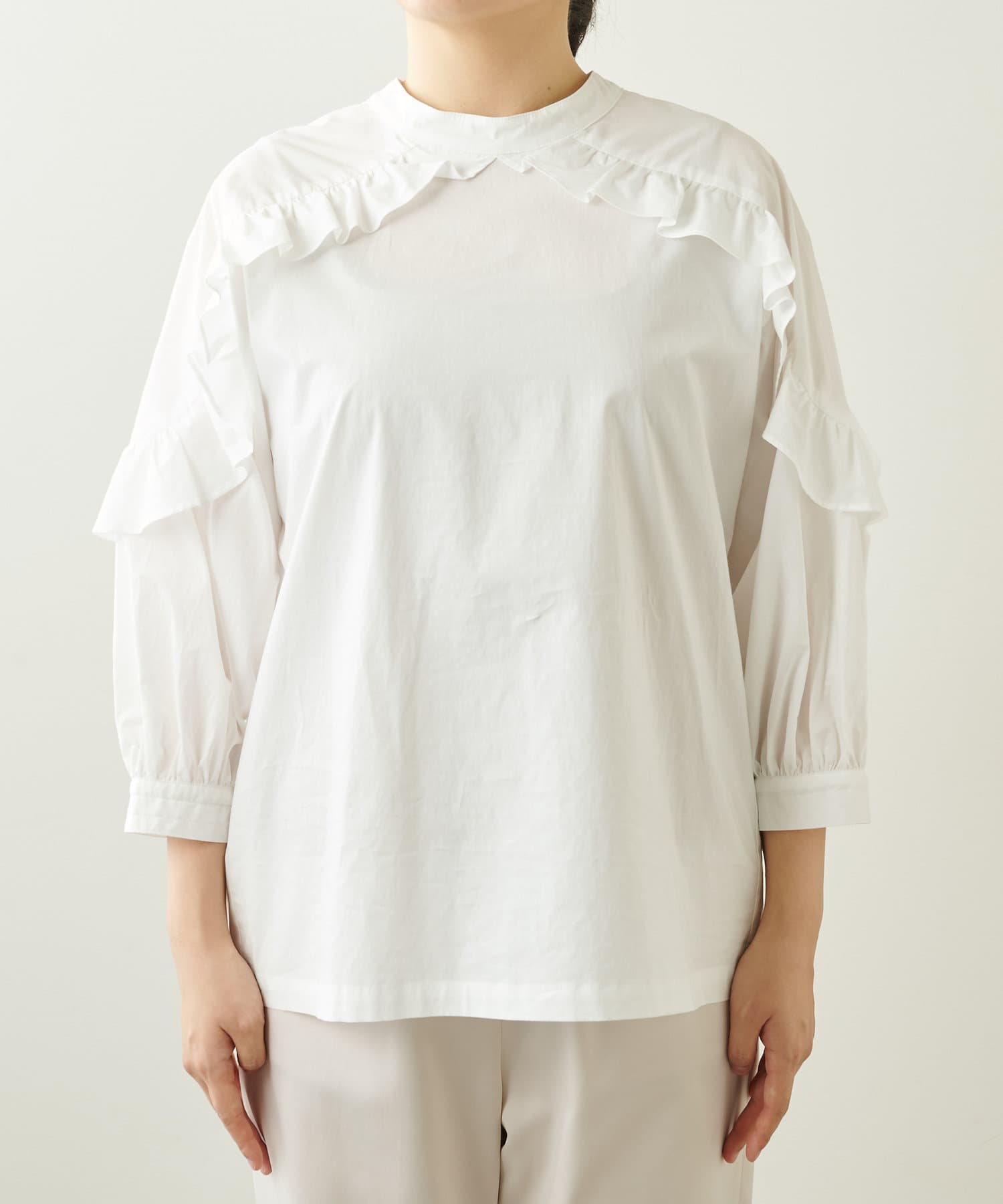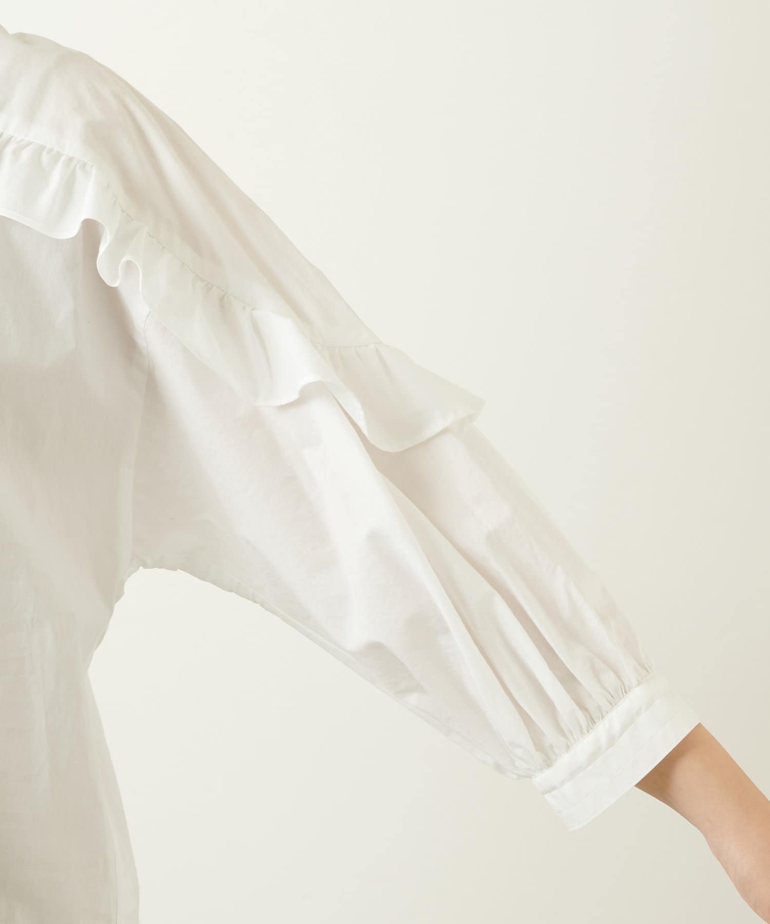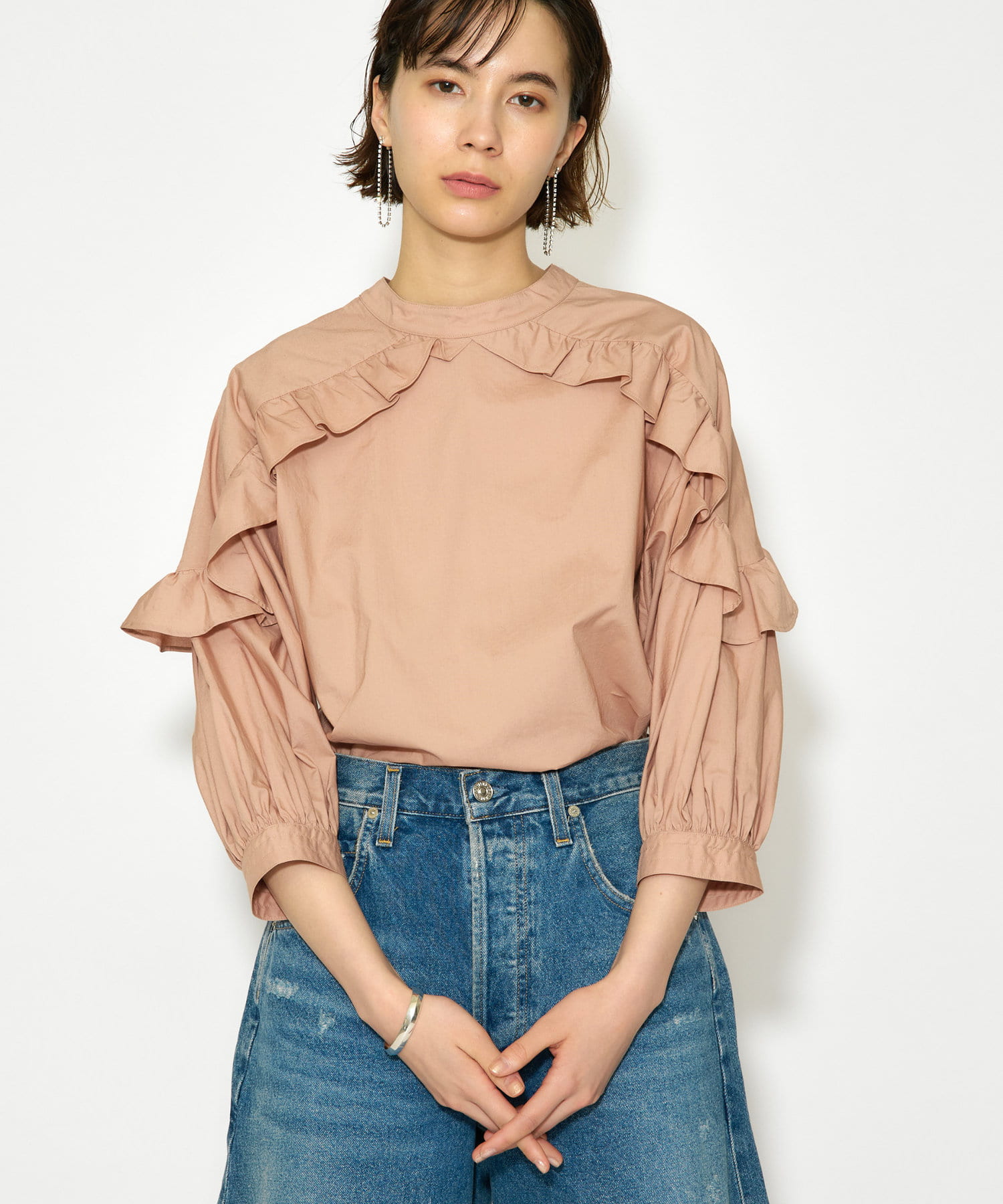■肩から袖にかけてあしらったフリルが華やかなデザインブラウス。