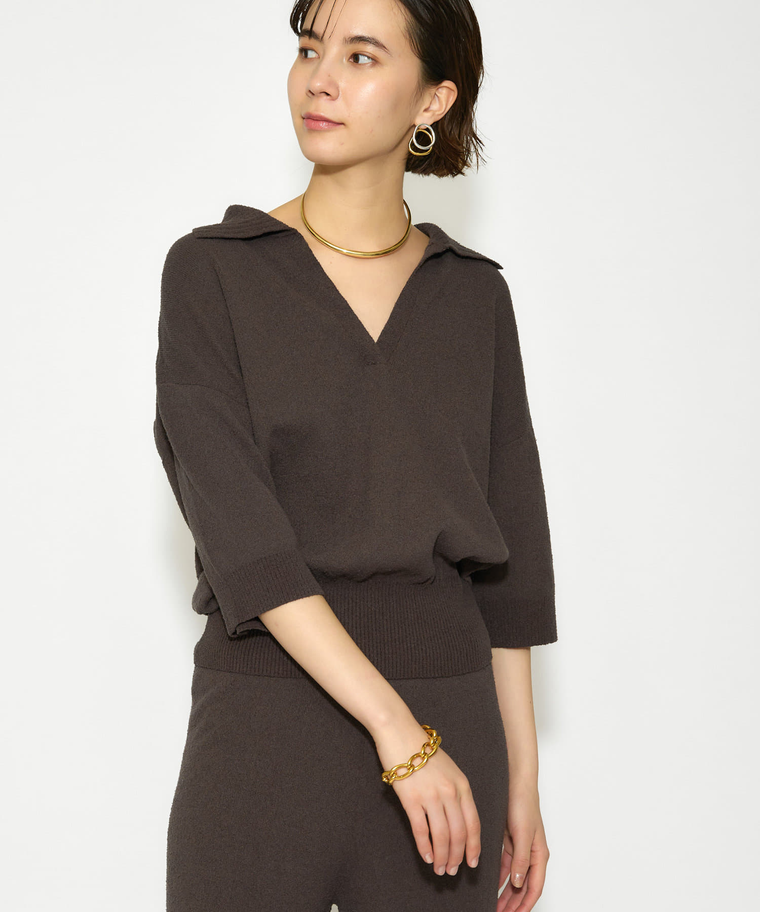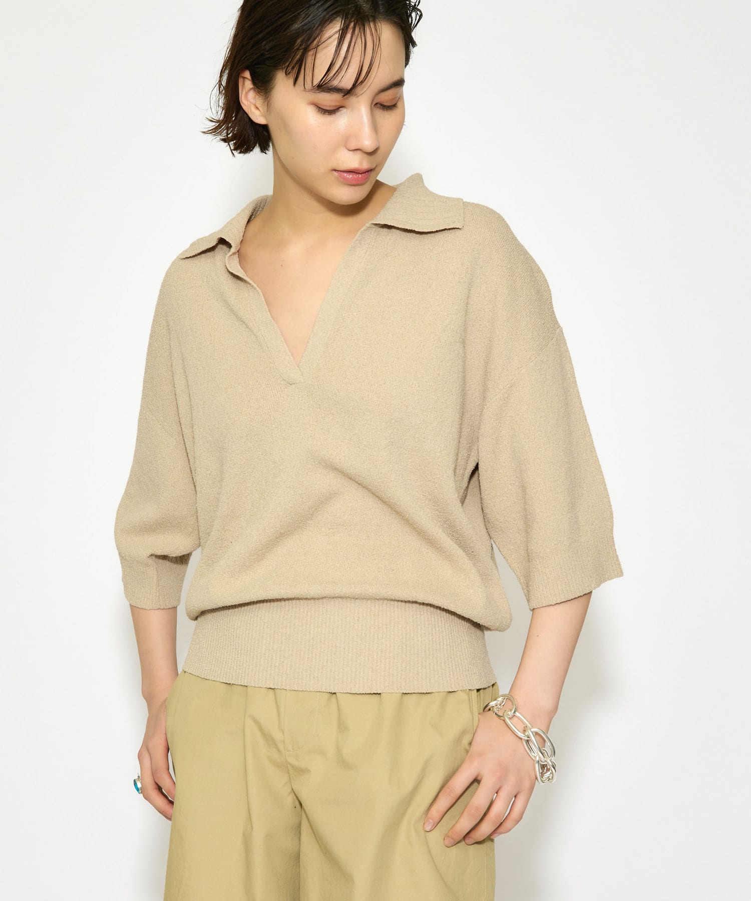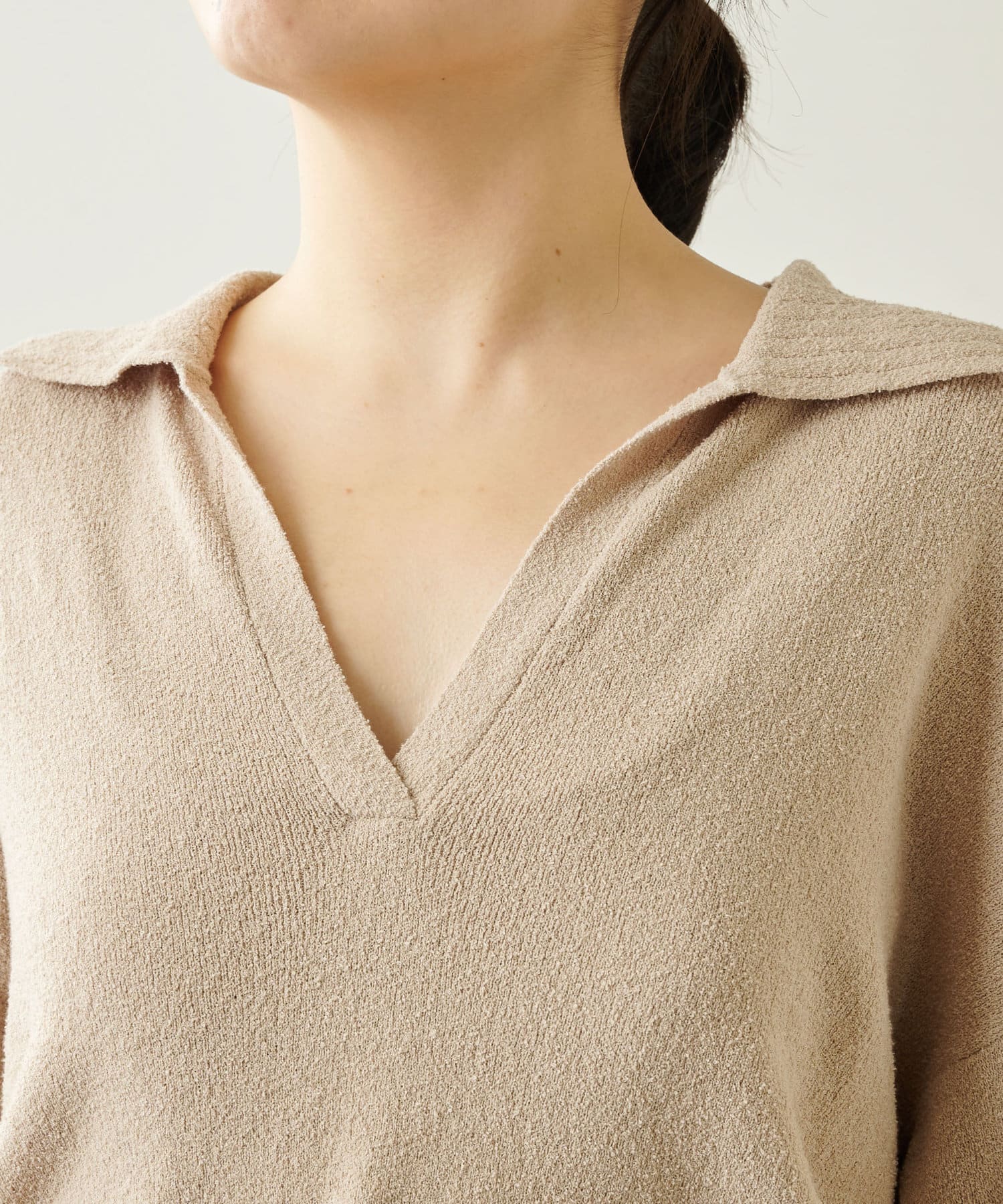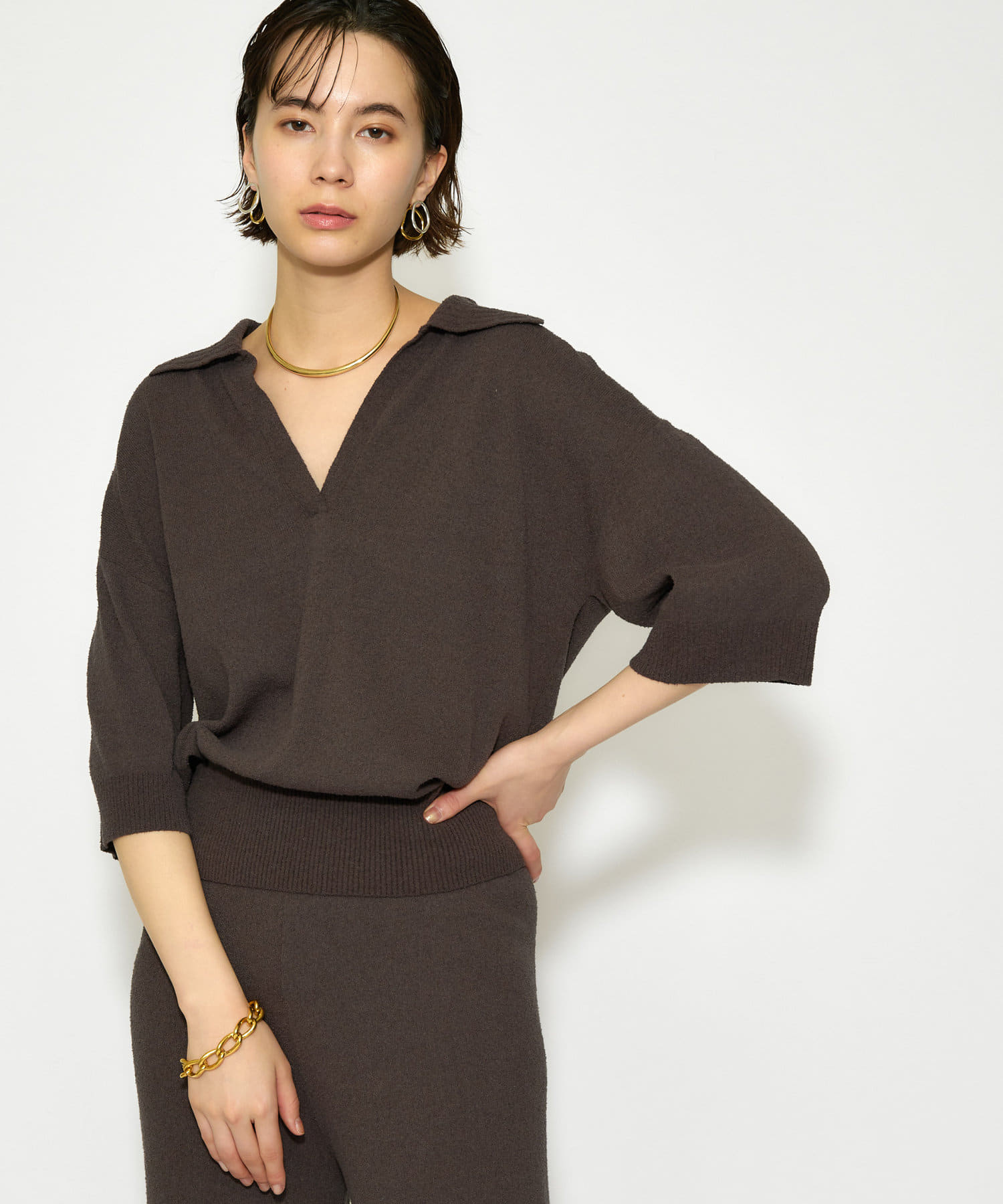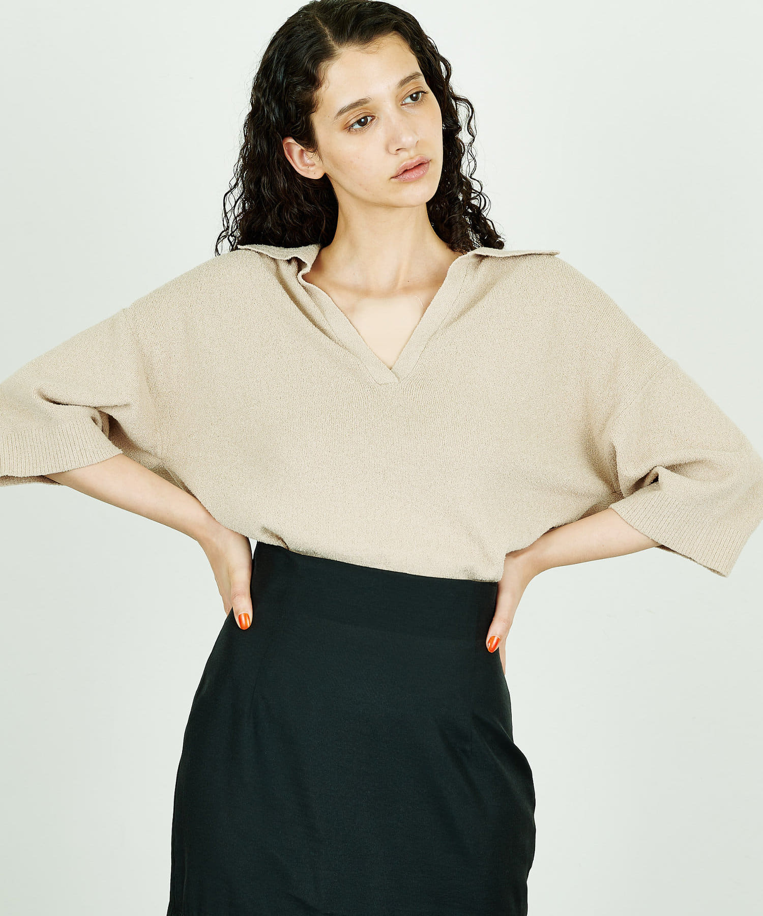 ■スキッパー開きがデコルテをきれいに演出し、トレンド感もプラス。