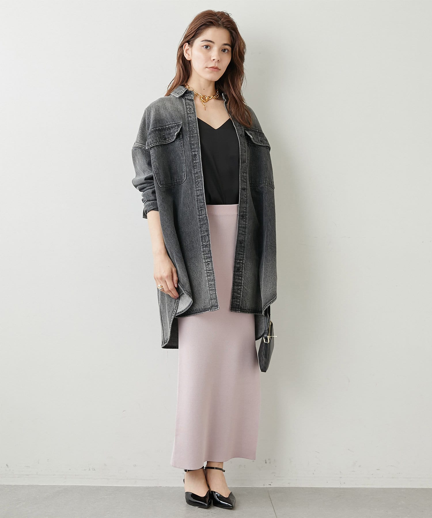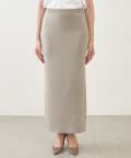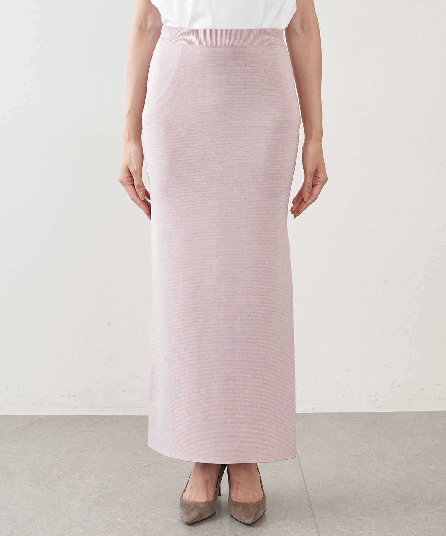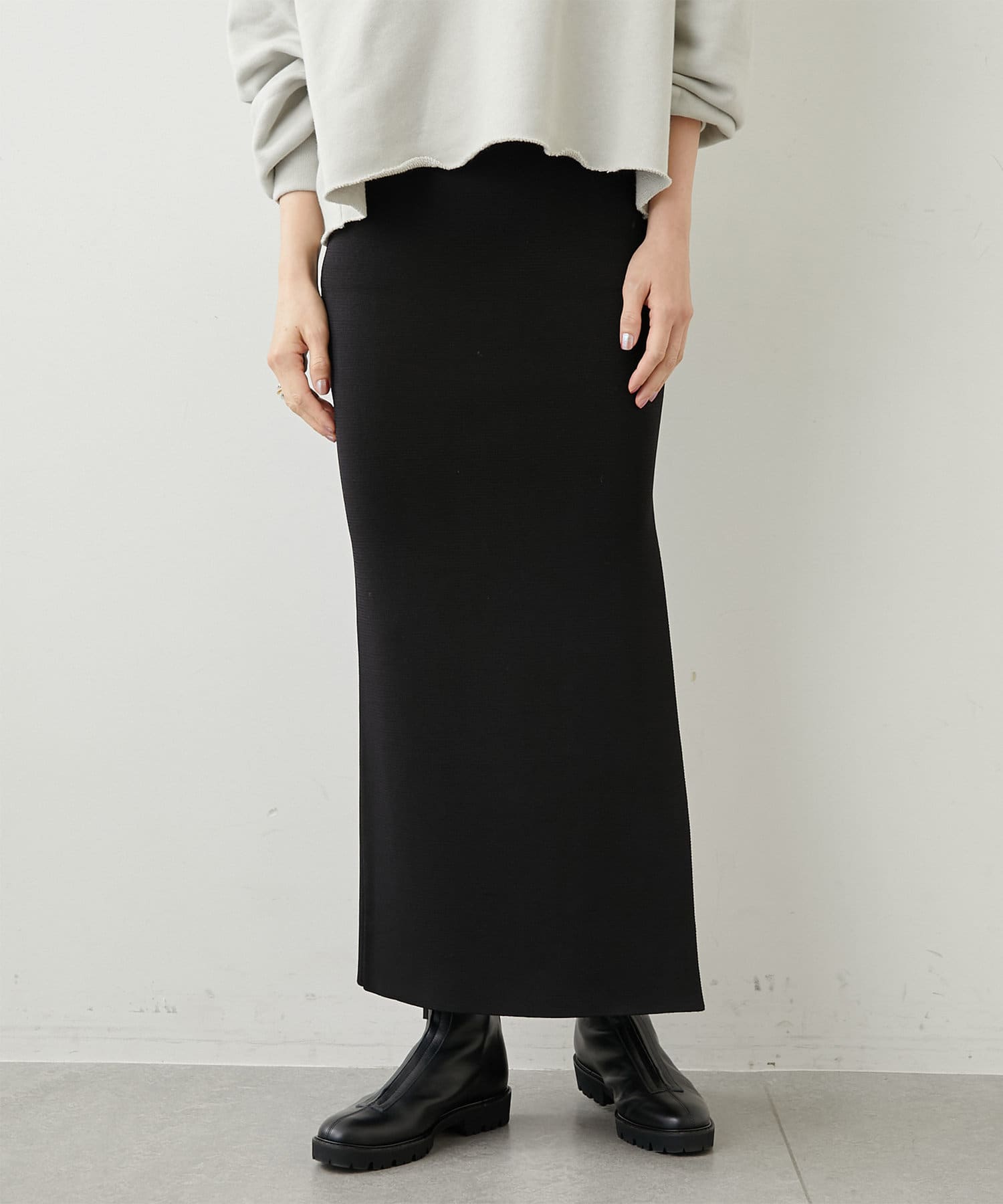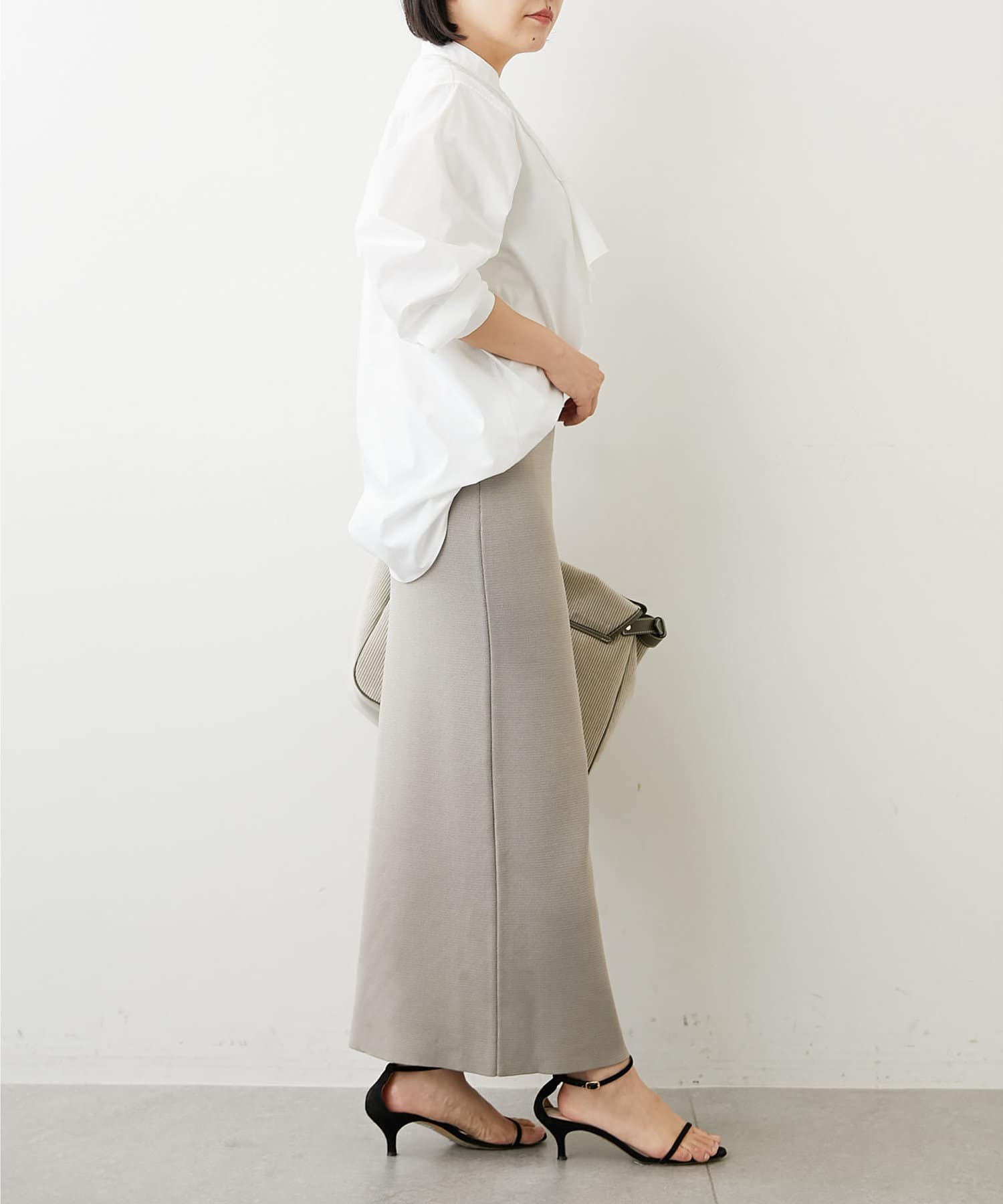 少しひんやりした肌ざわりのニットスカートです。しっかりタイトなシルエットですが、ニットフィットスカートと比べるとストレートなシルエットなので、膝あたりからのラインは拾いません。本当にいろんなアイテムに合わせやすいです!