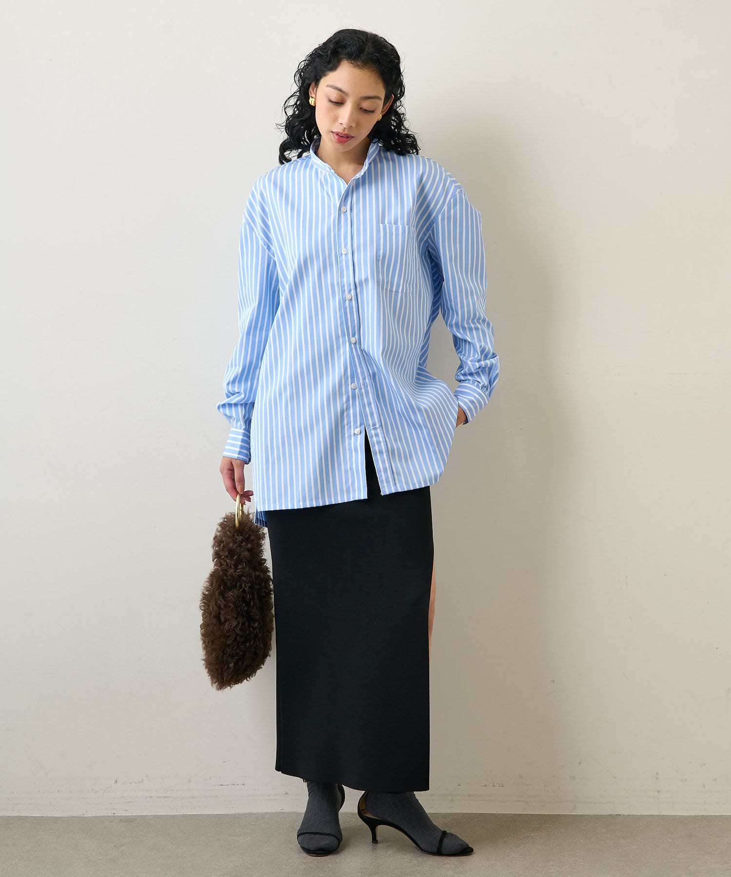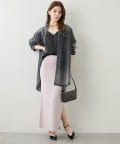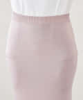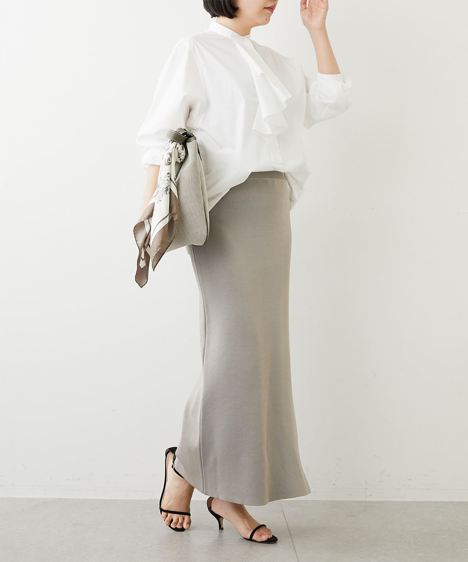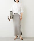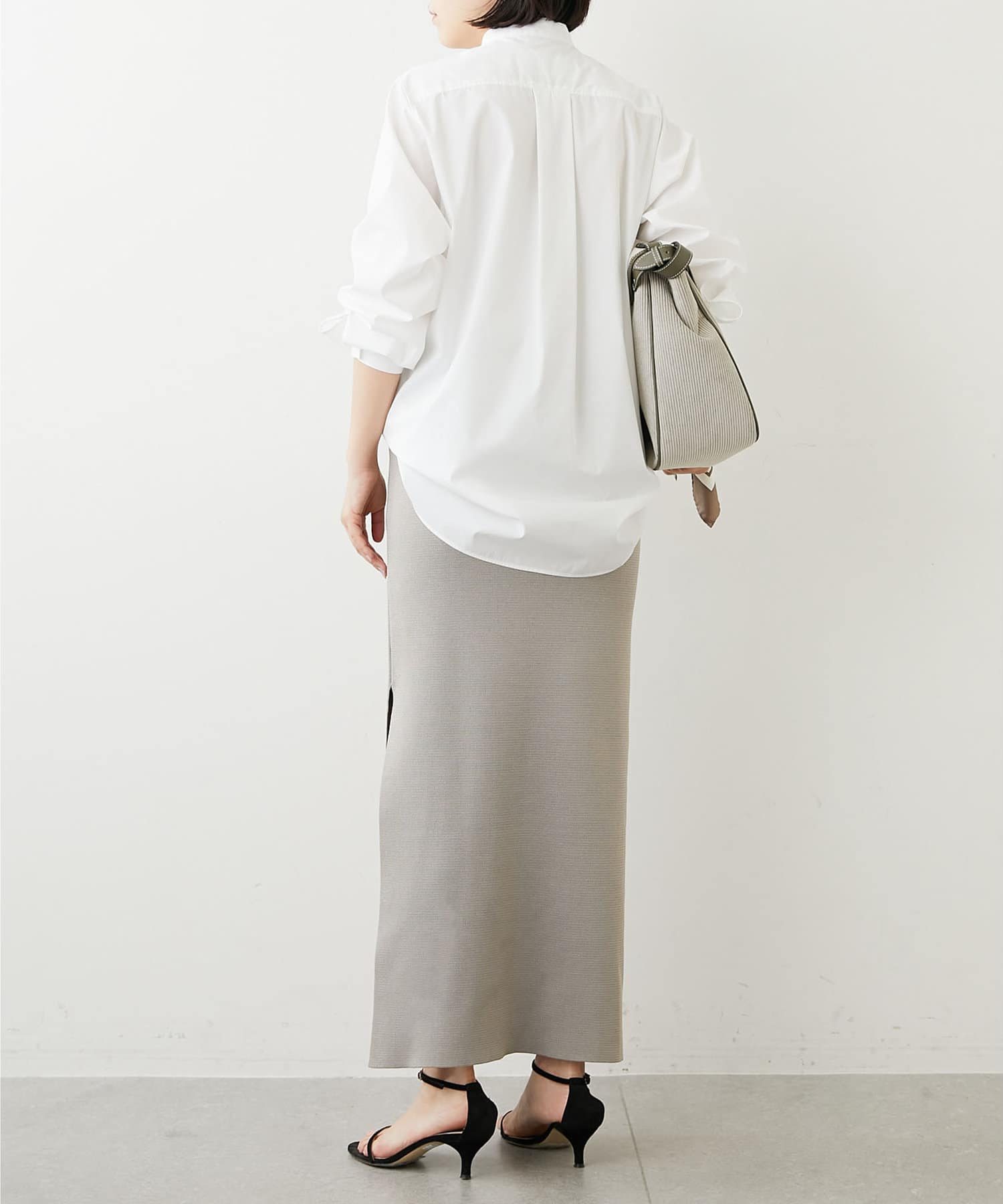 少しひんやりした肌ざわりのニットスカートです。しっかりタイトなシルエットですが、ニットフィットスカートと比べるとストレートなシルエットなので、膝あたりからのラインは拾いません。本当にいろんなアイテムに合わせやすいです!