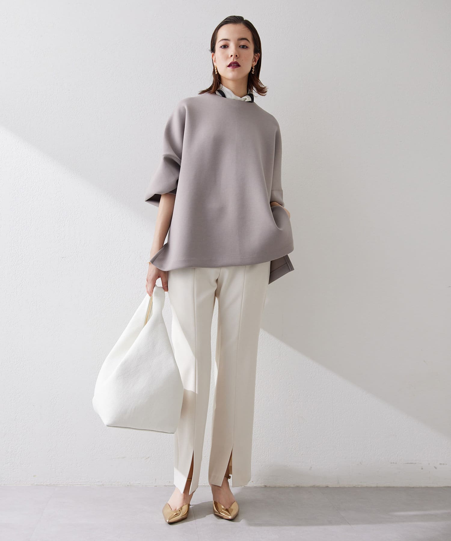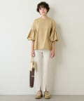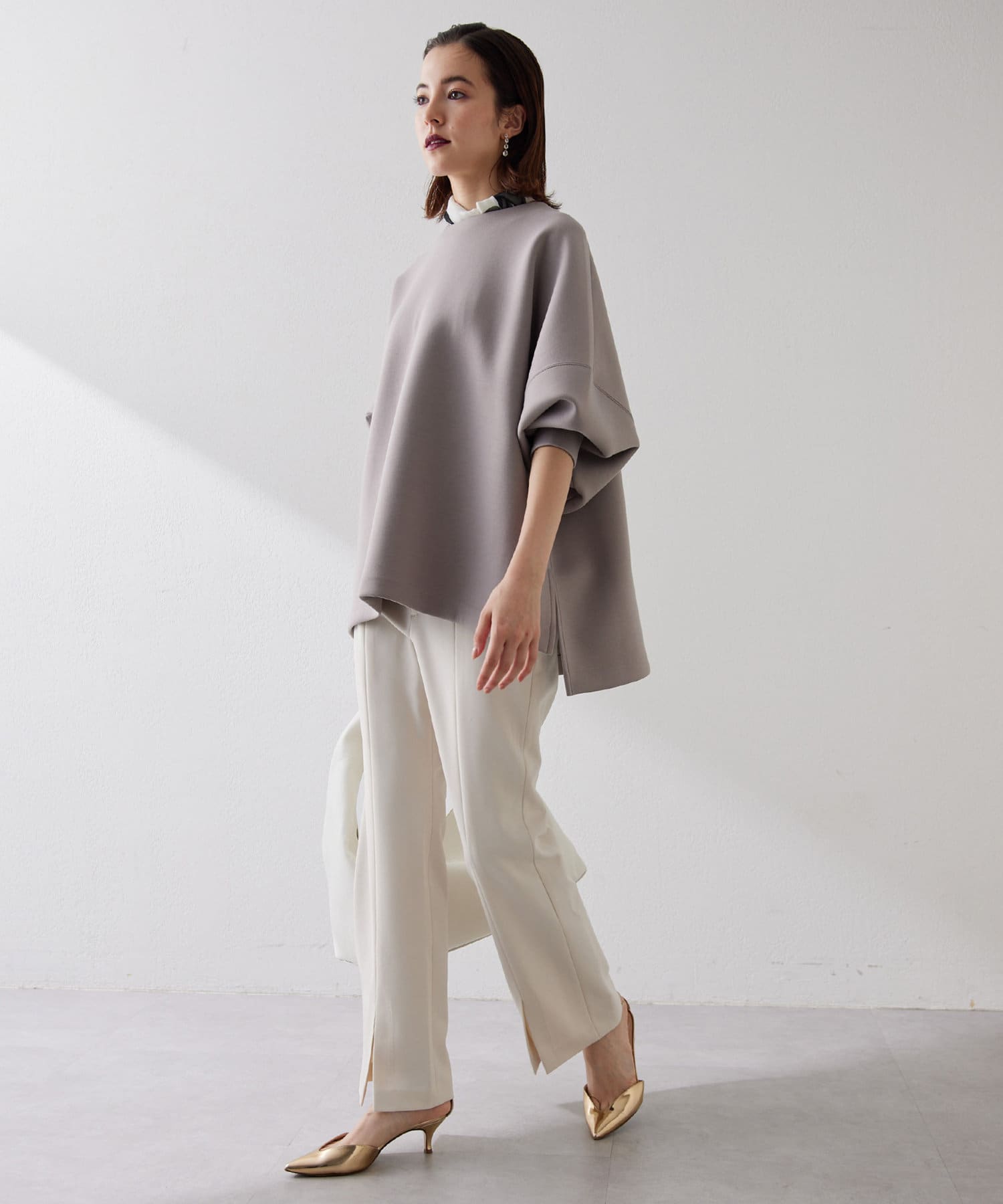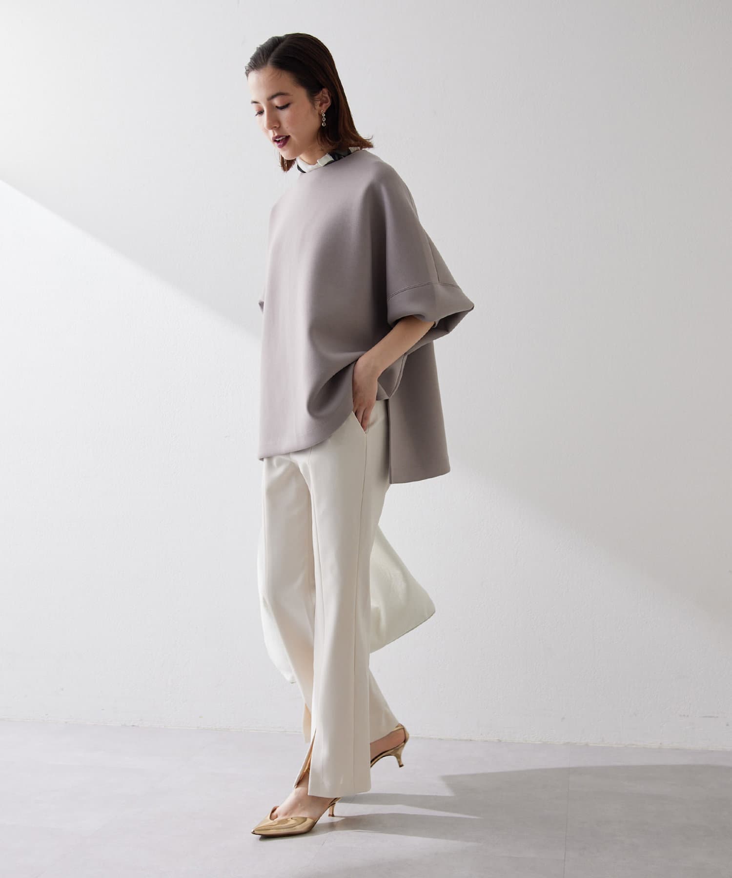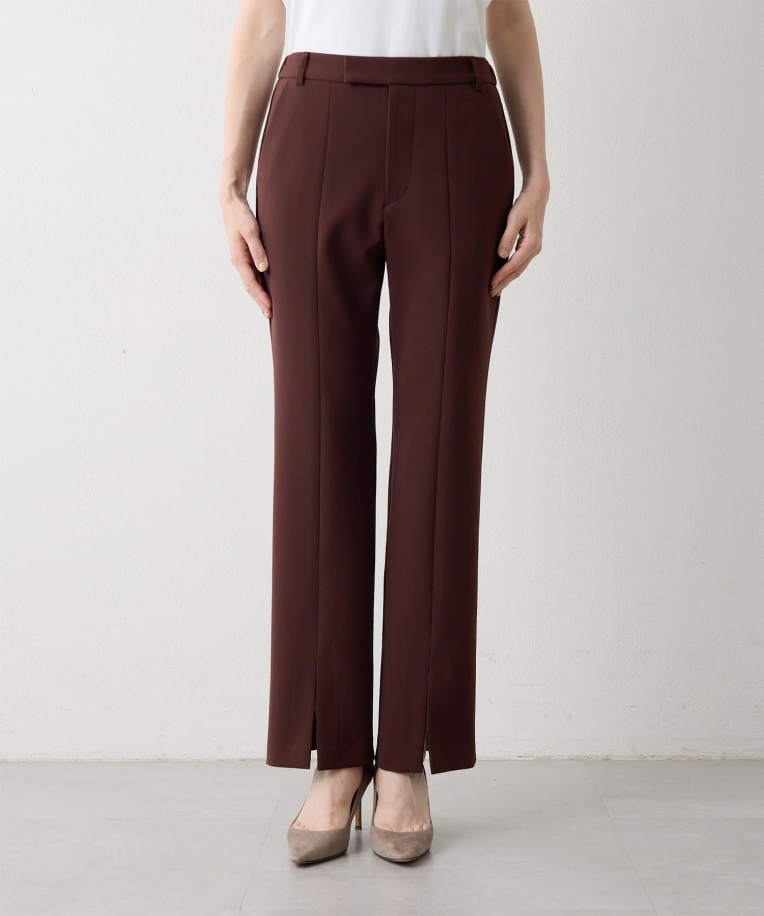 フロントスリットが抜け感をプラスする、きれいめ美脚パンツ