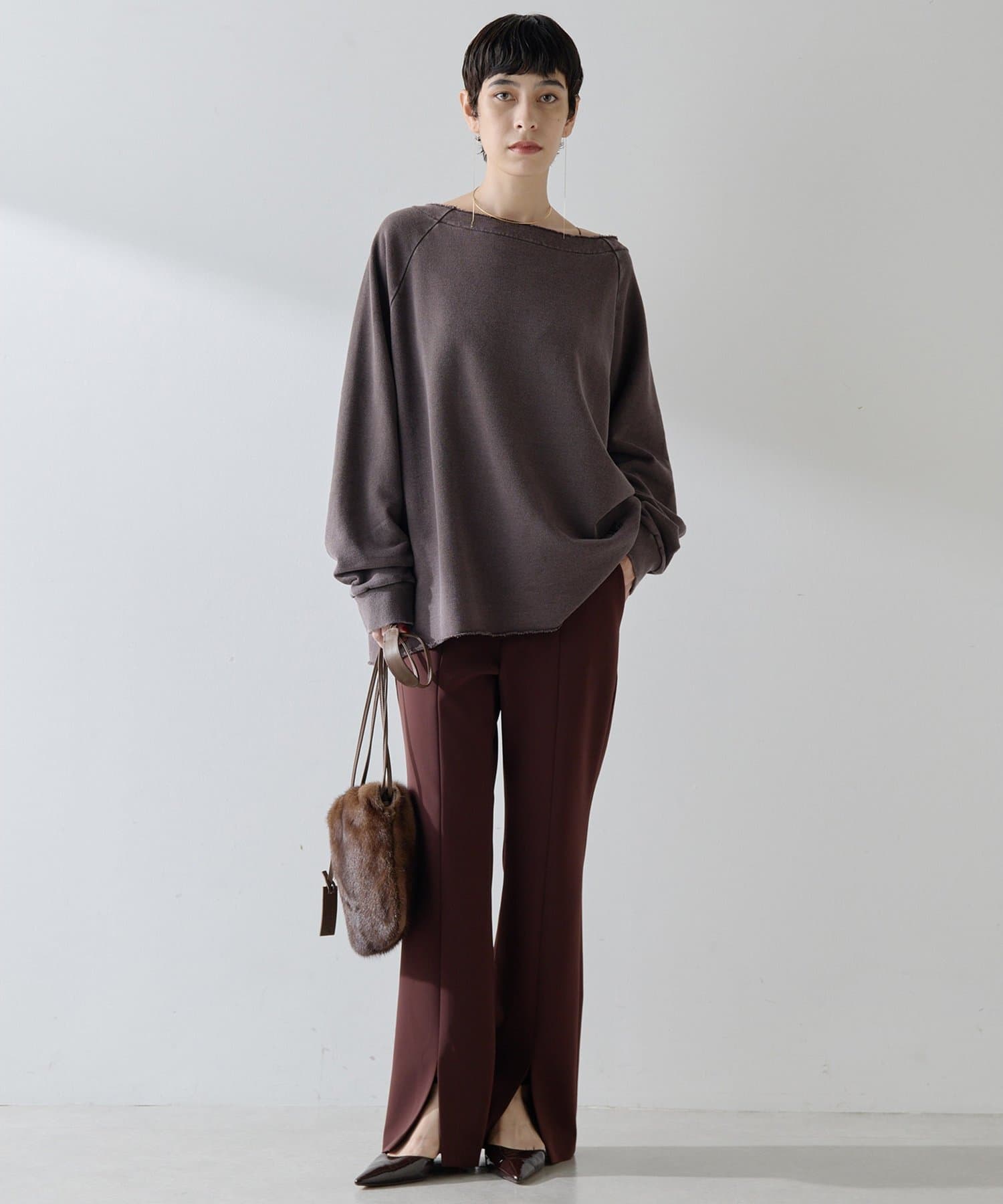 ■すっきりとしたシルエットが上品なフロントスリットパンツ。