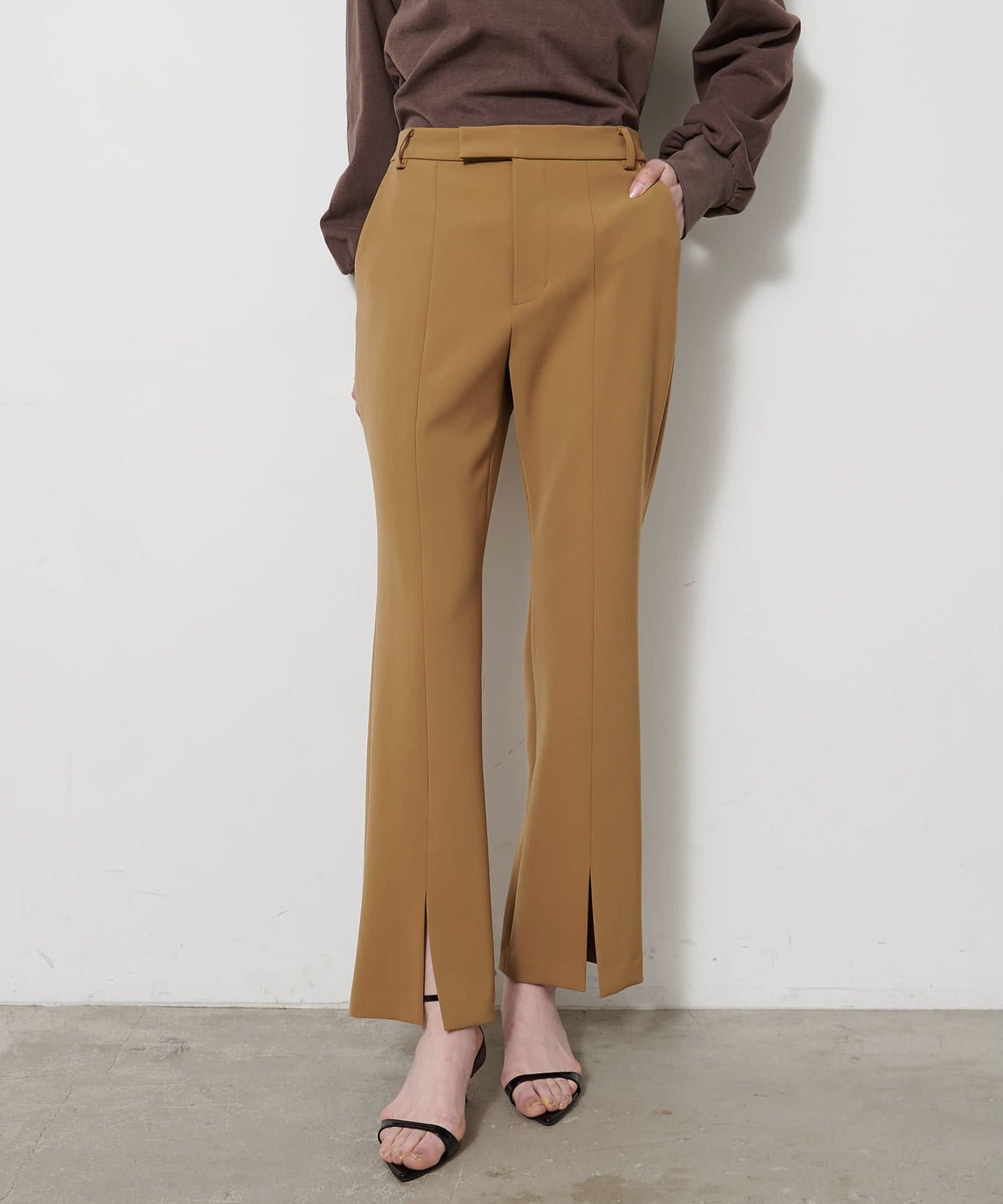 フロントスリットが抜け感をプラスする、きれいめ美脚パンツ