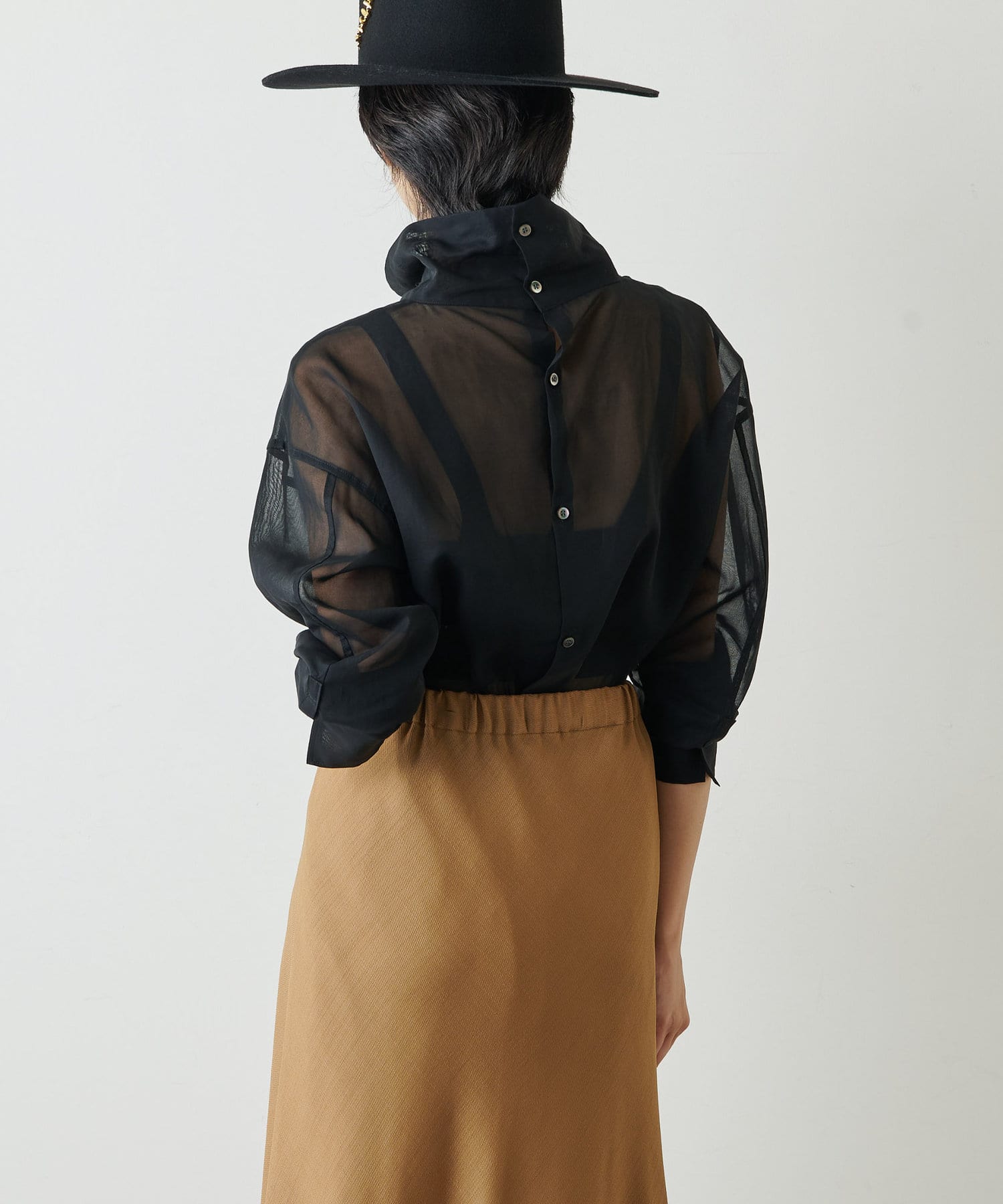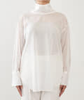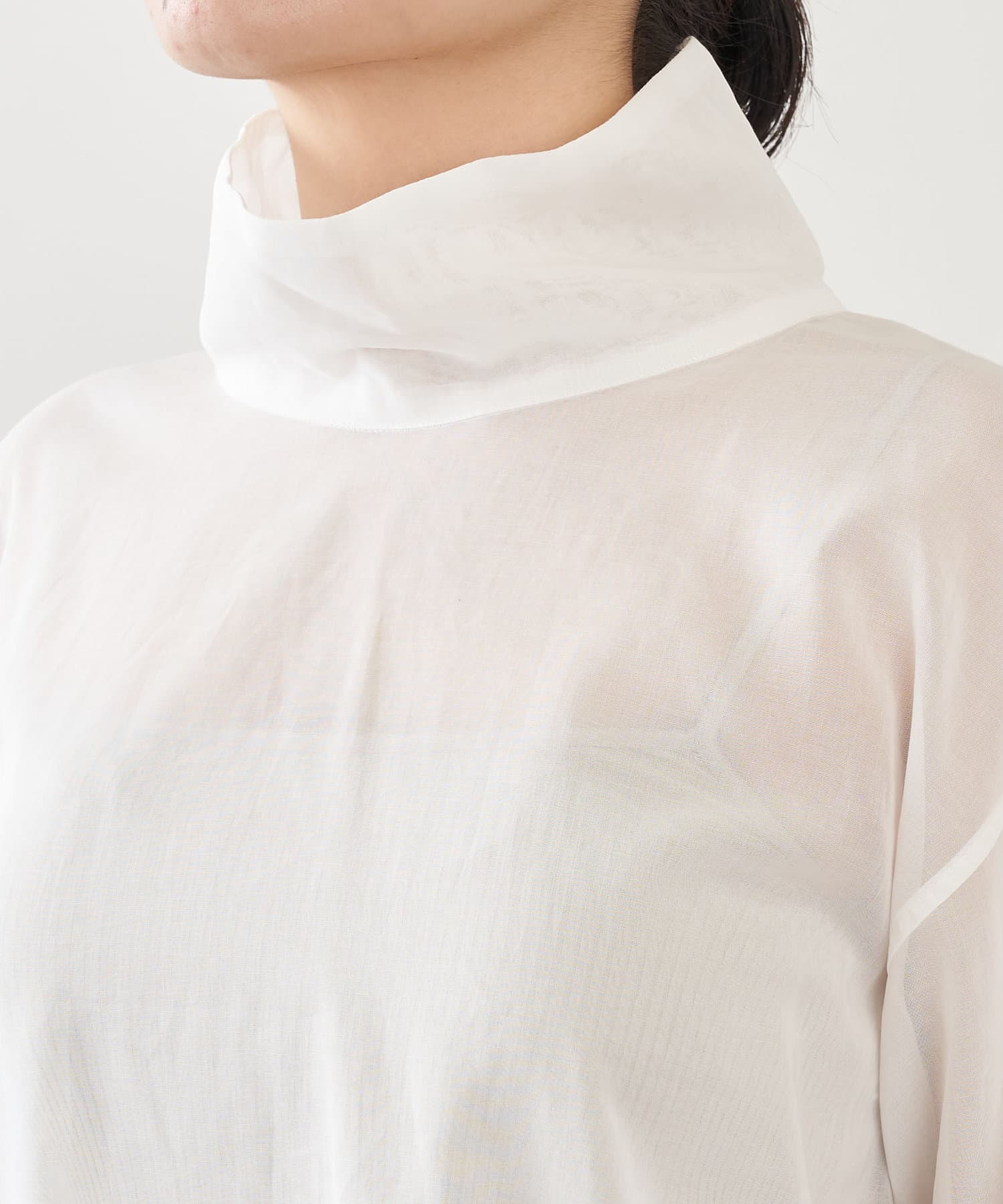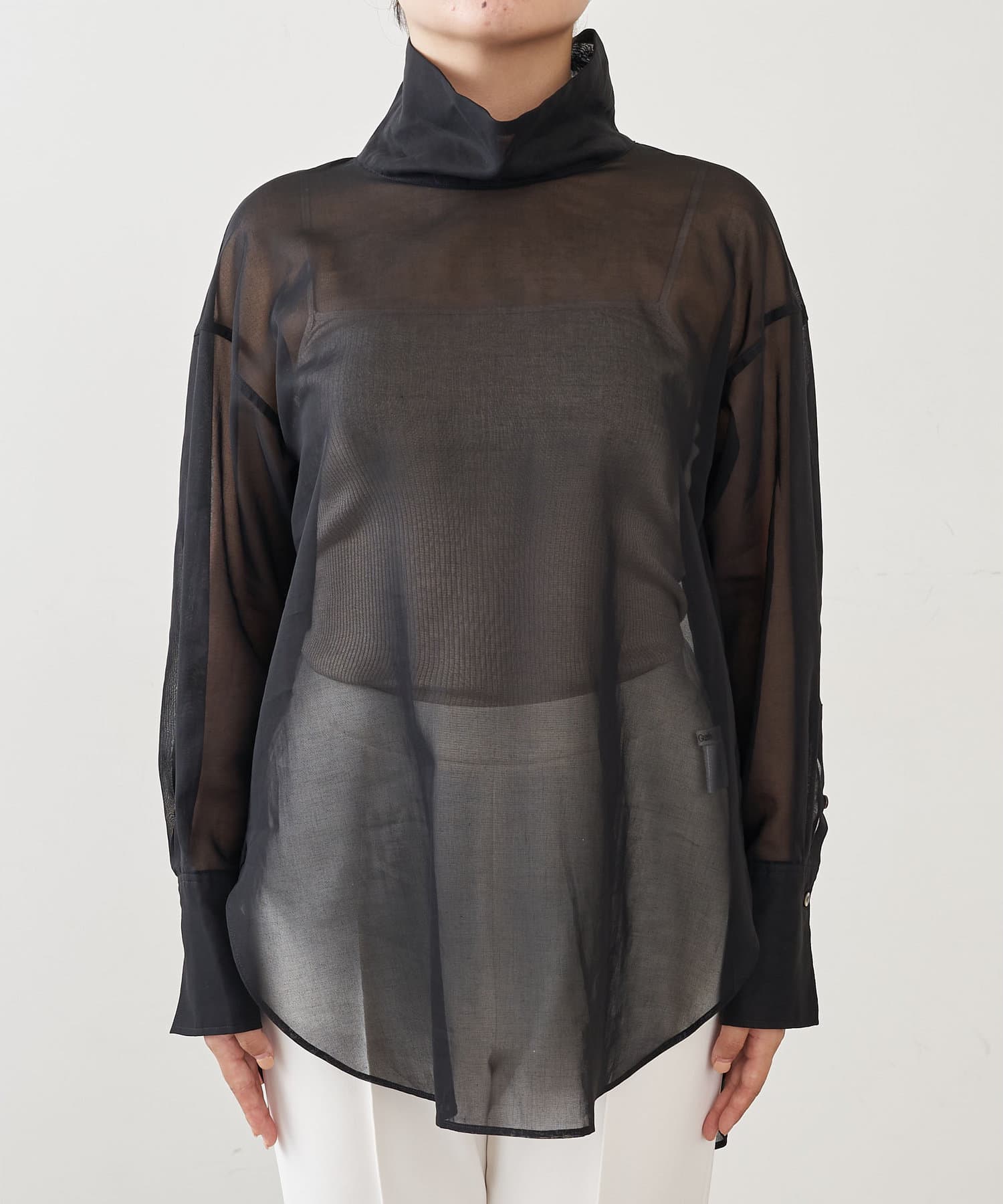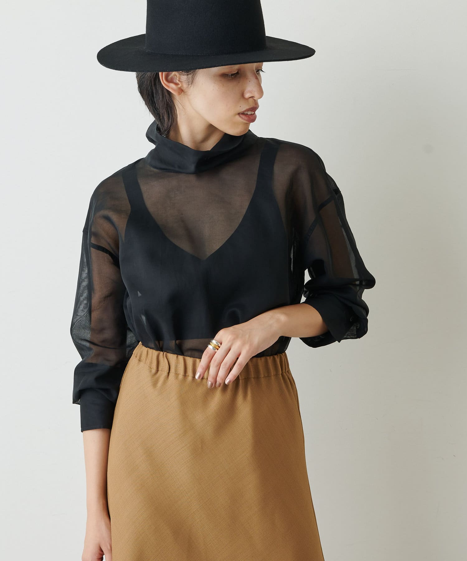 ■オーガンジー素材の透け感が上品なハイネックプルオーバー。