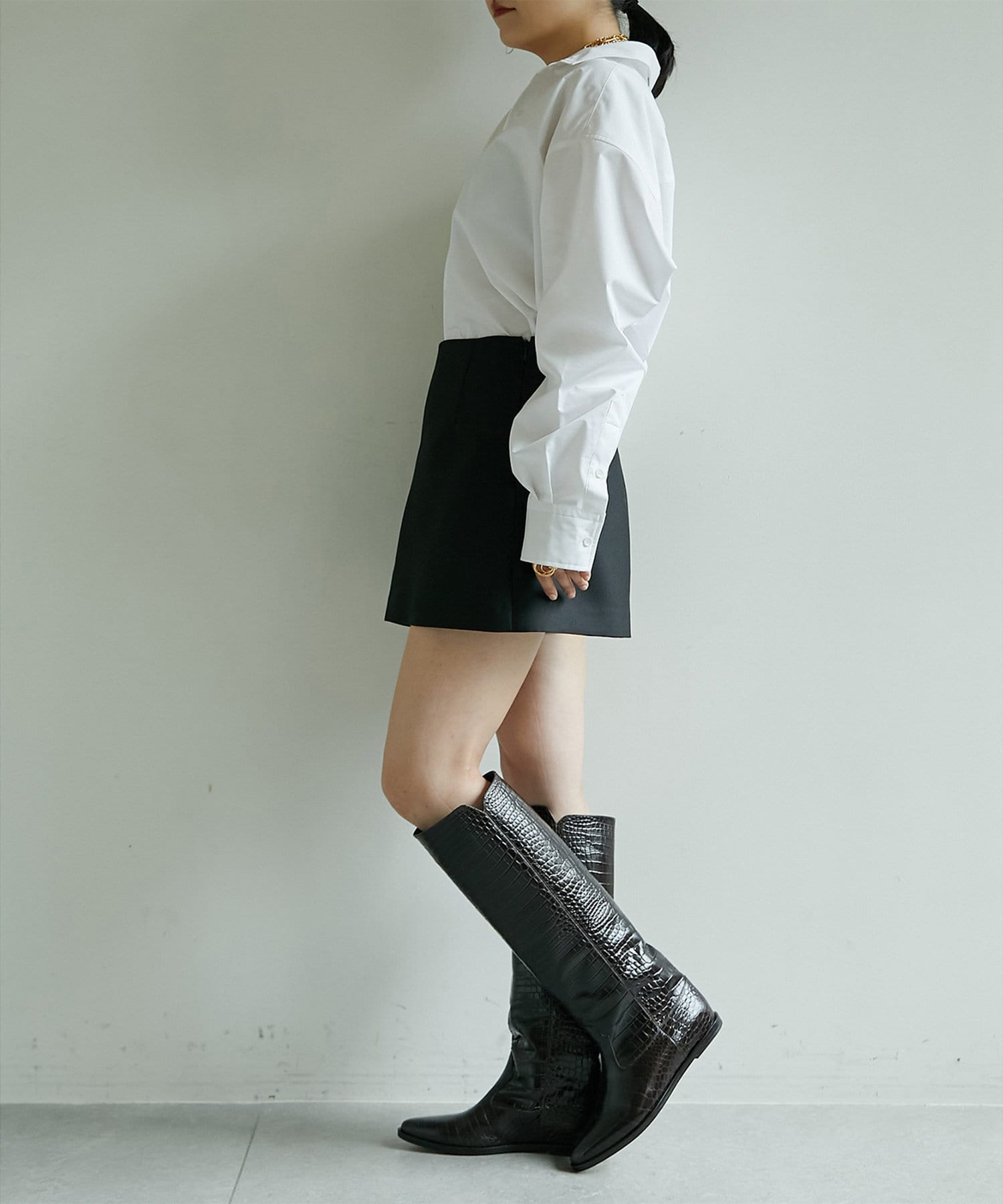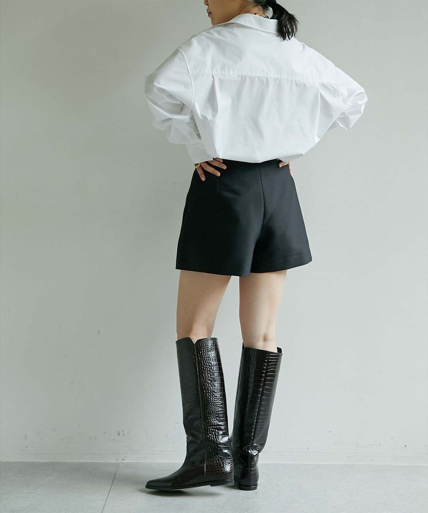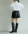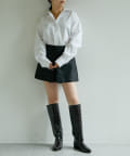 ■ショートボトムの上からレイヤードして、足元にロングブーツを合わせてミニワンピースのように楽しむスタイリングもおすすめ。