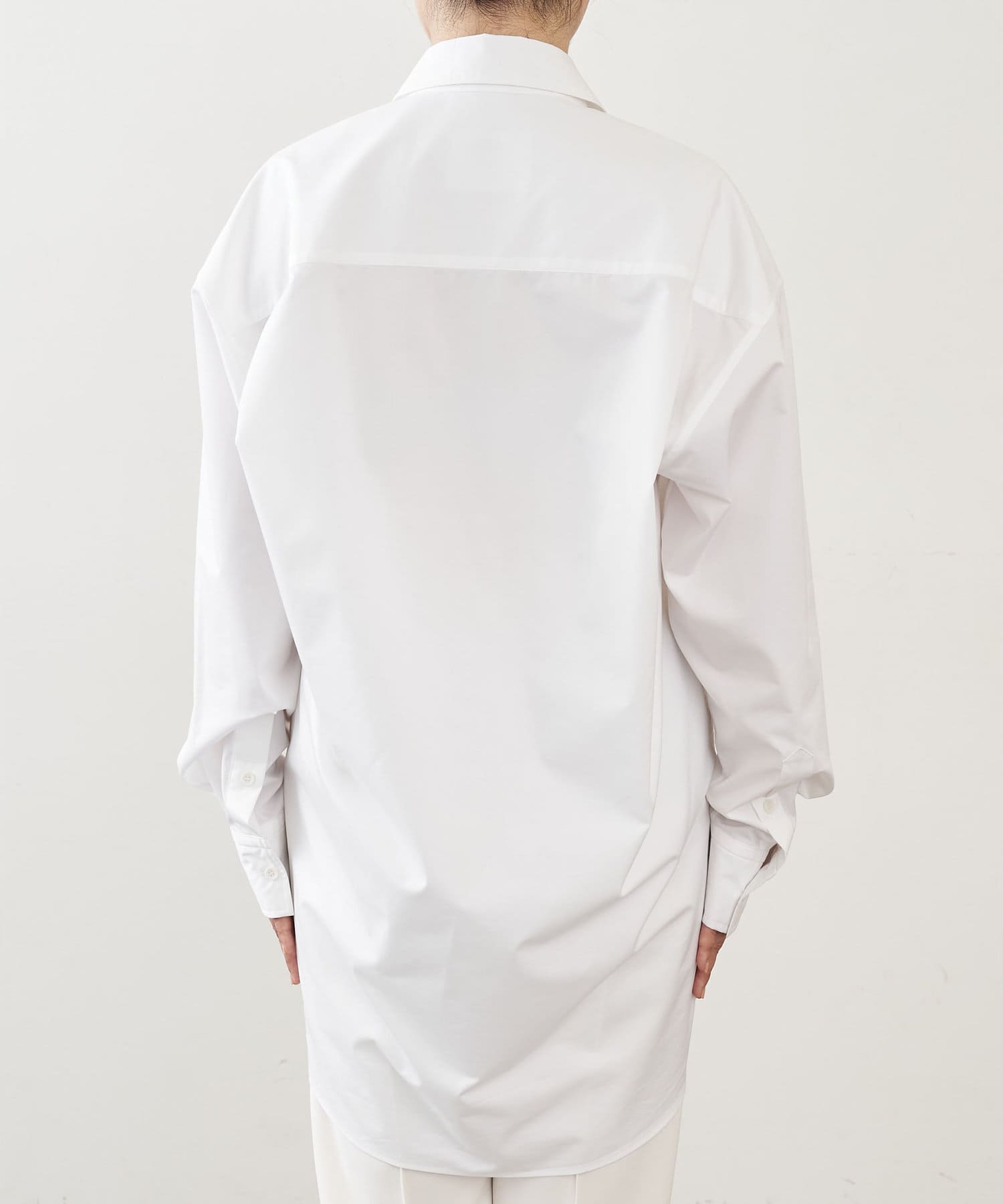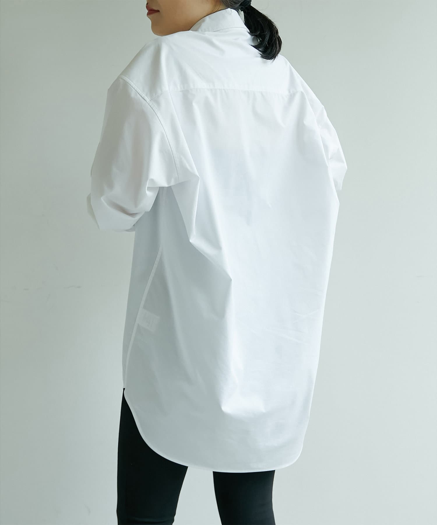 襟を抜いて着ると、後ろ身頃は膝上ぐらいまでの長さになり、合わせる服は選びますが、長谷川さんのこだわりの詰まったシャツの良さに納得。ほのかに光沢のある生地も高級感があります。