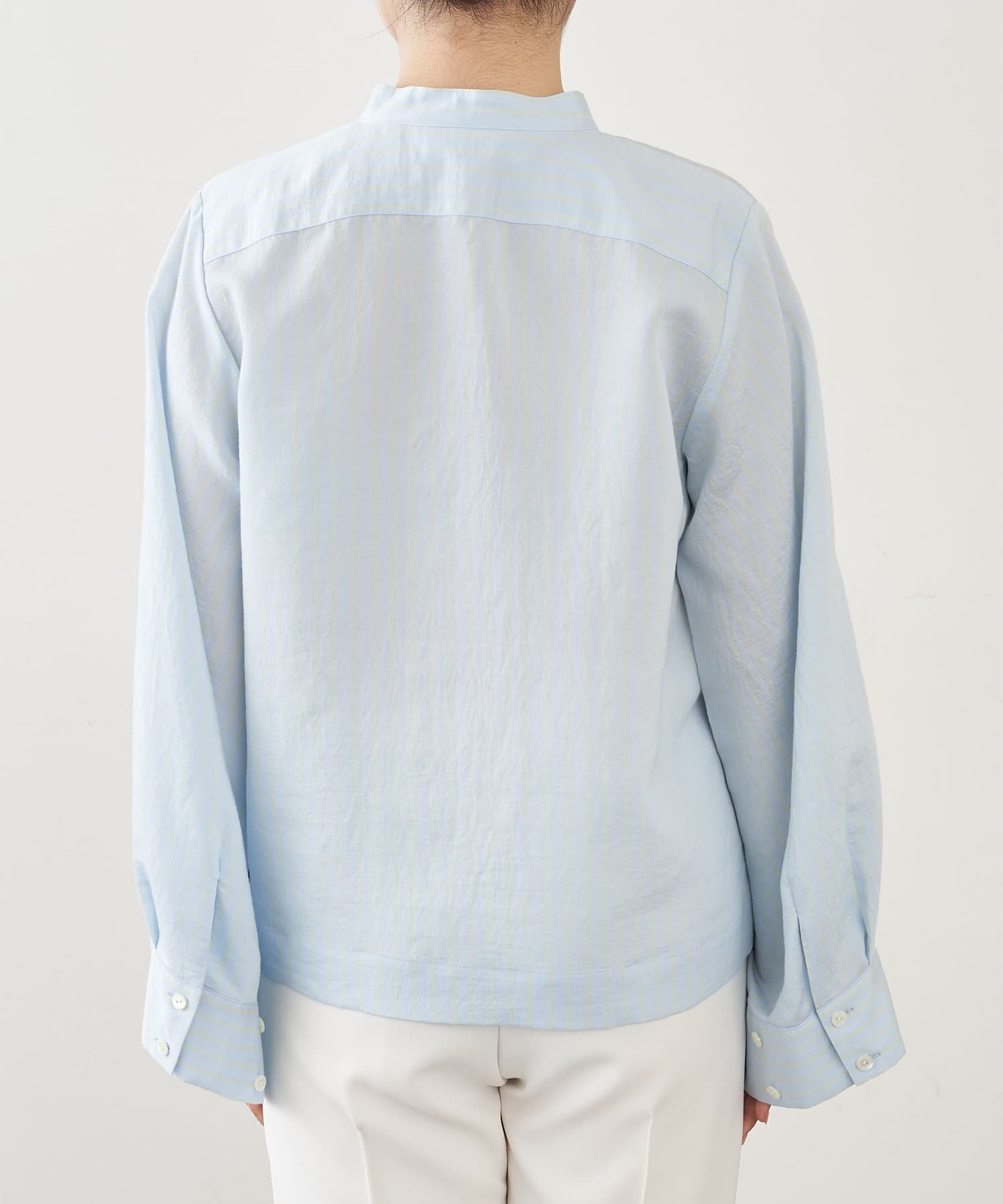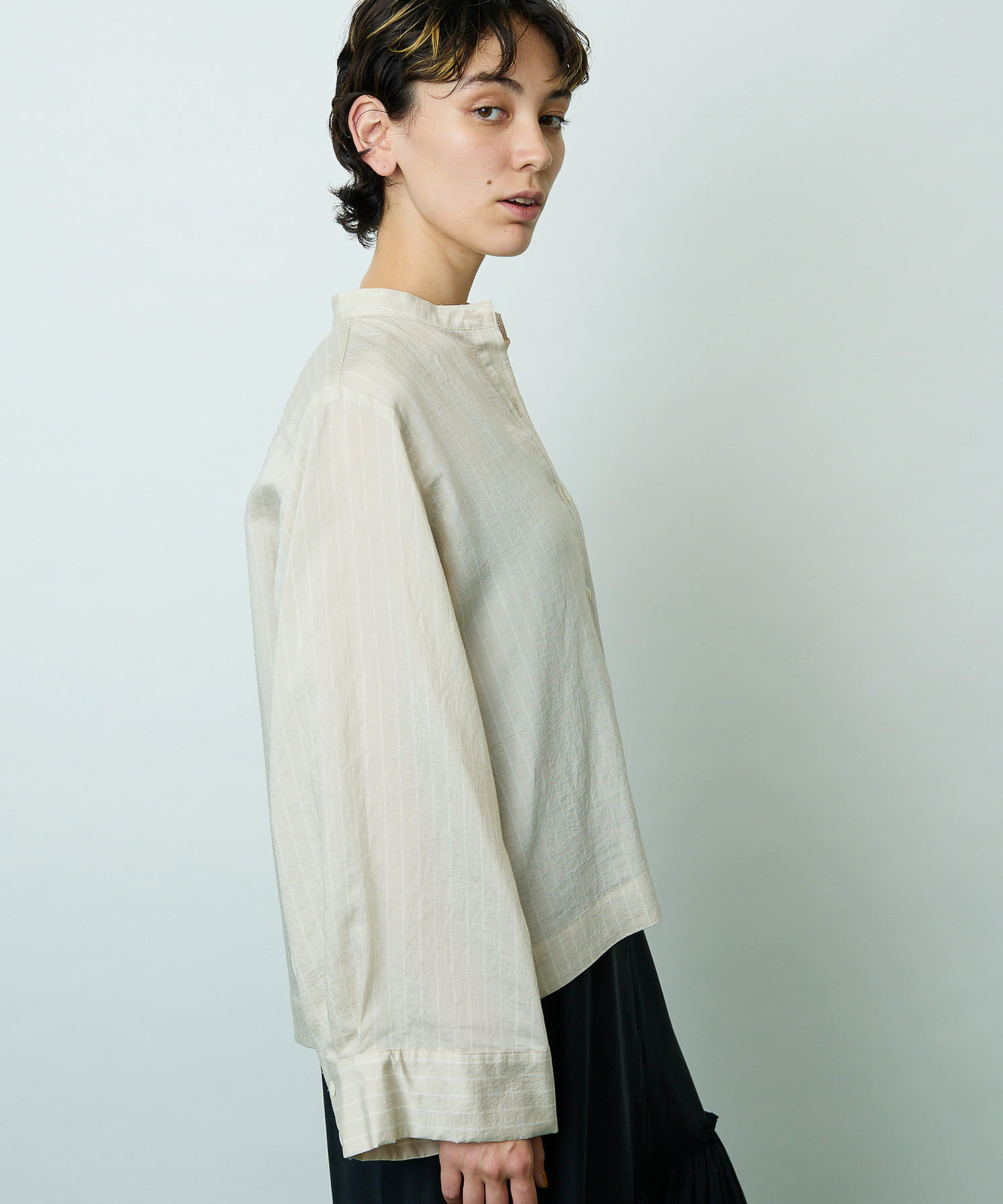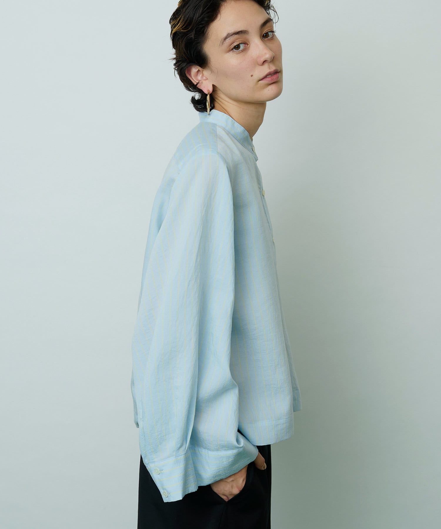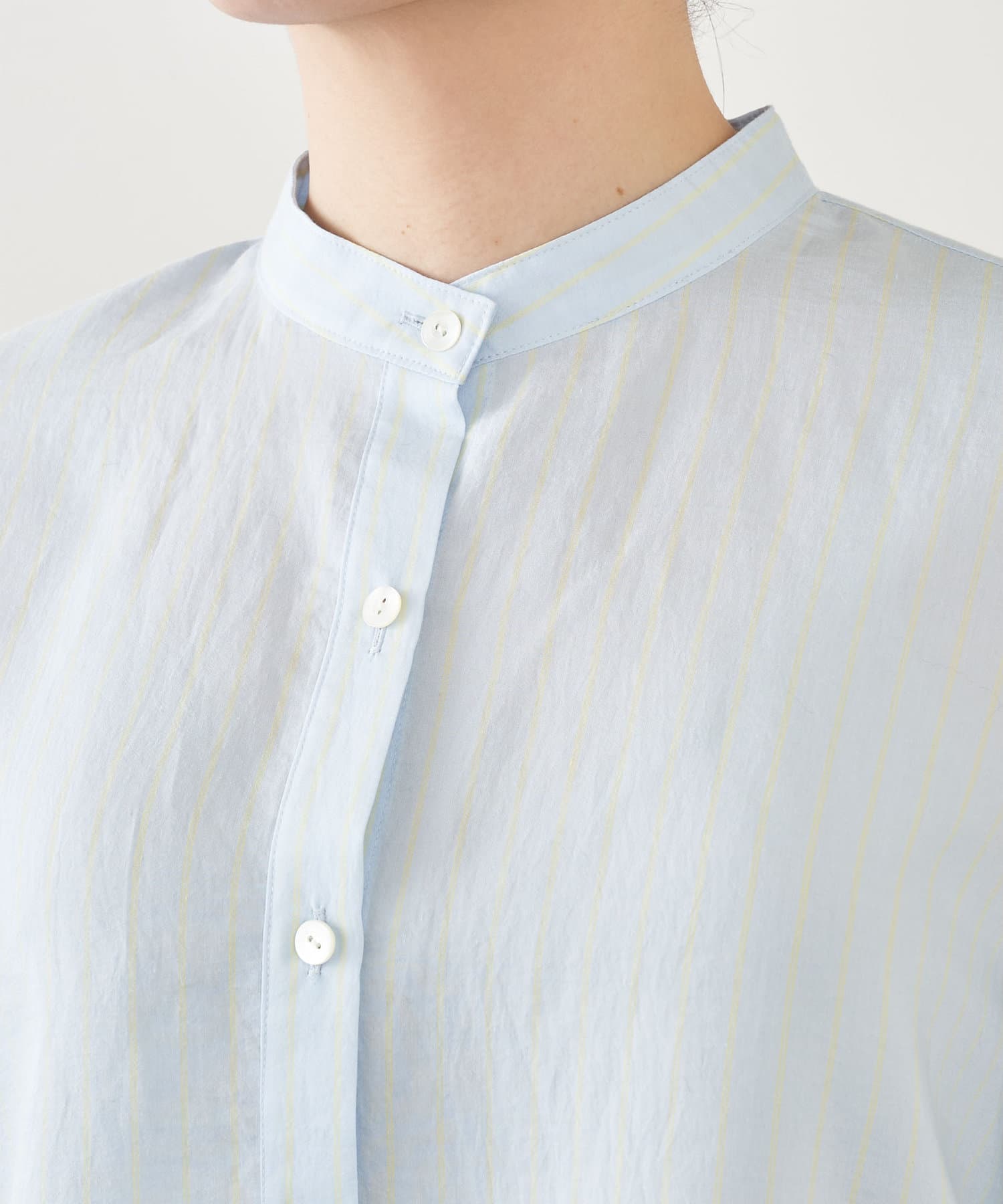 ■バンドカラーのボタンを留めてクラシックに着こなしたり、少しボタンを外して首元を開け、袖を無造作にロールアップしてラフに楽しむのもおすすめ。