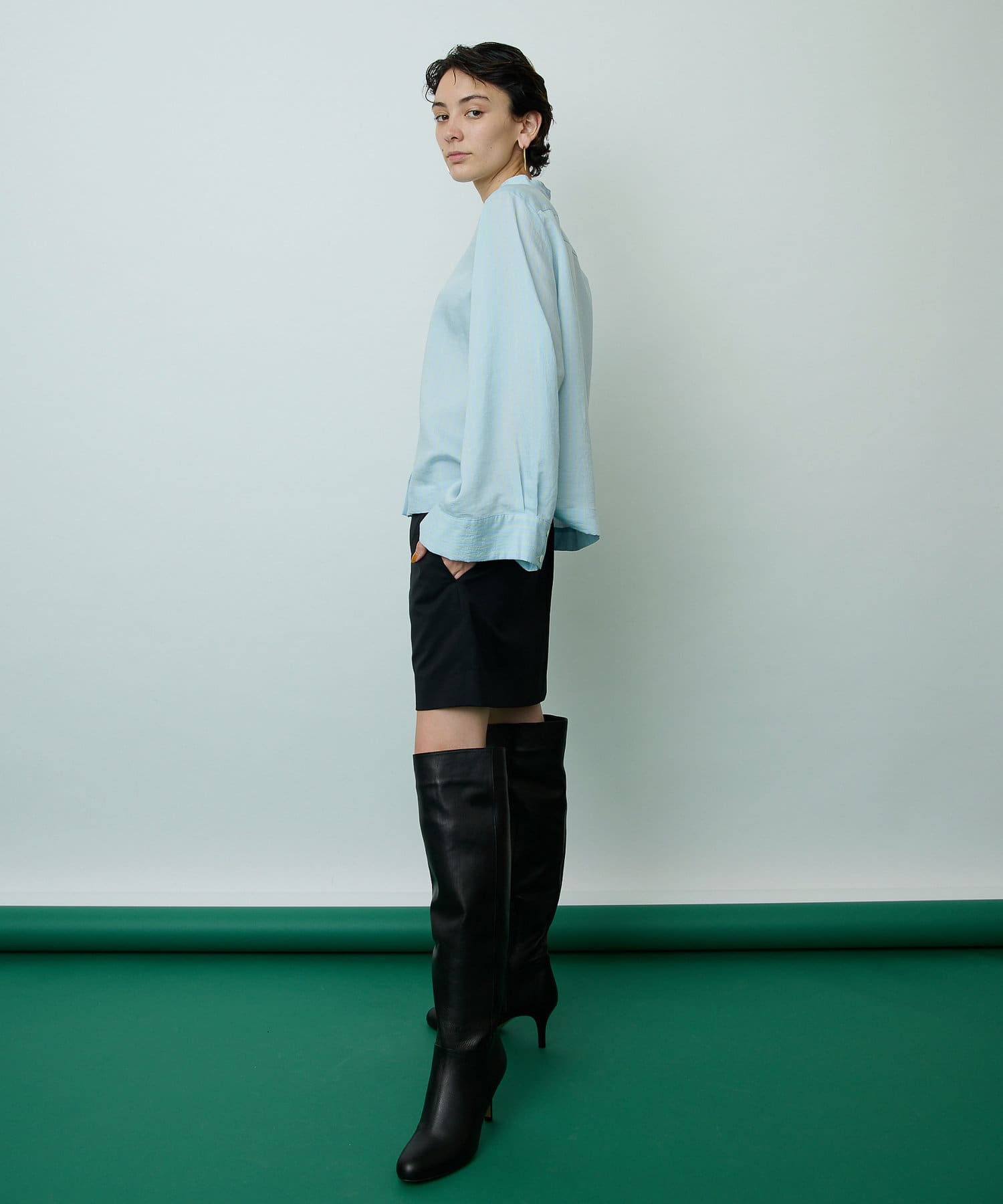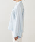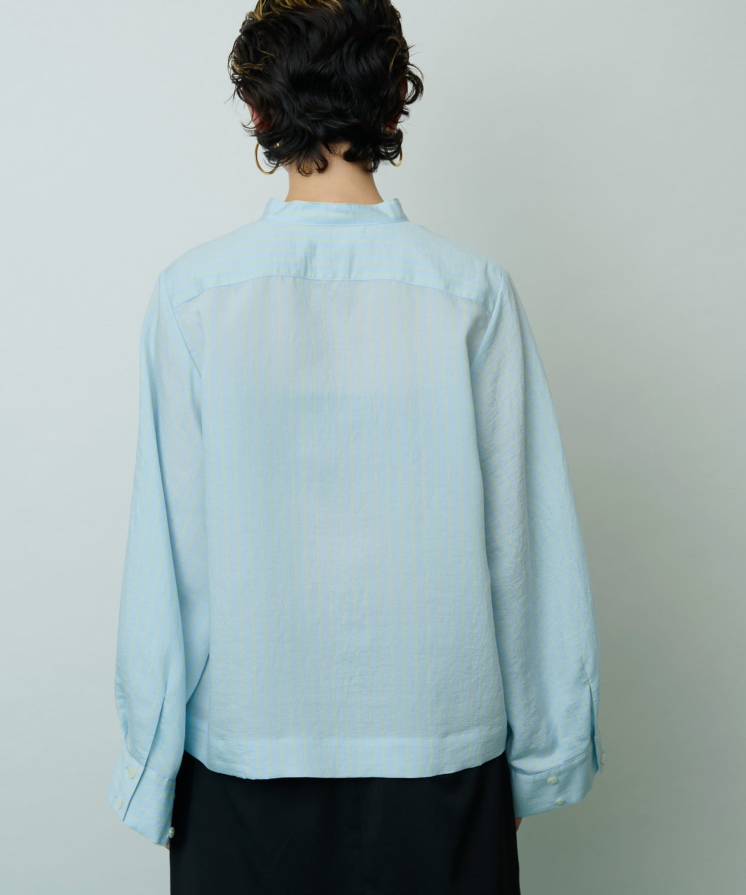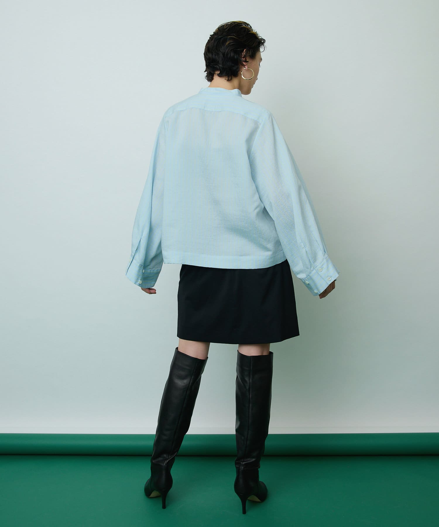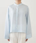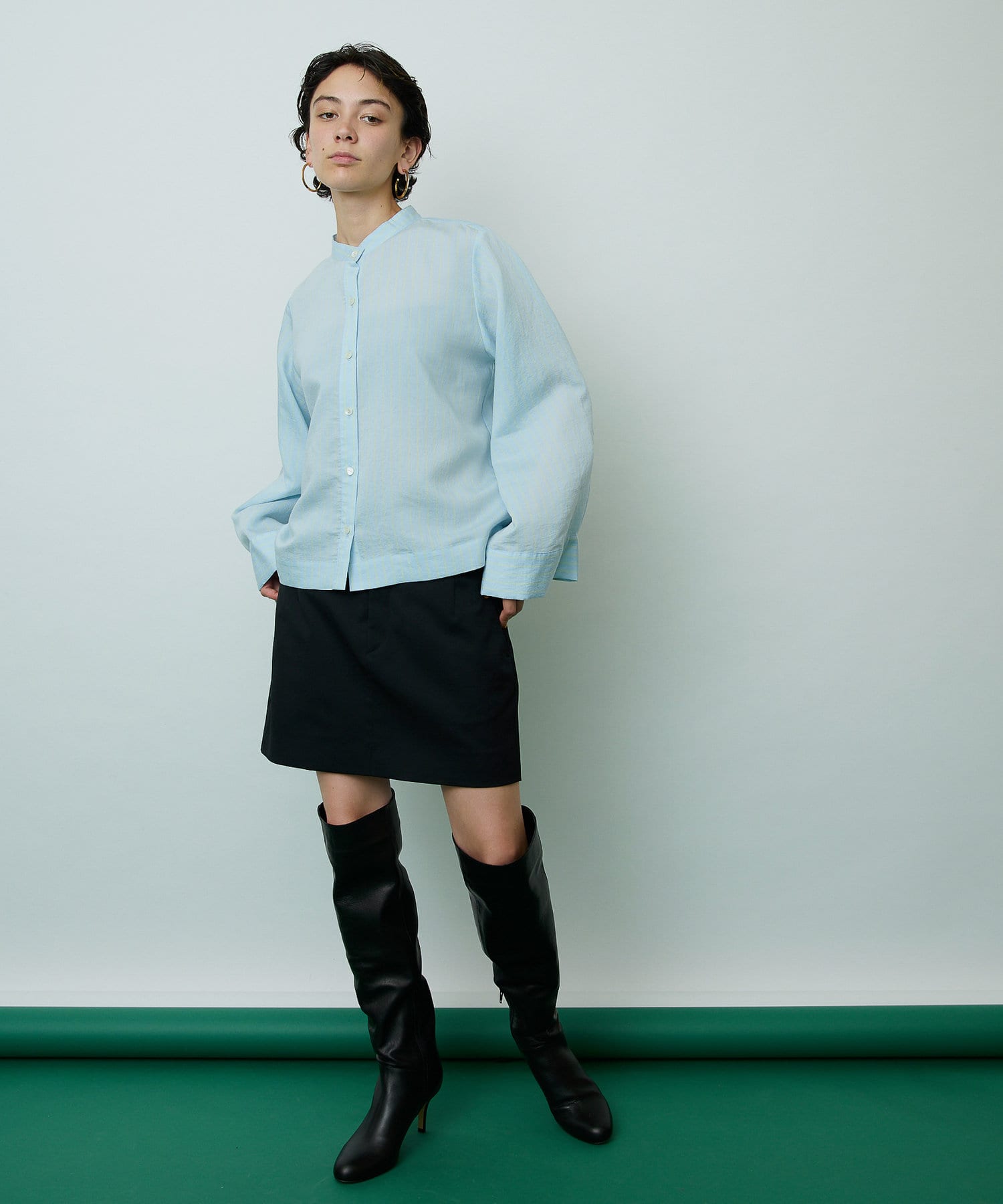 ■バンドカラーのボタンを留めてクラシックに着こなしたり、少しボタンを外して首元を開け、袖を無造作にロールアップしてラフに楽しむのもおすすめ。