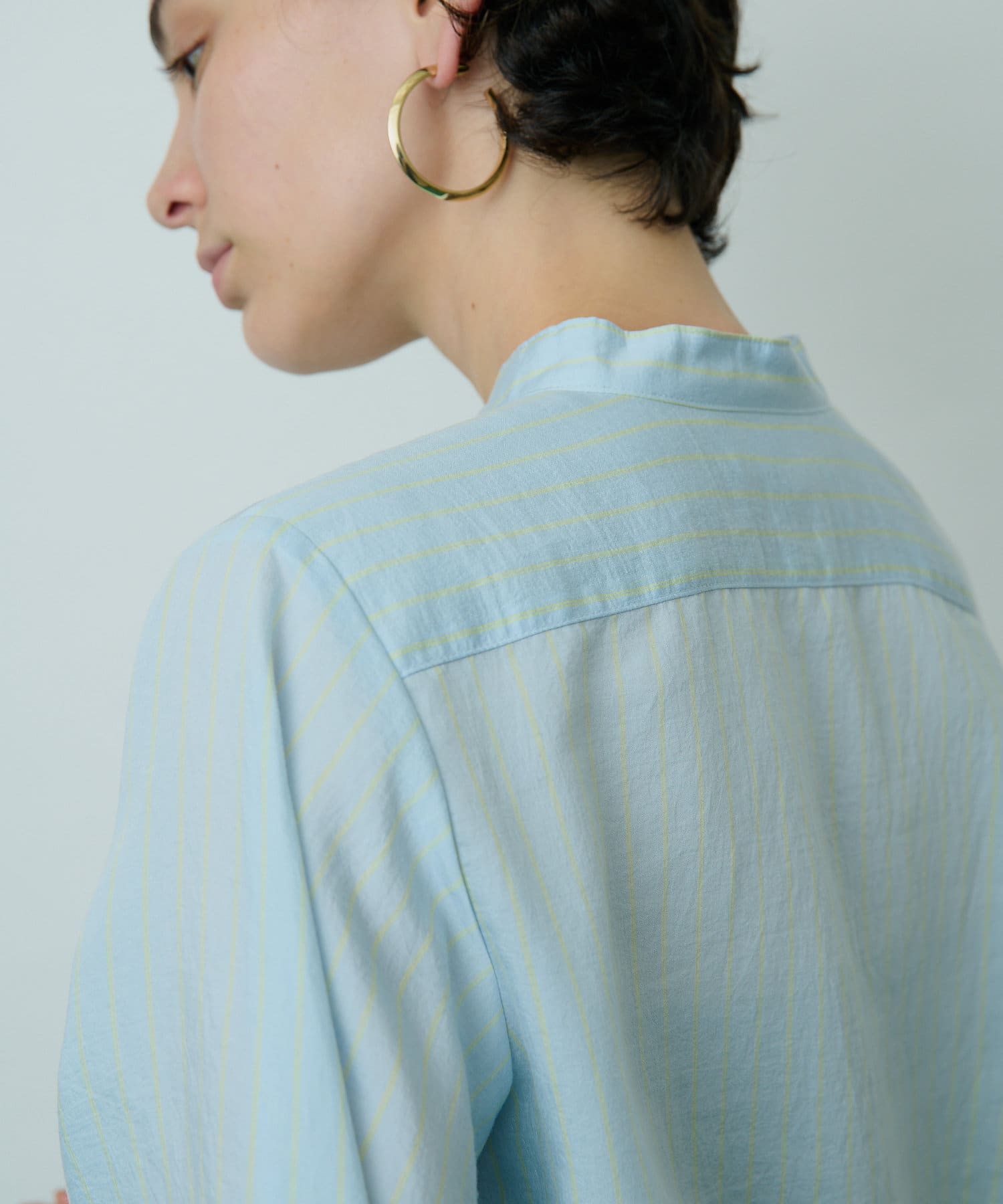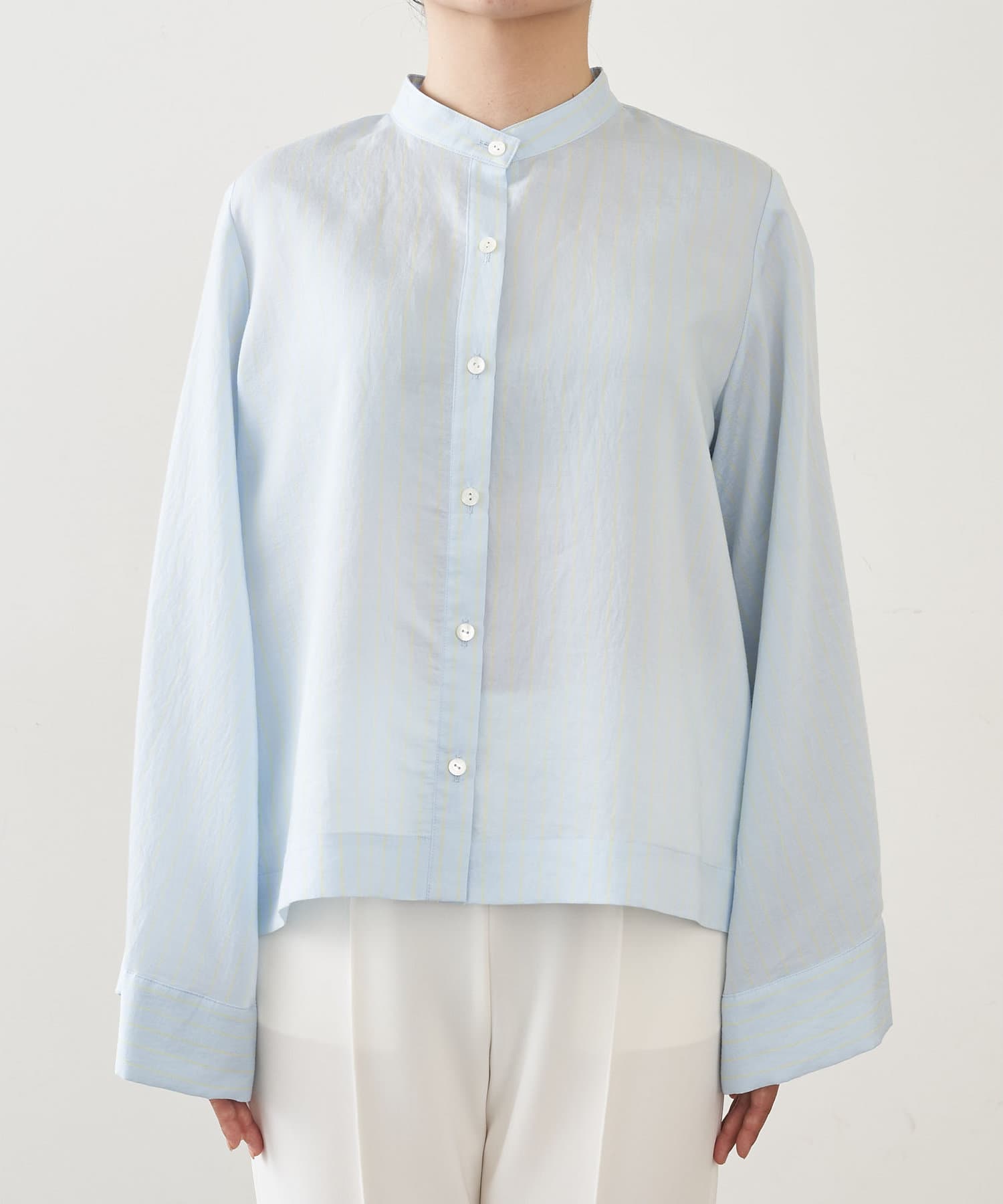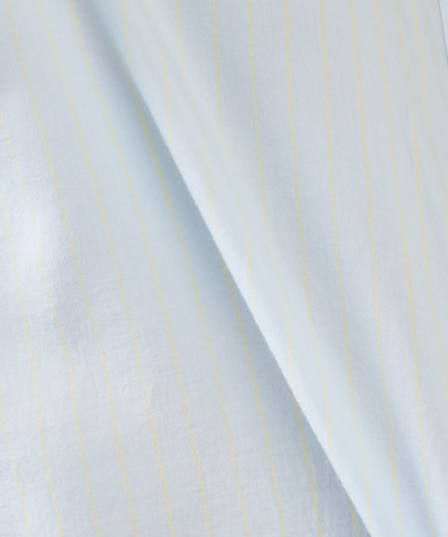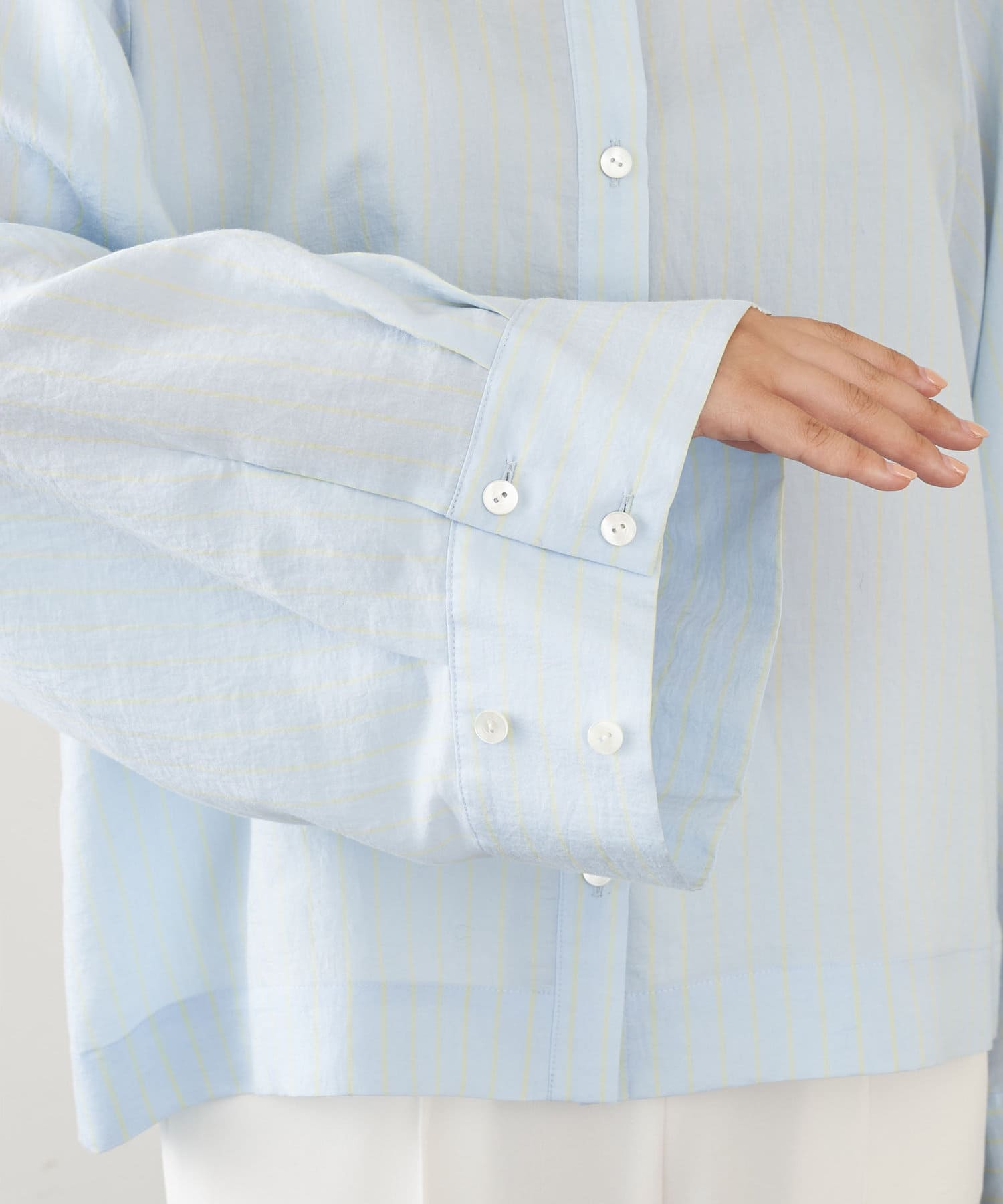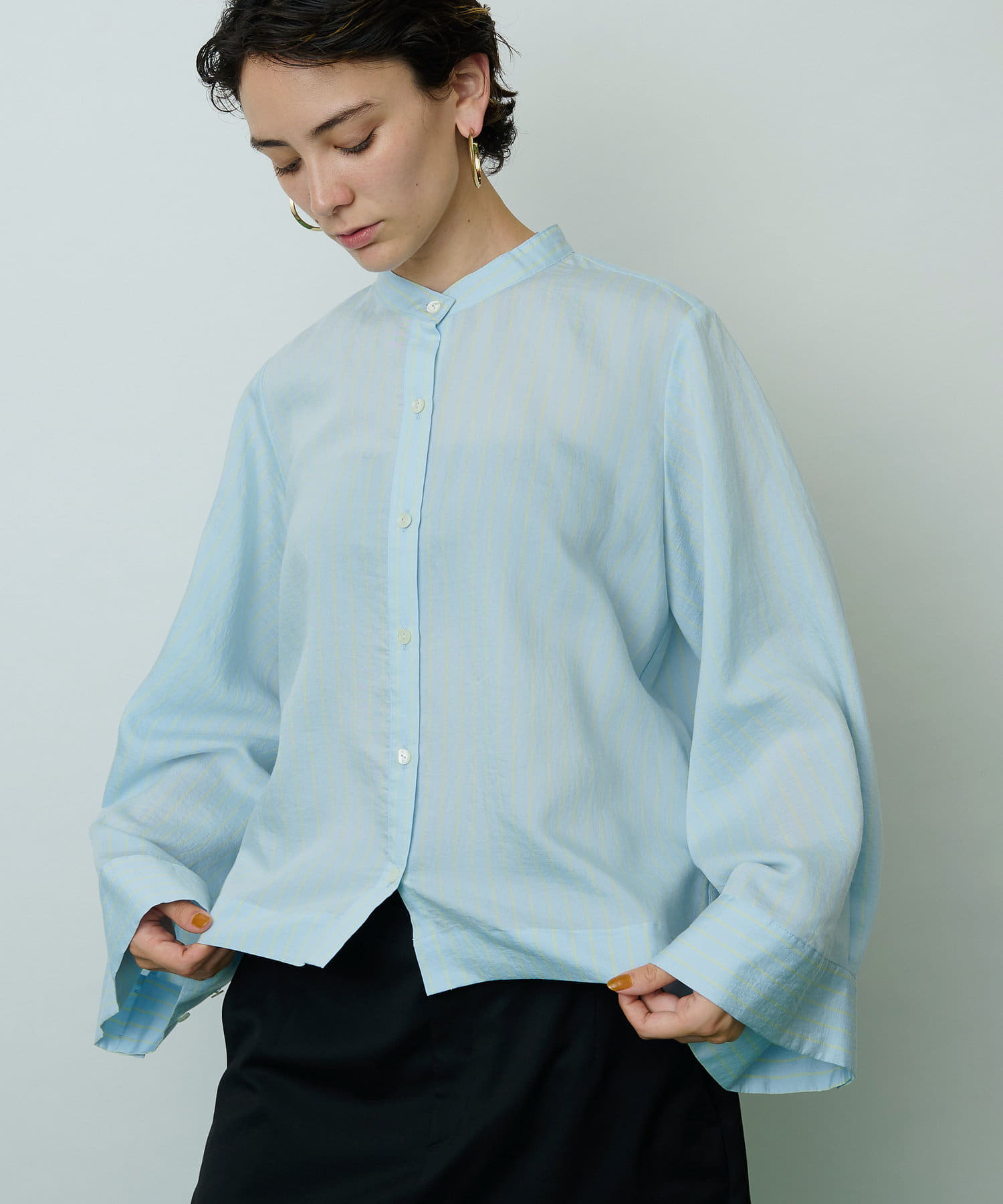 ■袖口に向かって広がるワイドスリーブが特徴的なストライプシャツ。