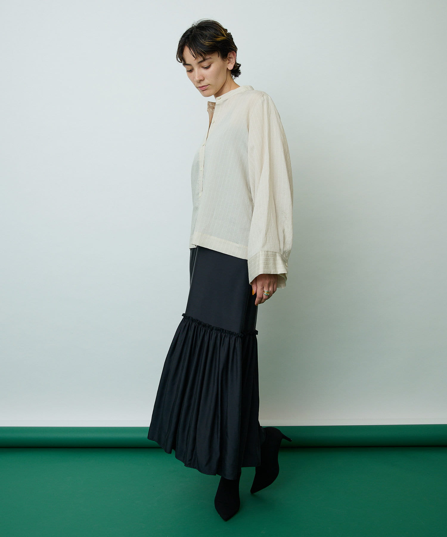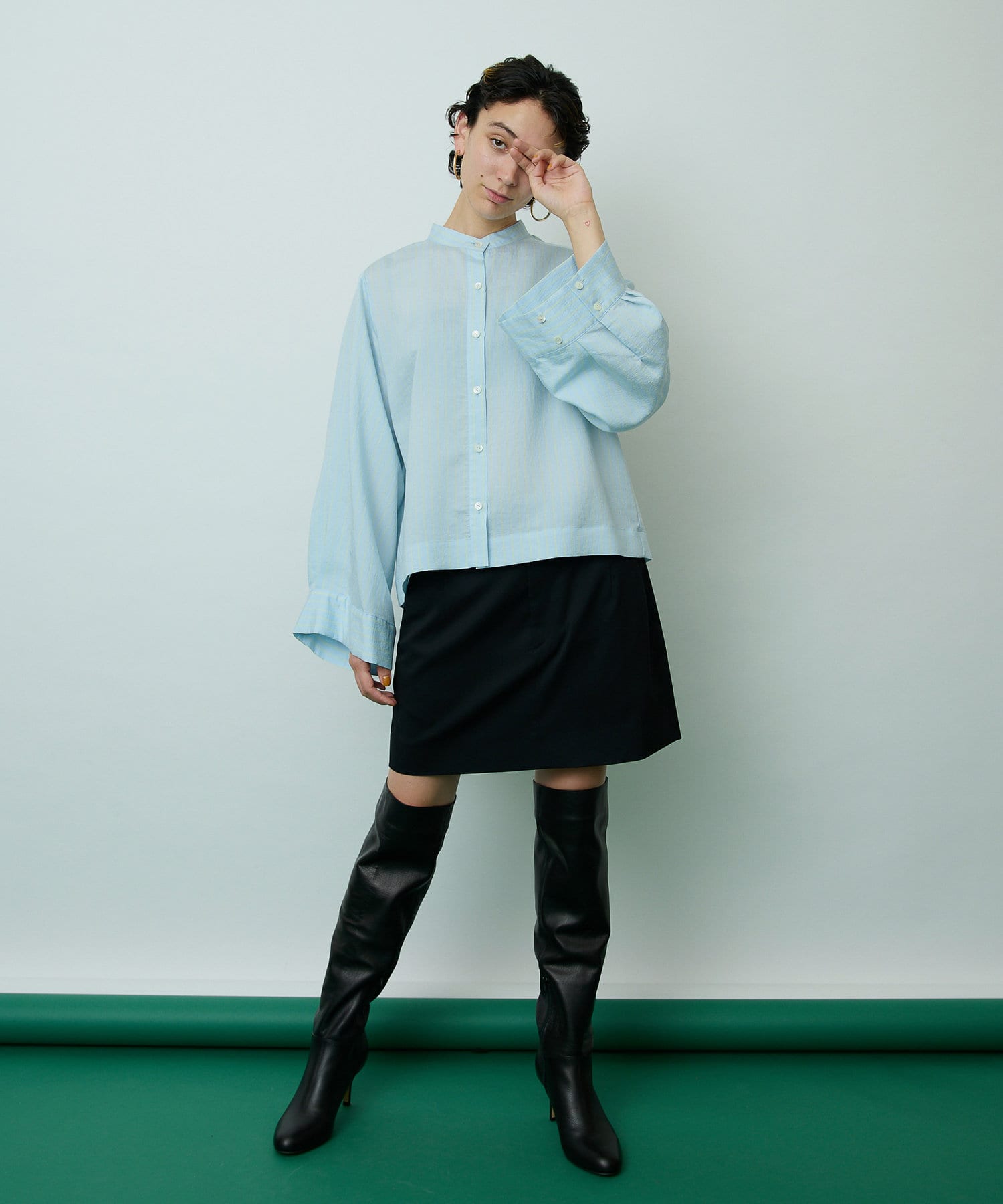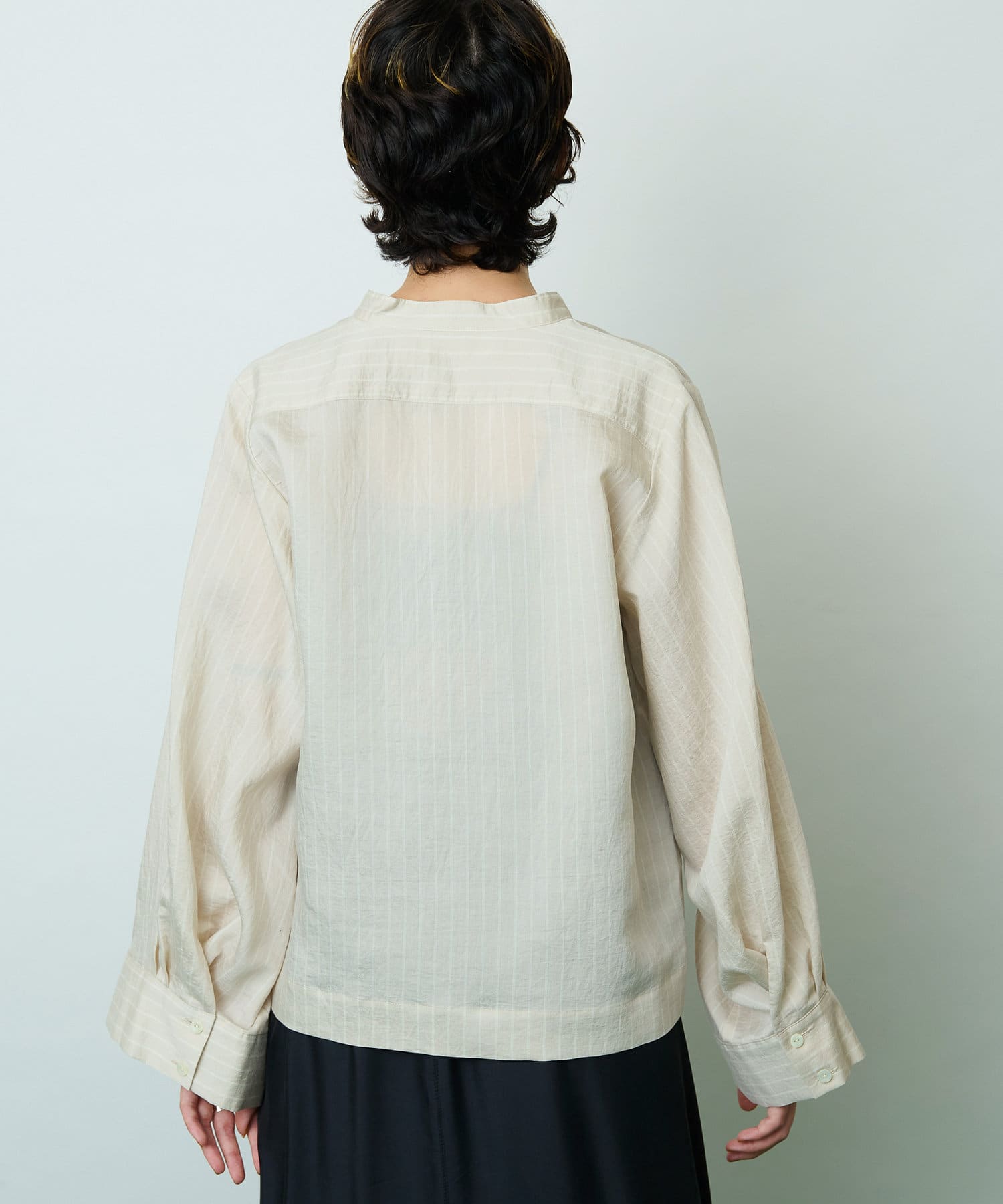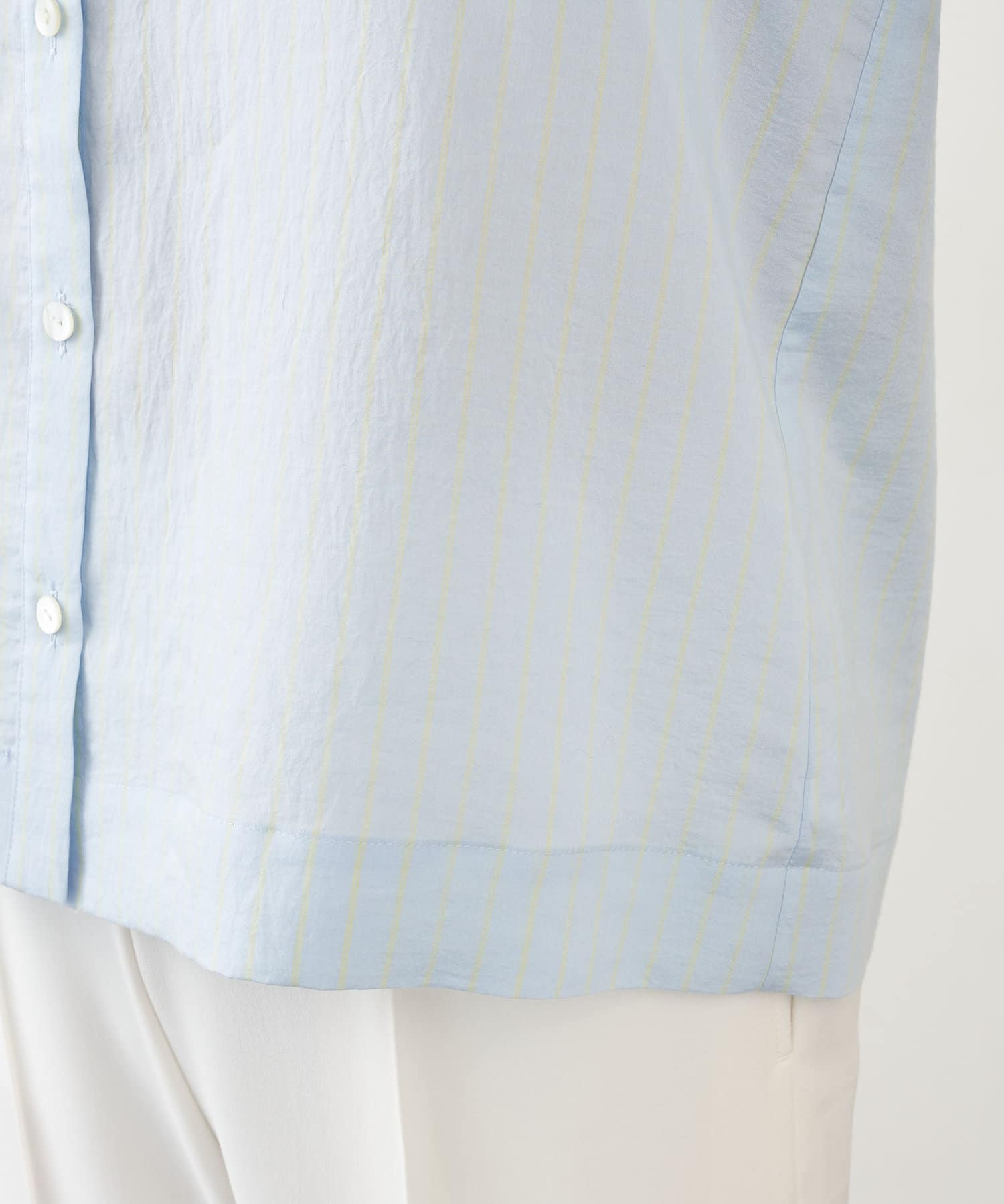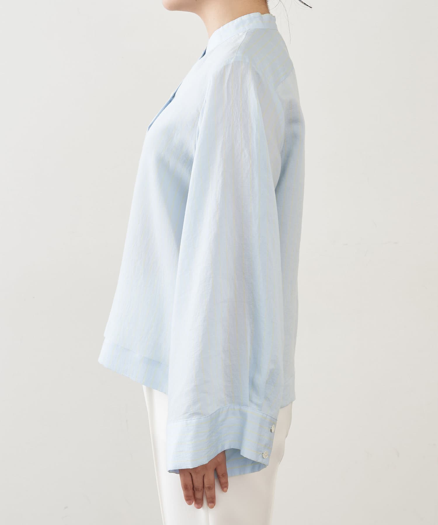 ■袖口に向かって広がるワイドスリーブが特徴的なストライプシャツ。