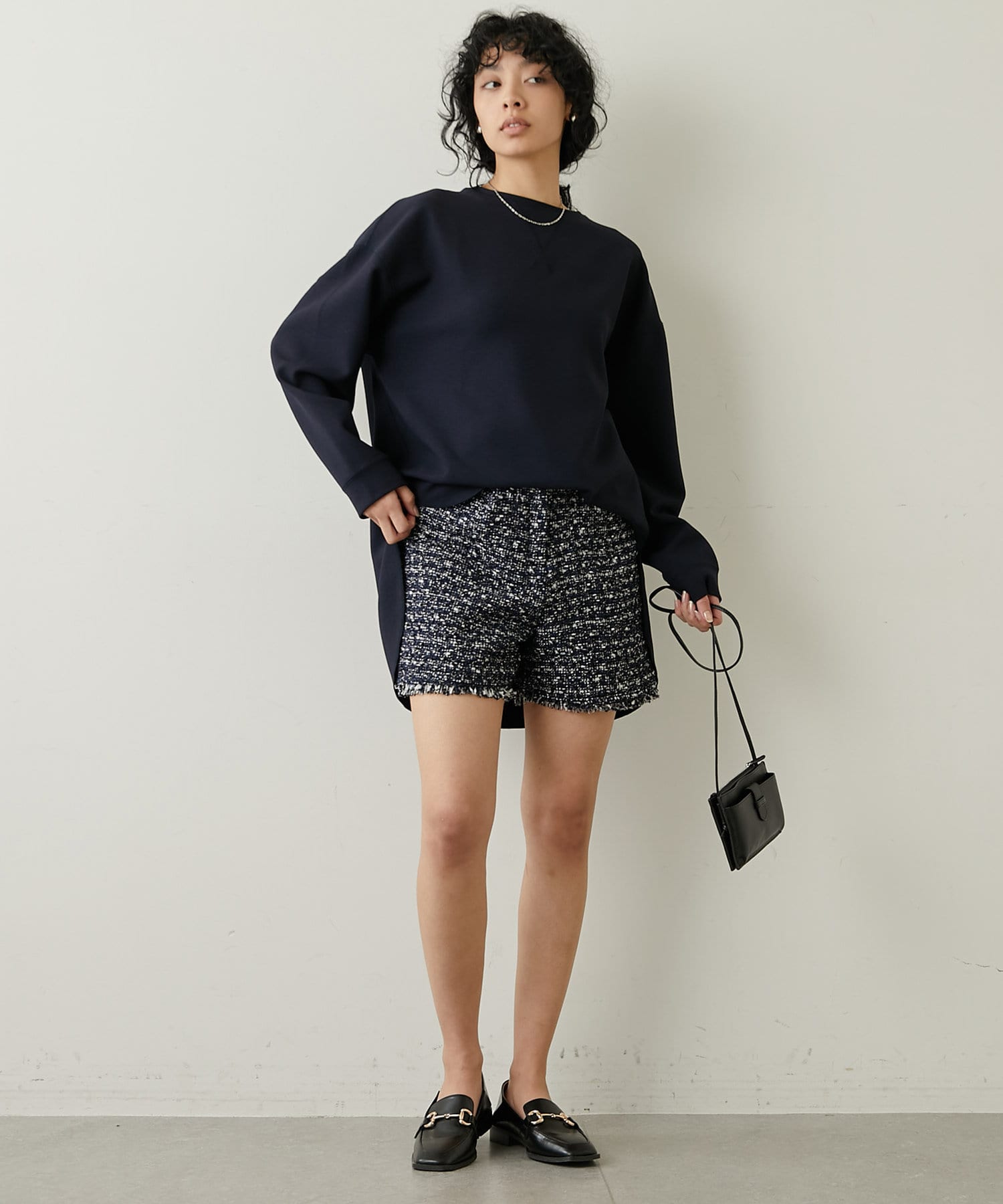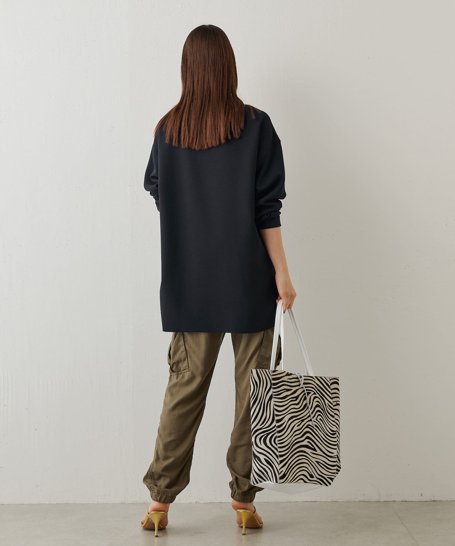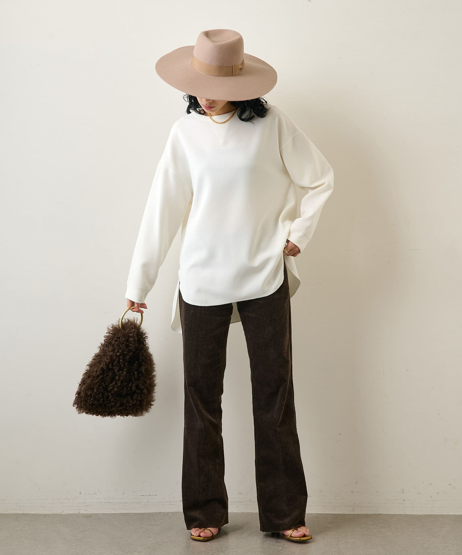 前後の丈の違いがポイントになってパンツにもスカートにも合わせやすいです。