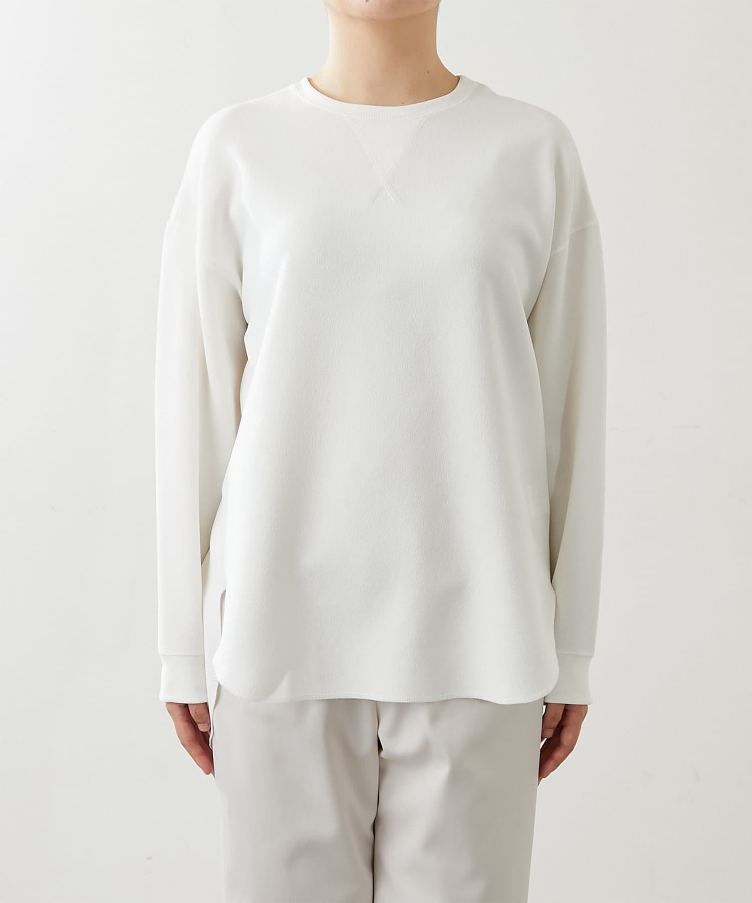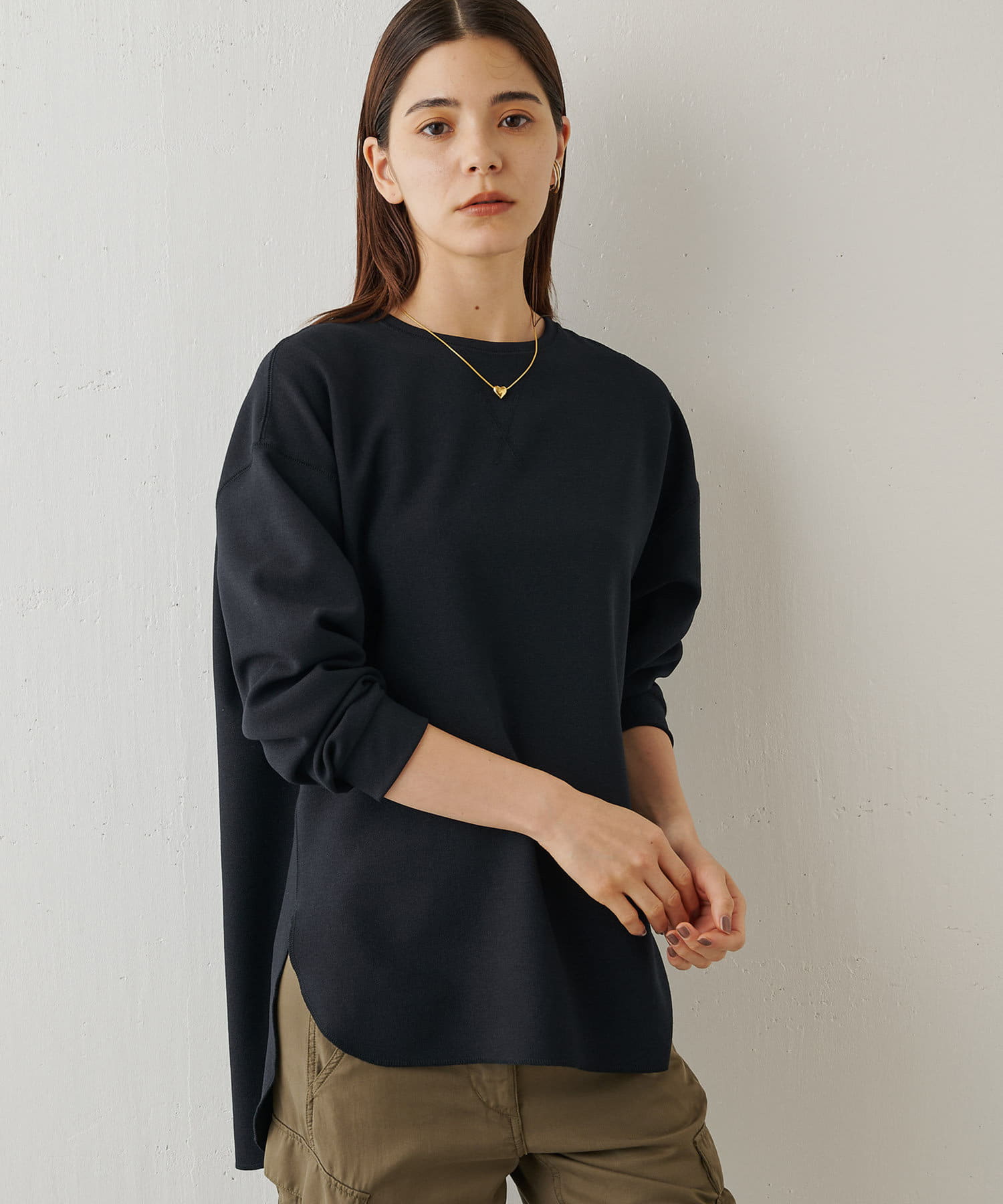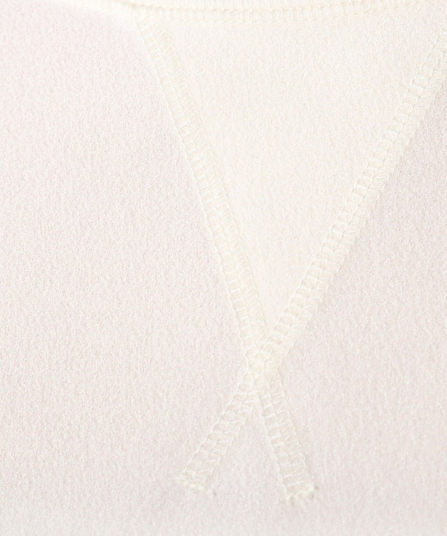 ■Vガゼットを配したコンパクトなクルーネックや、袖口のリブがラフな印象をプラス。